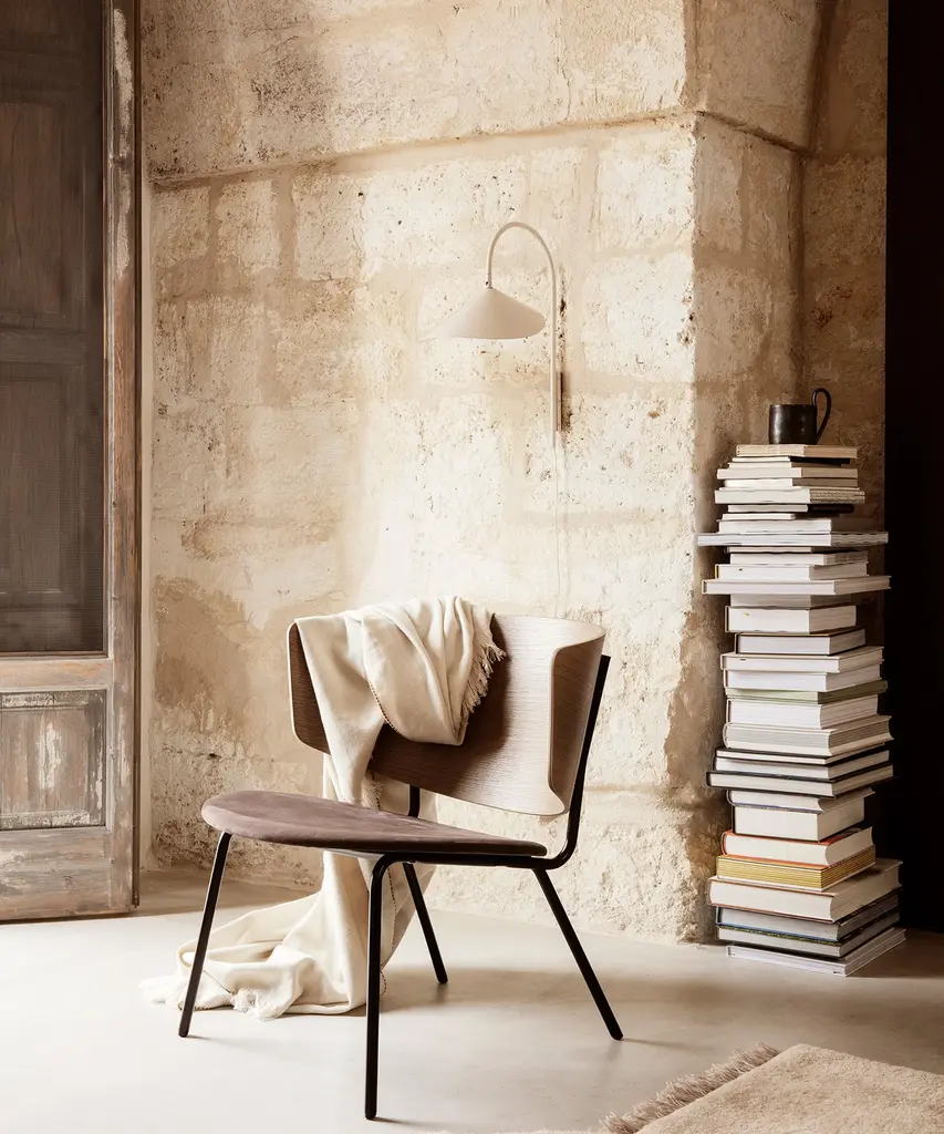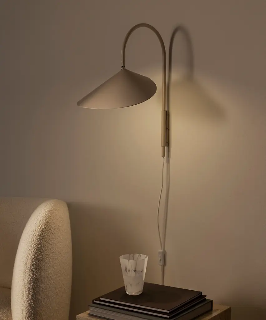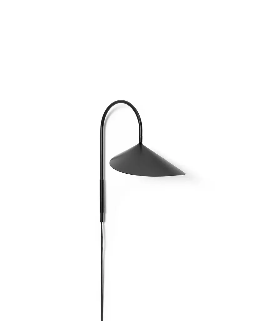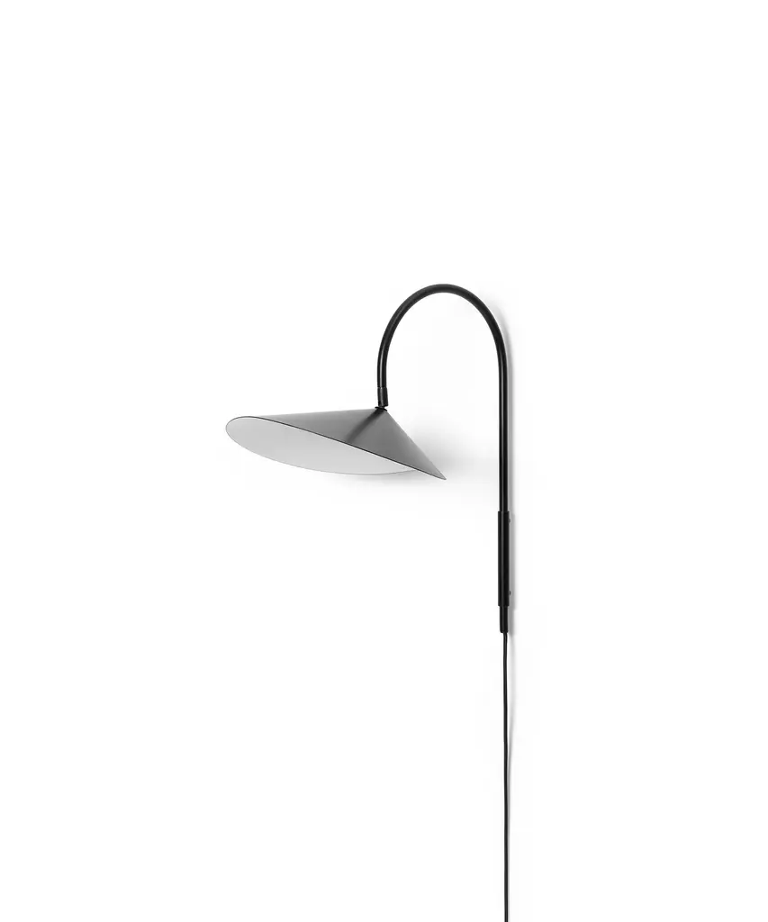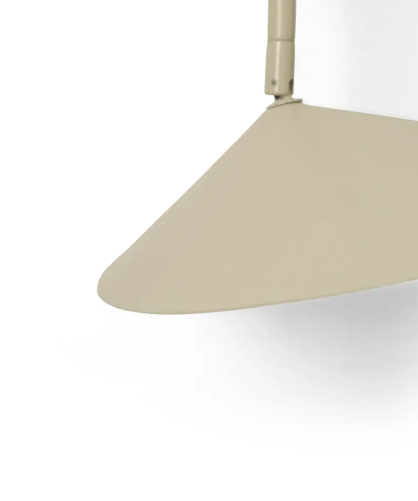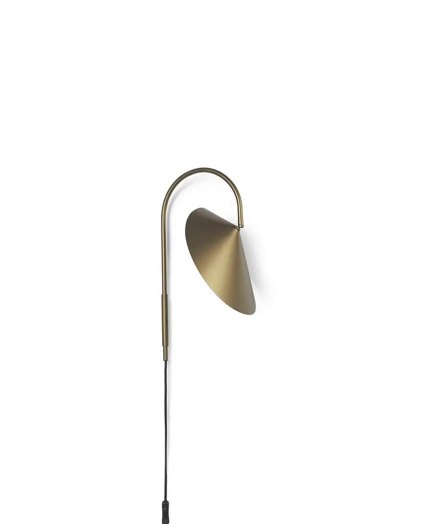 The Arum Wall Lamp is characterised by the organically shaped shade suspended from curved metal arch in a leaf-like manner. With the matte, off-white inside of the shade, the lamp provides a soft, evenly distributed light, and the lampshade can be adjusted to ensure optimal light conditions in all situations. The lamp is delivered with a wall bracket, so it is easy to mount on a wall. Designed and produced by the Copenhagen-based studio Ferm Living.