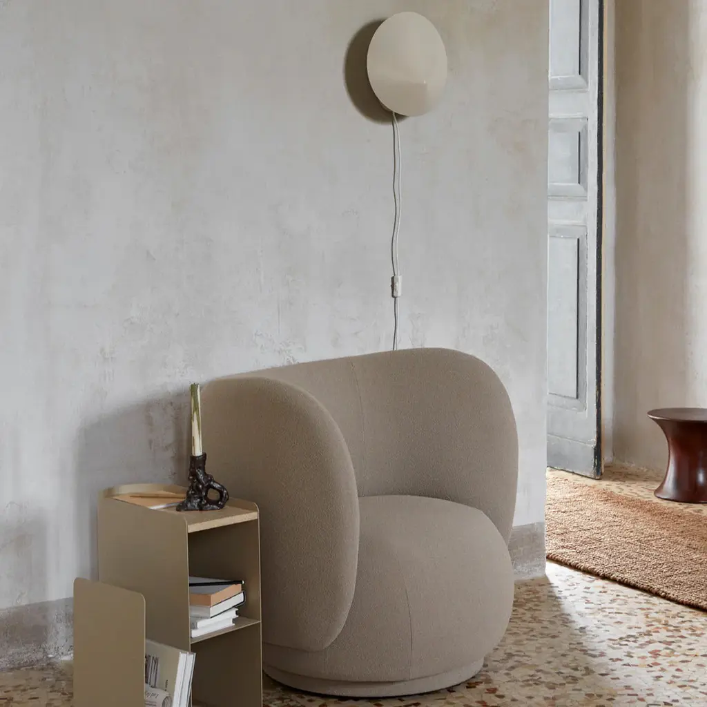 The Arum Wall Sconce is characterised by an organic shape that is elegantly suspended from a curved metal arch in a leaf-like manner. With the matte, off-white inside of the shade, the lamp provides a soft, evenly distributed light. The lampshade can be tilted up or down, ensuring that the Arum Wall Sconce will provide optimal light in all situations. The lamp includes a fabric cord with a switch and comes with a wall bracket, making it is easy to mount the Arum Wall Sconce on your desired wall.