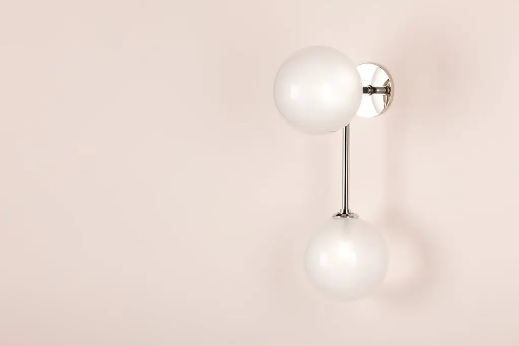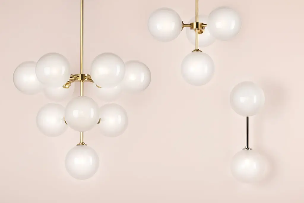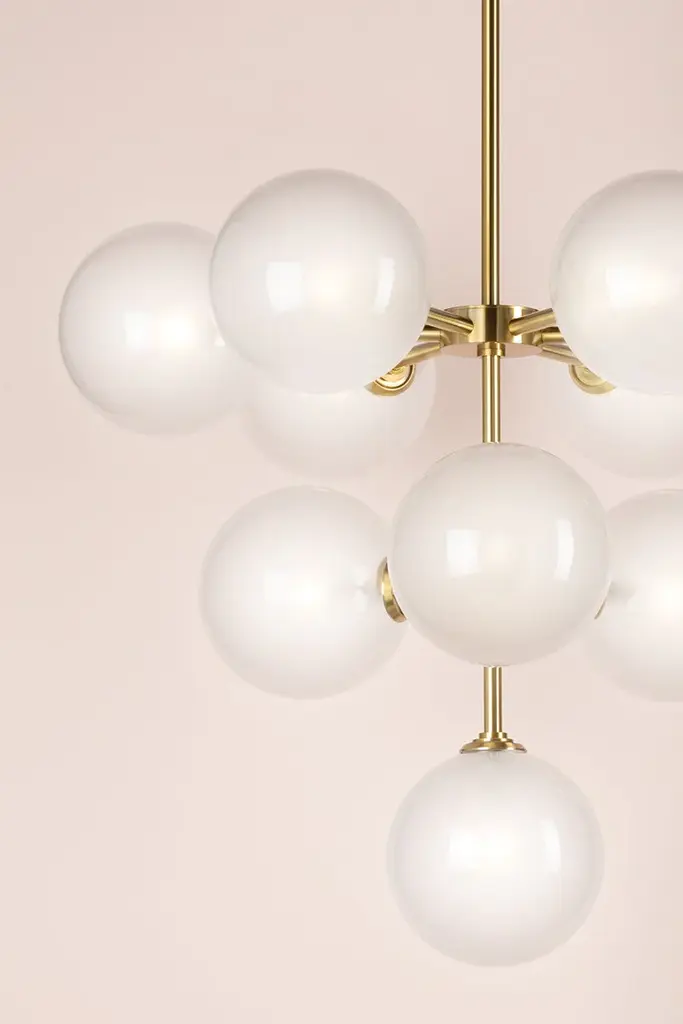 A mid-century muse, Ashleigh marries clean lines and bubbly forms for a striking style that elevates any space. Exaggerated shades feature an etched glossy finish, diffusing the light ever so slightly. A midpoint between clear and milk glass, the glossy globes lend a beautiful luster that pops against the metallic finish. Available as a chandelier, wall sconce, and flush mount in aged brass or polished nickel.