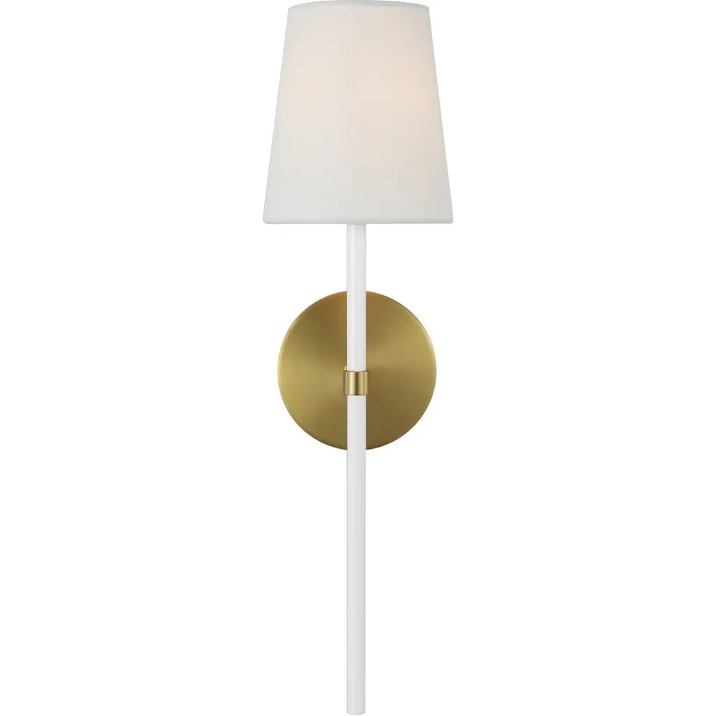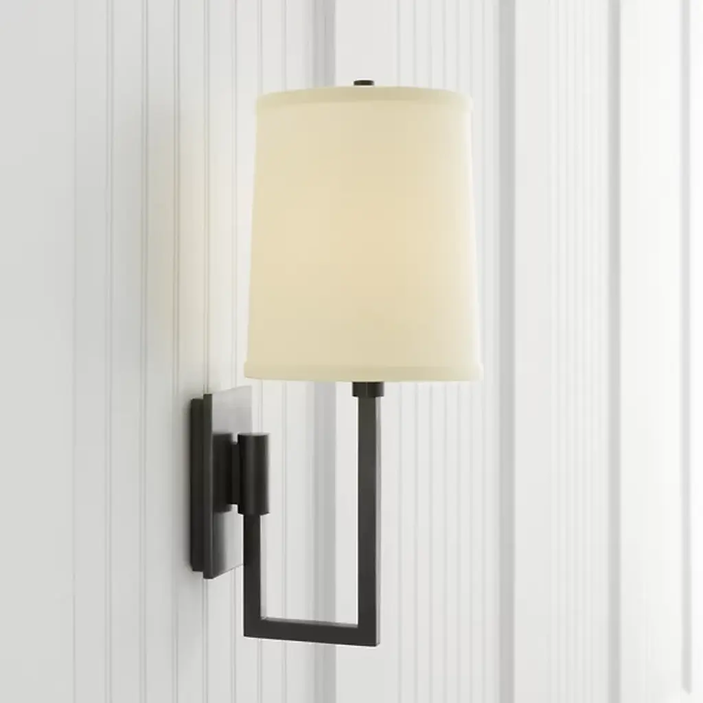 With straight lines and abrupt angles, the Aspect Library Sconce by Visual Comfort Signature, formerly known as Visual Comfort, conveys a subtle strength in personality. These features are found in the fixture’s support stem which extends from a rectangular wallplate and bends upward to a seamless Ivory Linen shade. The shade’s soft, rounded appearance and warm ambient lighting serve as a decorative point of contrast, bringing intrigue as well as illumination to the surrounding décor.