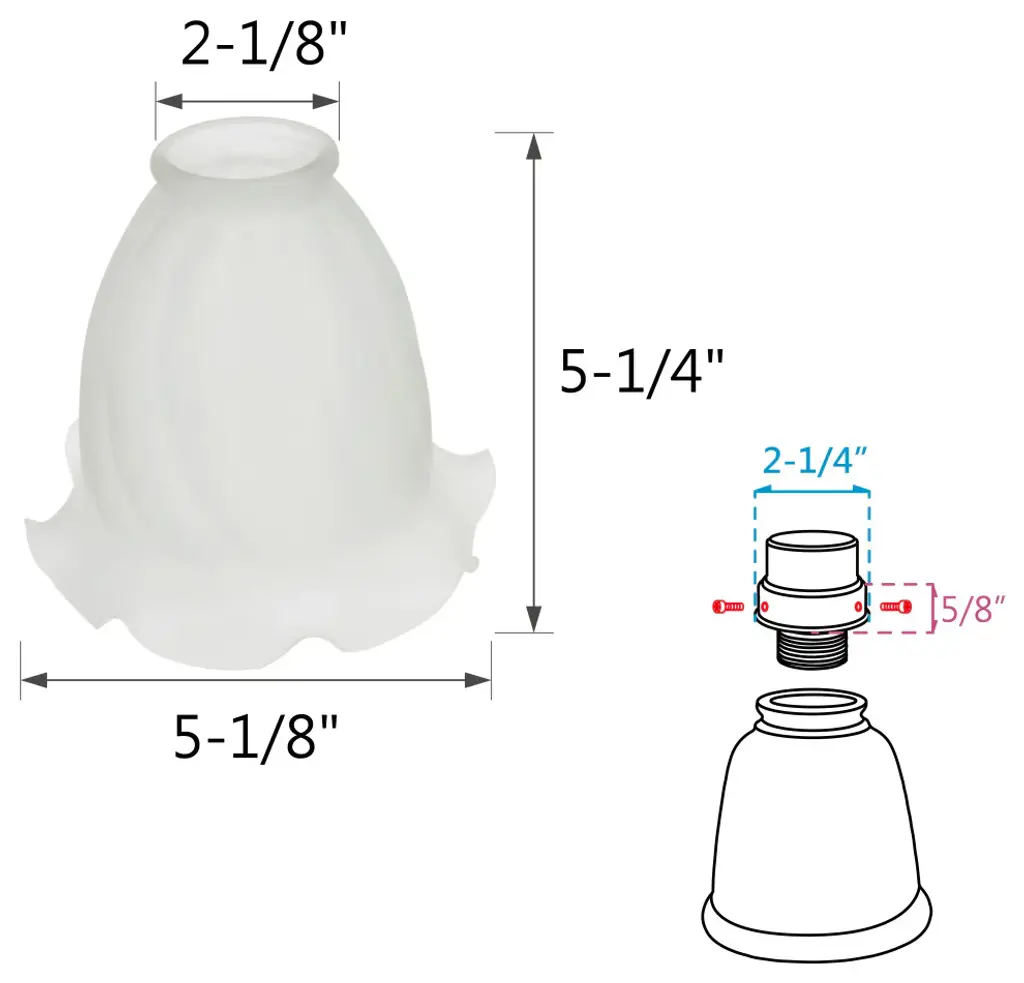 Aspen Creative is dedicated to offering a wide assortment of attractive and well-priced portable lamps, kitchen pendants, vanity wall fixtures, outdoor lighting fixtures, lamp shades, and lamp accessories. We have in-house designers that follow current trends and develop cool new products to meet those trends. Product Detail• Aspen Creative replacement frosted floral glass, 4 pack• 2 1/4" fitter size, 5 1/4" high x 5 1/4" diameter• Replacement glass for ceiling fan light kits, bath wall fixtures and wall sconces that require a 2 1/4" fitter• Upgrade and / or change the look for your fixtures with an easy to glass change