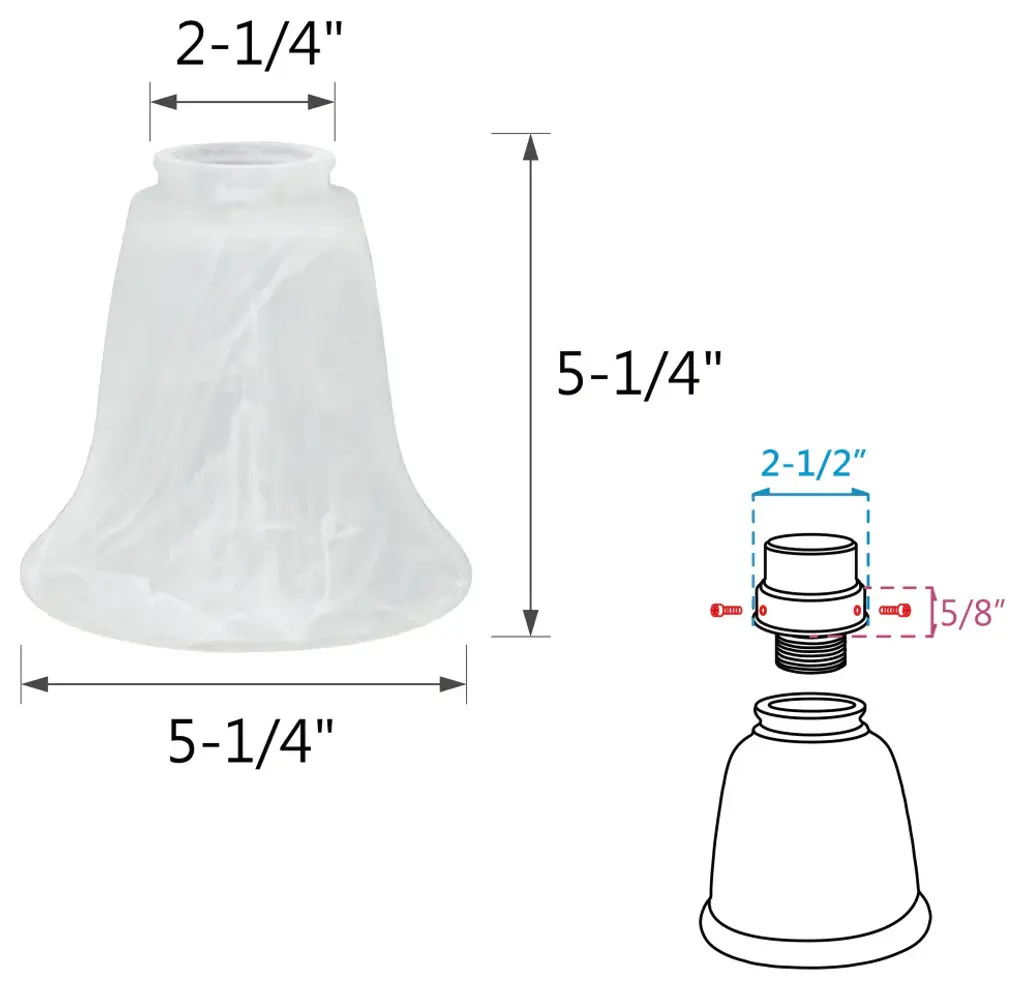 Aspen Creative is dedicated to offering a wide assortment of attractive and well-priced portable lamps, kitchen pendants, vanity wall fixtures, outdoor lighting fixtures, lamp shades, and lamp accessories. We have in-house designers that follow current trends and develop cool new products to meet those trends. Product Detail• Aspen Creative replacement bell shaped alabaster glass shades, 4 pack• 2 1/4" fitter size, 5 1/4" high x 5 1/4" diameter• Replacement glass for ceiling fan light kits, bath wall fixtures and wall sconces that require a 2 1/4" fitter• Upgrade and / or change the look for your fixtures with an easy to glass change