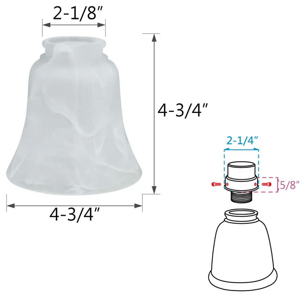 Aspen Creative is dedicated to offering a wide assortment of attractive and well-priced portable lamps, kitchen pendants, vanity wall fixtures, outdoor lighting fixtures, lamp shades, and lamp accessories. We have in-house designers that follow current trends and develop cool new products to meet those trends. Product Detail• Aspen Creative replacement bell shaped alabaster glass shades, 4 pack• 2 1/4" fitter size, 4 3/4" high x 4 3/4" diameter• Replacement glass for ceiling fan light kits, bath wall fixtures and wall sconces that require a 2 1/4" fitter• Upgrade and / or change the look for your fixtures with an easy to glass change