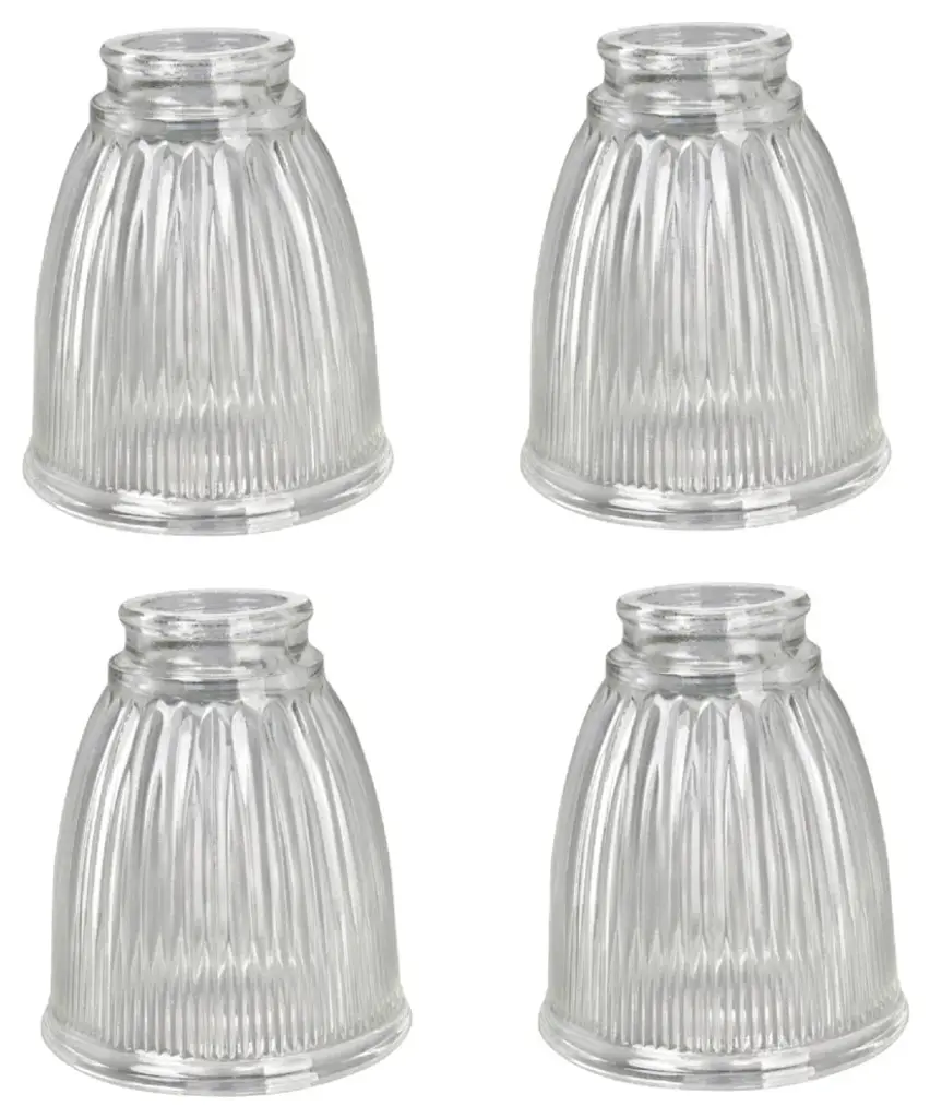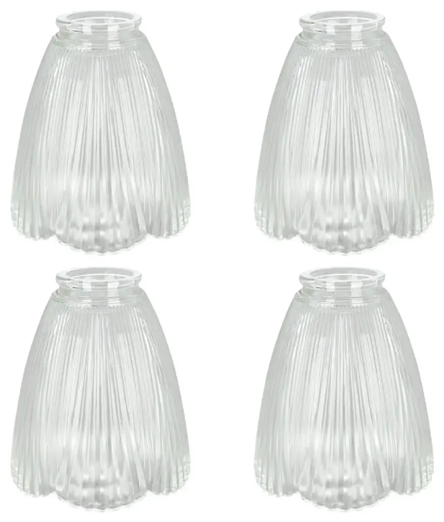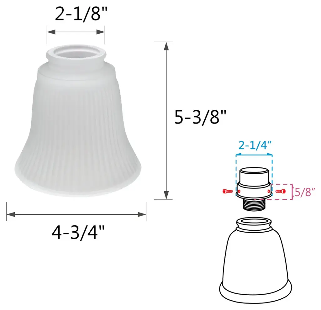 Aspen Creative is dedicated to offering a wide assortment of attractive and well-priced portable lamps, kitchen pendants, vanity wall fixtures, outdoor lighting fixtures, lamp shades, and lamp accessories. We have in-house designers that follow current trends and develop cool new products to meet those trends. Product Detail• Aspen Creative replacement frosted ribbed glass shades, 4 pack• 2 1/4" fitter size, 4 5/8" high x 4 3/4" diameter• Replacement glass for ceiling fan light kits, bath wall fixtures and wall sconces that require a 2 1/4" fitter• Upgrade and / or change the look for your fixtures with an easy to glass change