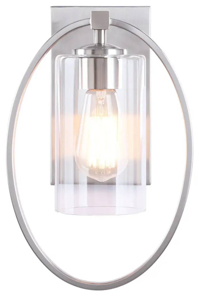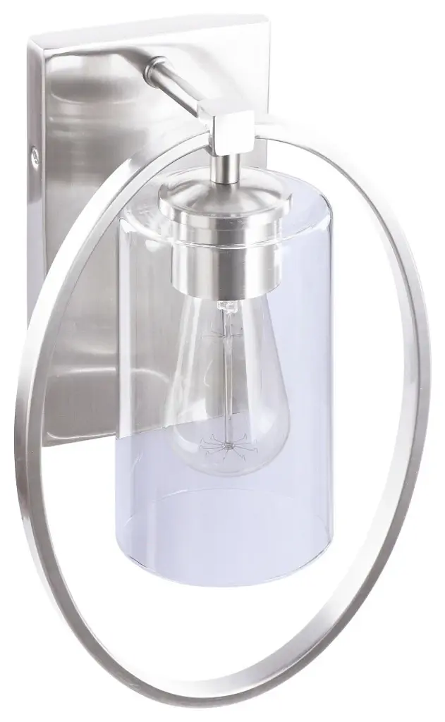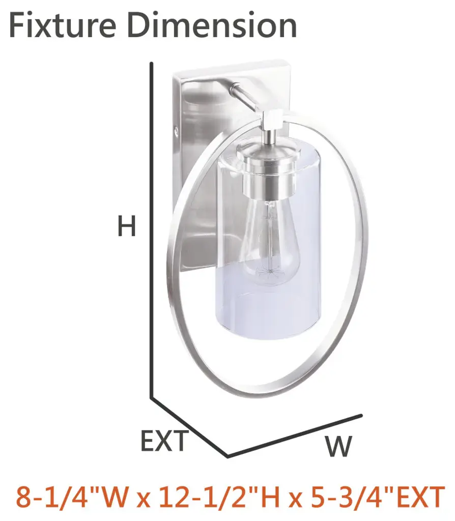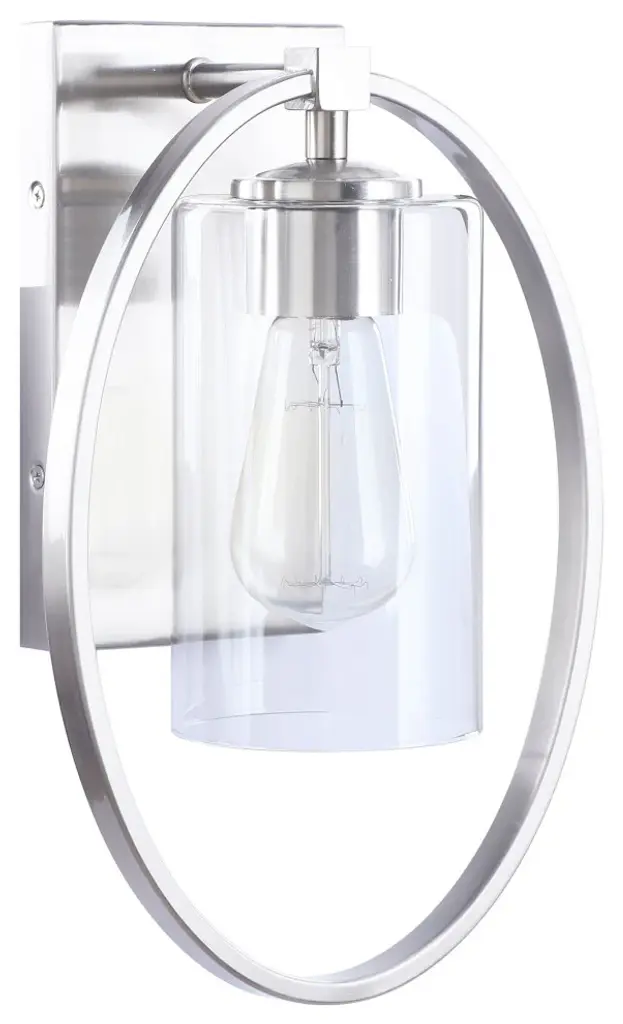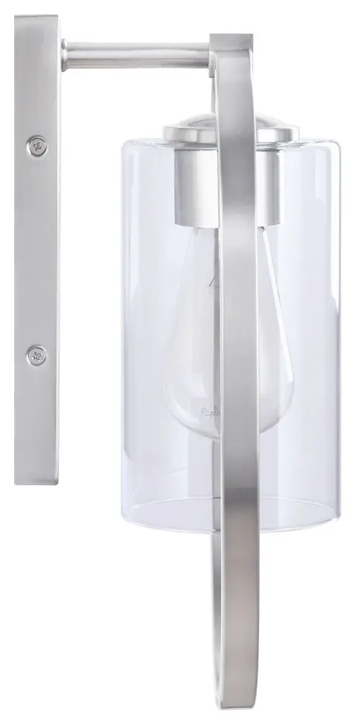 Aspen Creative offers a 1 light bathroom vanity wall light fixture in satn nickel. Fixture dimensions 5 3/4" Deep x 8 1/4" Width x 12 1/2" Height. Backplate dimensions 7/8" Deep x 4 1/2" Width x 8" Height. Requires 1 type A - 60 watt E26 medium base light bulb (not included). Includes clear glass cylinder shade. Shade dimensions 3 3/4" Width x 6 5/8" Height. UL listed for bathroom wall installation above the mirror and vanity cabinet as well as powder rooms and makeup rooms. It can also be installed as a wall sconce in living room, family rooms and hallways.
