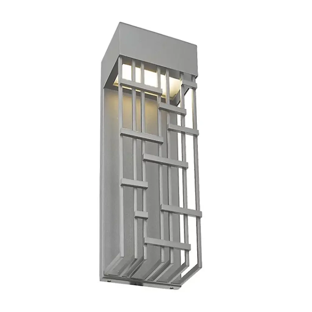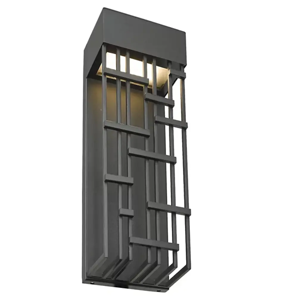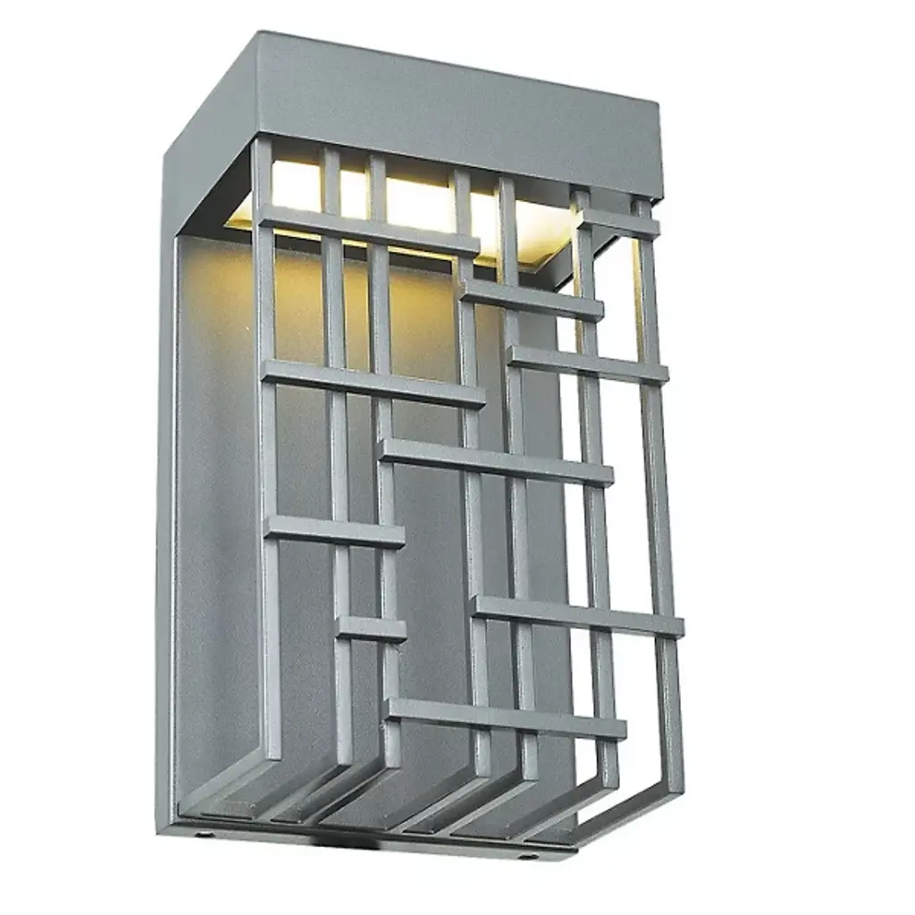 The Aspen LED Outdoor Wall Sconce by Abra Lighting offers a simple design with added structural intrigue. Built from durable, weather-resistant steel, this rectangular fixture boasts a series of bars with intersecting accents to create a staggered grid effect. Permeating through its cage is a soft light that glows from its integrated, energy-efficient LED light module. A frosted glass diffuser sits flush within the fixture’s hood, creating an elegant display of Dark Sky-compliant light.