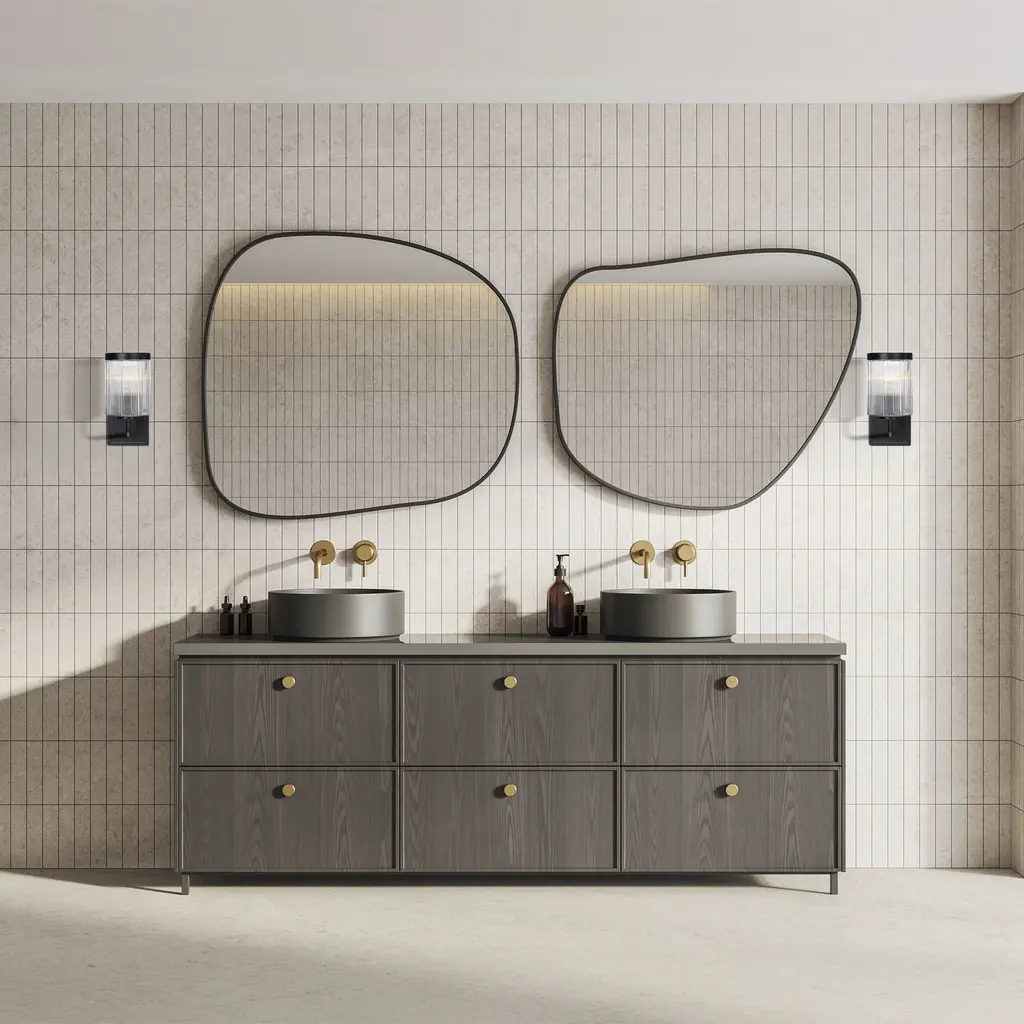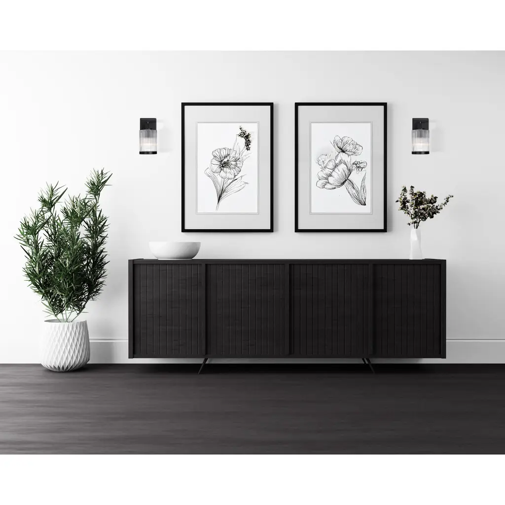 The Aspen bath and vanity collection from Designers Fountain combines modern, industrial, and glam influences to create an elegant collection worthy of any bathroom. The sleek matte black finish and clear ribbed glass shades will complement nearly any interior decor. With the flexibility to mount these pieces with the shades either facing up or down, the possibilities to enhance your spaces double Aspen is easy to install, with all instructions and mounting/wiring hardware included right in the box.