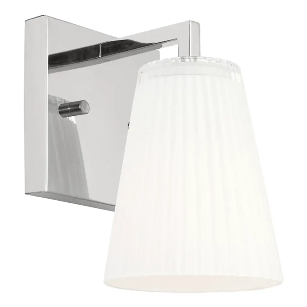 A timeless piece of functional decor, this wall lamp will elegantly complement a contemporary interior especially if matched to another design from the same series. Fashioned of chromed brass, the structure features a round plate and an exquisite arm shaped like a candle holder, topped with a precious white grosgrain fabric shade, holding an E14 LED lightbulb (max 40W).