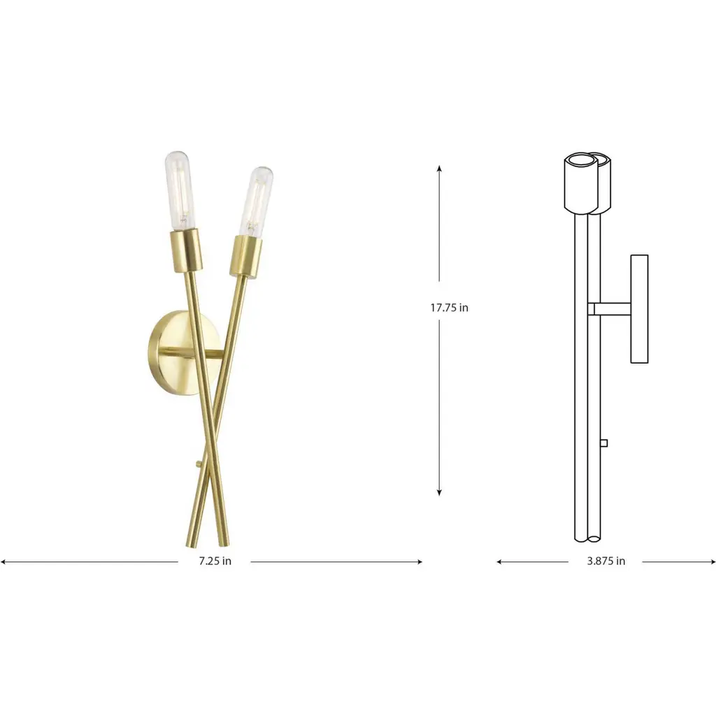 The Astra wall bracket features a space-age-inspired design perfect for modern and mid-century decor. A pair of elongated arms are held by a round backplate, bringing a dynamic flair to the fixture's design. A lovely satin brass finish adds a touch of soft glamour. Decorative bulbs (sold separately) adorn the ends of each perpendicular arm. This versatile wall bracket is ideal for bringing illumination to dining rooms, kitchens and bedrooms. This fixture is part of the Progress Lighting Design Series, a lighting collection offering fashionable styles and affordable luxury lighting for the home.
