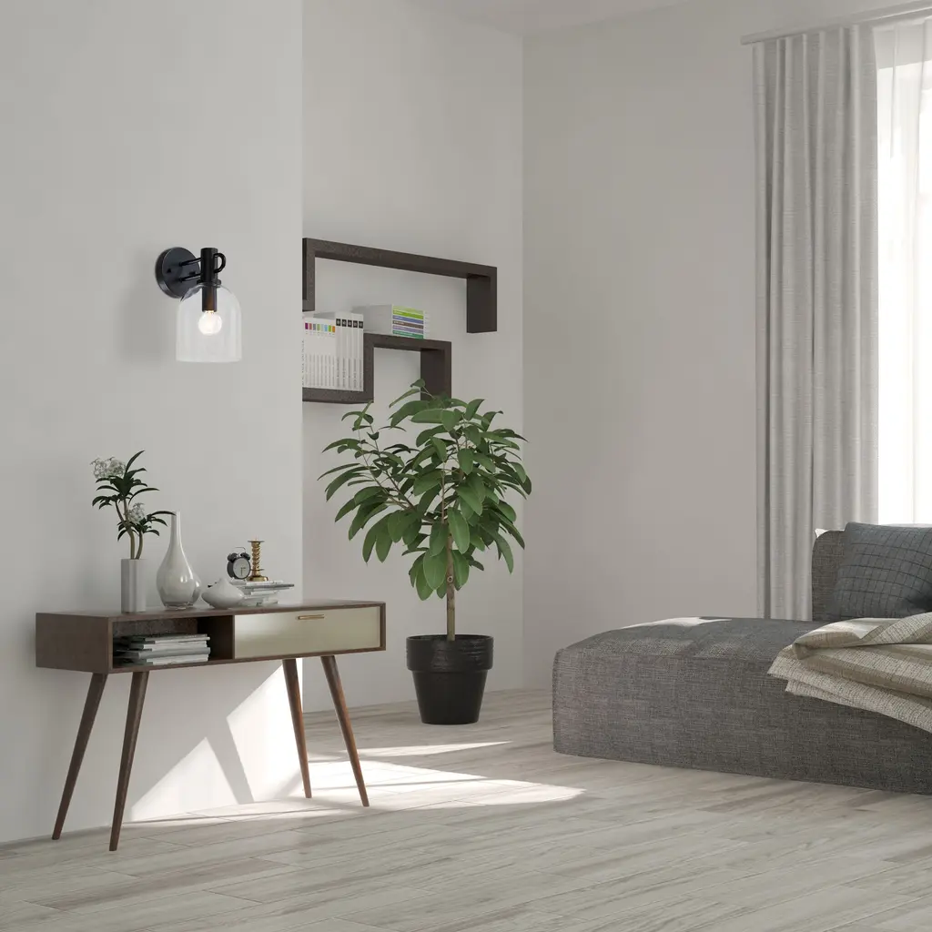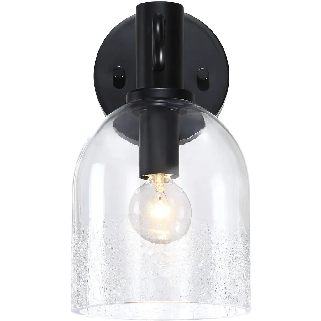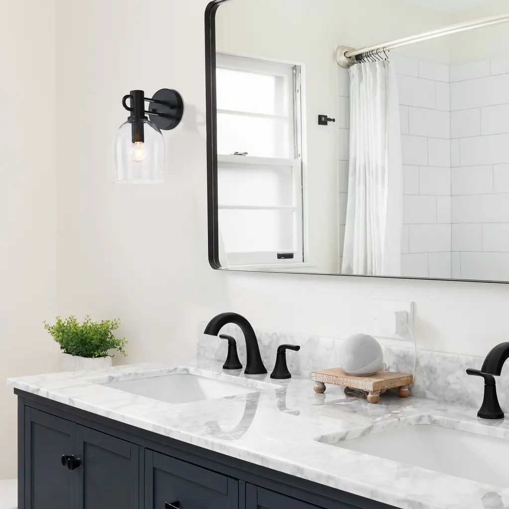 The Astra family from Designers Fountain boasts a new clear ice glass shade - similar to gradient ohmbre finishes and painting techniques. This modern and industrial family comes in a sleek matte black finish and will complement many interior design schemes and ideas. Enjoy Astra in bedrooms, bathrooms, living areas, and other spaces in your home that need some extra accent lighting. This collection is easy to install, with instructions and mounting/wiring hardware included right in the box.