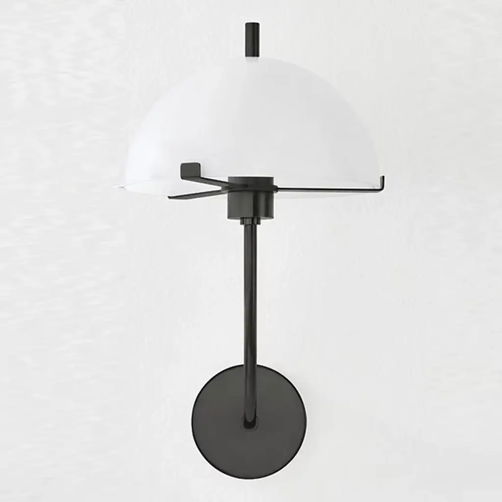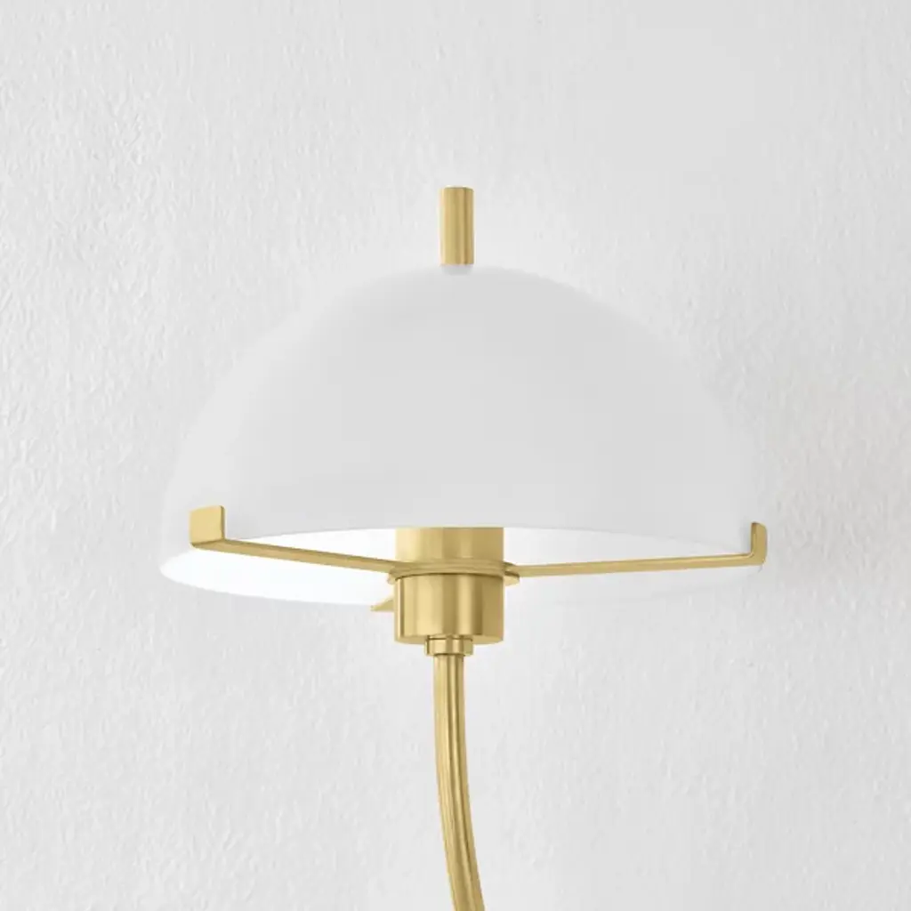 The Atala Wall Sconce from Mitzi is a retro mushroom design that charms. It features an elegant, elongated arm capped by a generous dome shade. This Mid-Century Modern-inspired fixture features a graceful curve that radiates confidence while casting a pleasant, welcoming glow. Adorned with distinctive, angular arms that resemble jewelry clasps, the design brings a decorative flair to its otherwise simple design. The layered shade and smooth metal enhance a bathroom space or add an elegant accent to contemporary spaces.