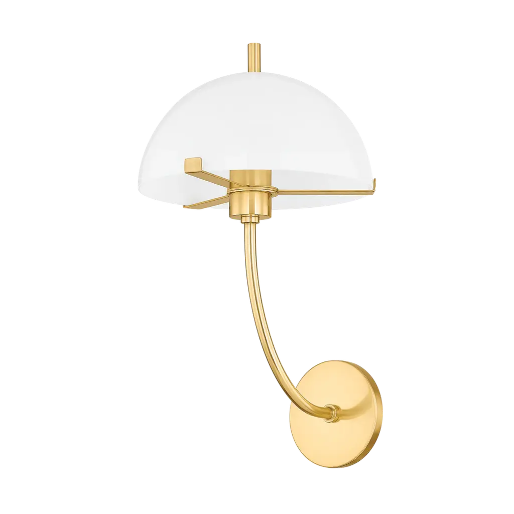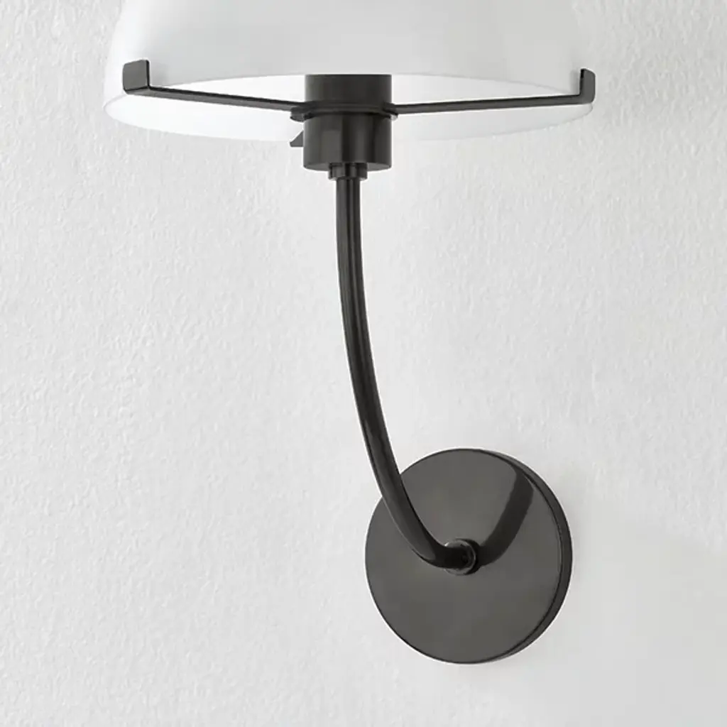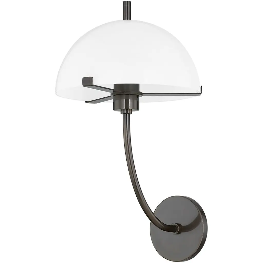 The Atala Wall Sconce from Mitzi is a retro mushroom design that charms. It features an elegant, elongated arm capped by a generous dome shade. This Mid-Century Modern-inspired fixture features a graceful curve that radiates confidence while casting a pleasant, welcoming glow. Adorned with distinctive, angular arms that resemble jewelry clasps, the design brings a decorative flair to its otherwise simple design. The layered shade and smooth metal enhance a bathroom space or add an elegant accent to contemporary spaces.