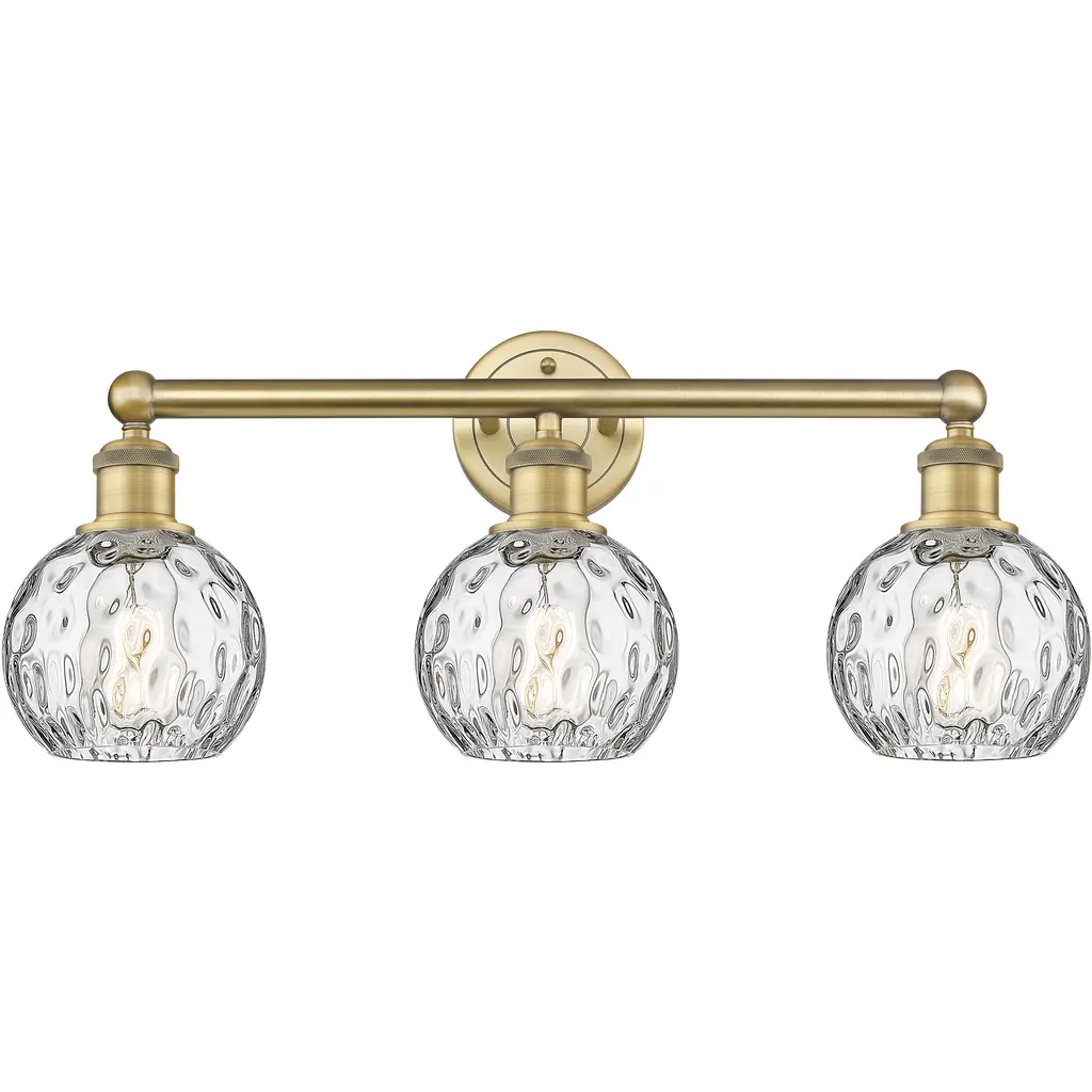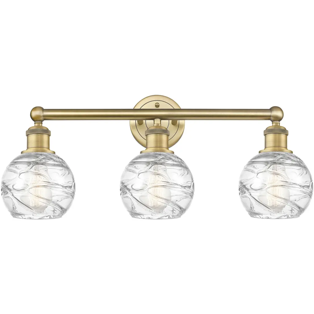 INNOVATIONS 616-3W-AB-G1213-8 Athens Deco Swirl 3 26 inch Bath Vanity Light Antique Brass. Style: Industrial, Modern Contempo, Restoration-Vintage, Transitional . Collection Name: Downtown Urban. Metal Finish(Body): Antique Brass. Material: Steel, Cast Brass, Glass. Dimension(in): 12.125(H) x 26(W) x 8.5(Ext). Bulb: (3)60W Medium Base Incandescent(Not Included). Voltage: 120. Dimmable: Yes. Color Temperature (Kelvin): 2200. Color Rendering Index (CRI): 99.9. Lumens: 220. Life Expectancy (Hours): 2000. Glass Shade Description: Clear Deco Swirl Athens Deco Swirl. Glass Type: Transparent. Shade Shape: Globe/Orb. Glass or Metal Shade Color: Clear Deco Swirl. Shade Material: Glass. Shade Dimension(in): 8(W) x 6.875(H). Fitter Measurement (Glass Or Metal Shade Fitter Size): Neckless with a 1.675 inch opening. ADA Compliant: No. California Proposition 65 Warning Required: Yes. UL/ETL Certification Type: Damp Location.