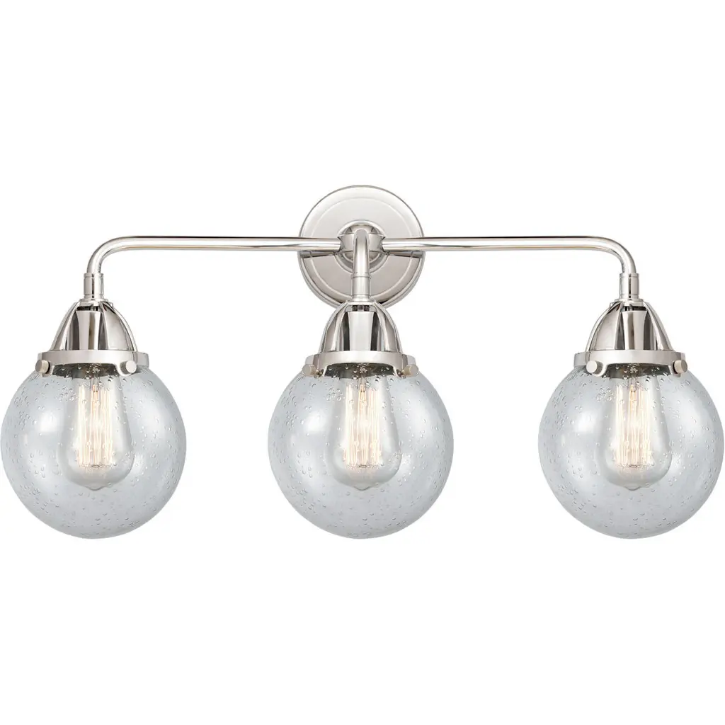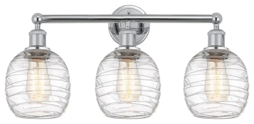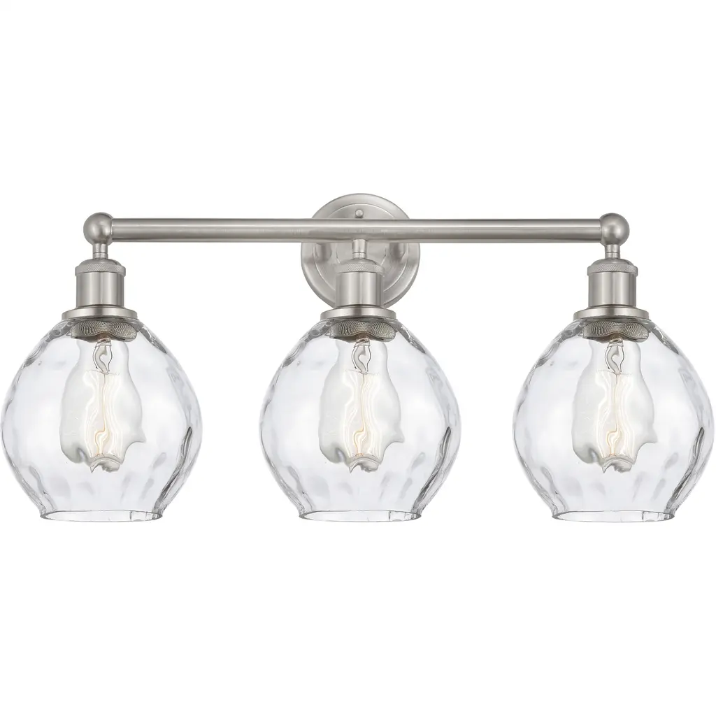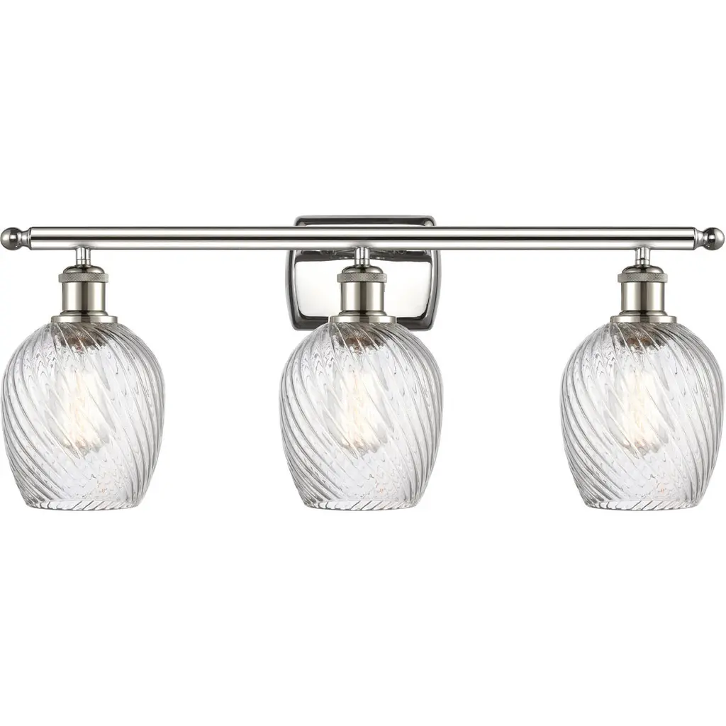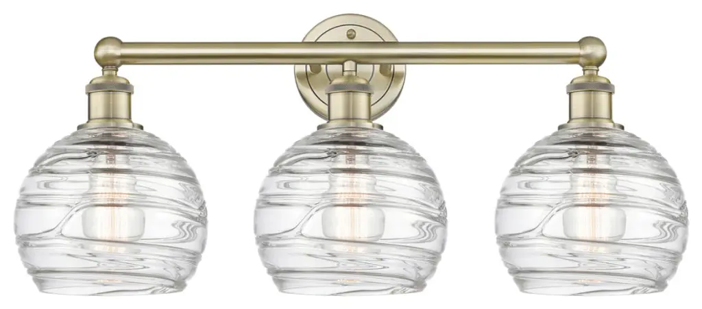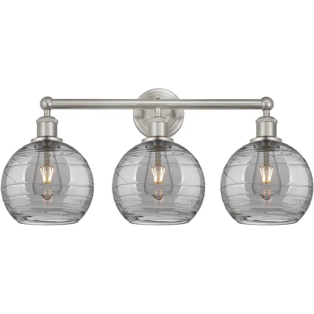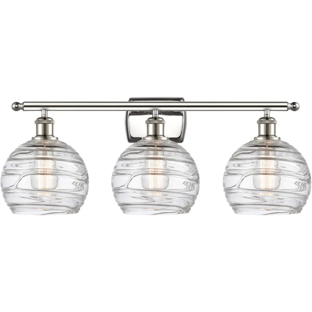 INNOVATIONS 616-3W-PN-G1213-8 Athens Deco Swirl 3 26 inch Bath Vanity Light Polished Nickel. Style: Industrial, Modern Contempo, Restoration-Vintage, Transitional . Collection Name: Downtown Urban. Metal Finish(Body): Polished Nickel. Material: Steel, Cast Brass, Glass. Dimension(in): 12.125(H) x 26(W) x 8.5(Ext). Bulb: (3)60W Medium Base Incandescent(Not Included). Voltage: 120. Dimmable: Yes. Color Temperature (Kelvin): 2200. Color Rendering Index (CRI): 99.9. Lumens: 220. Life Expectancy (Hours): 2000. Glass Shade Description: Clear Deco Swirl Athens Deco Swirl. Glass Type: Transparent. Shade Shape: Globe/Orb. Glass or Metal Shade Color: Clear Deco Swirl. Shade Material: Glass. Shade Dimension(in): 8(W) x 6.875(H). Fitter Measurement (Glass Or Metal Shade Fitter Size): Neckless with a 1.675 inch opening. ADA Compliant: No. California Proposition 65 Warning Required: Yes. UL/ETL Certification Type: Damp Location.