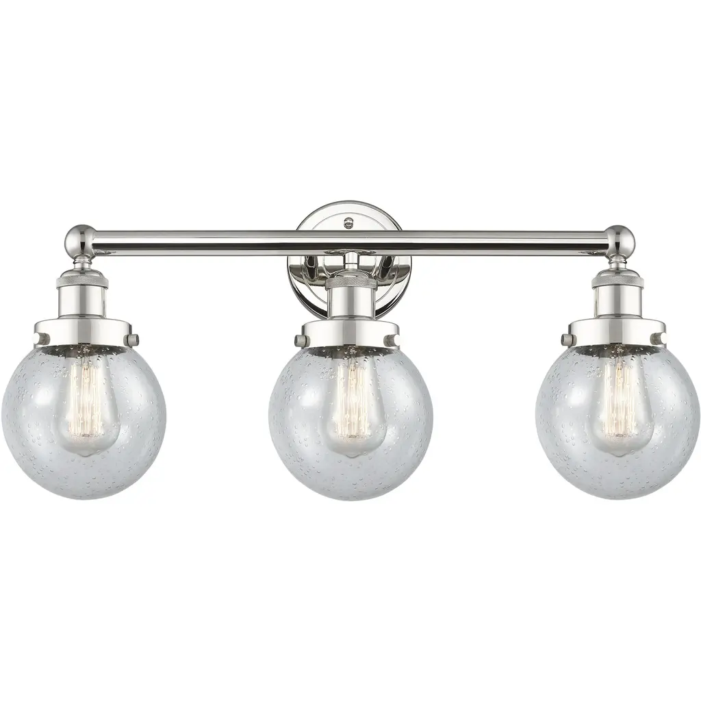 INNOVATIONS 616-3W-PN-G1215-8 Athens Water Glass 3 26 inch Bath Vanity Light Polished Nickel. Style: Industrial, Modern Contempo, Restoration-Vintage, Transitional . Collection Name: Downtown Urban. Metal Finish(Body): Polished Nickel. Material: Steel, Cast Brass, Glass. Dimension(in): 12.25(H) x 26(W) x 8.5(Ext). Bulb: (3)60W Medium Base Incandescent(Not Included). Voltage: 120. Dimmable: Yes. Color Temperature (Kelvin): 2200. Color Rendering Index (CRI): 99.9. Lumens: 220. Life Expectancy (Hours): 2000. Glass Shade Description: Clear Water Glass Athens Water Glass. Glass Type: Transparent . Shade Shape: Globe/Orb. Glass or Metal Shade Color: Clear Water Glass. Shade Material: Glass. Shade Dimension(in): 8(W) x 7(H). Fitter Measurement (Glass Or Metal Shade Fitter Size): Neckless with a 1.75 inch opening. ADA Compliant: No. California Proposition 65 Warning Required: Yes. UL/ETL Certification Type: Damp Location.