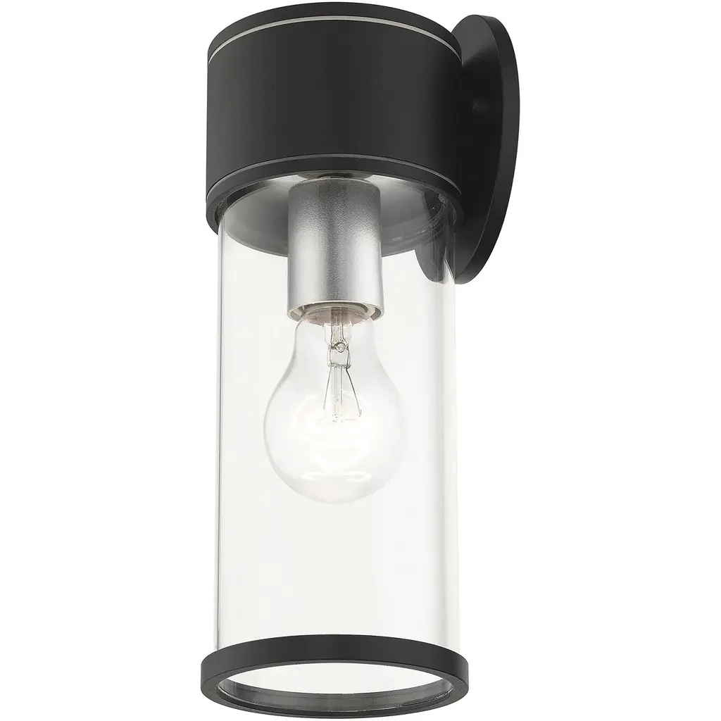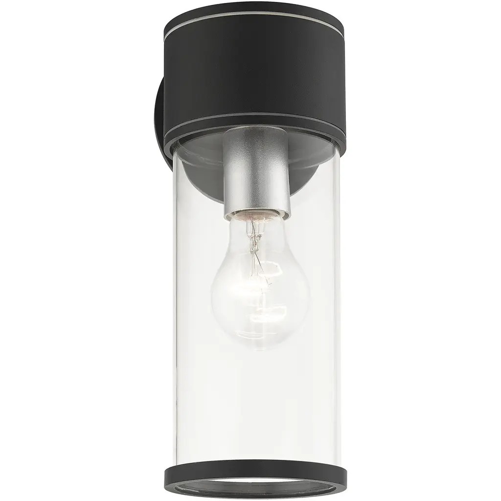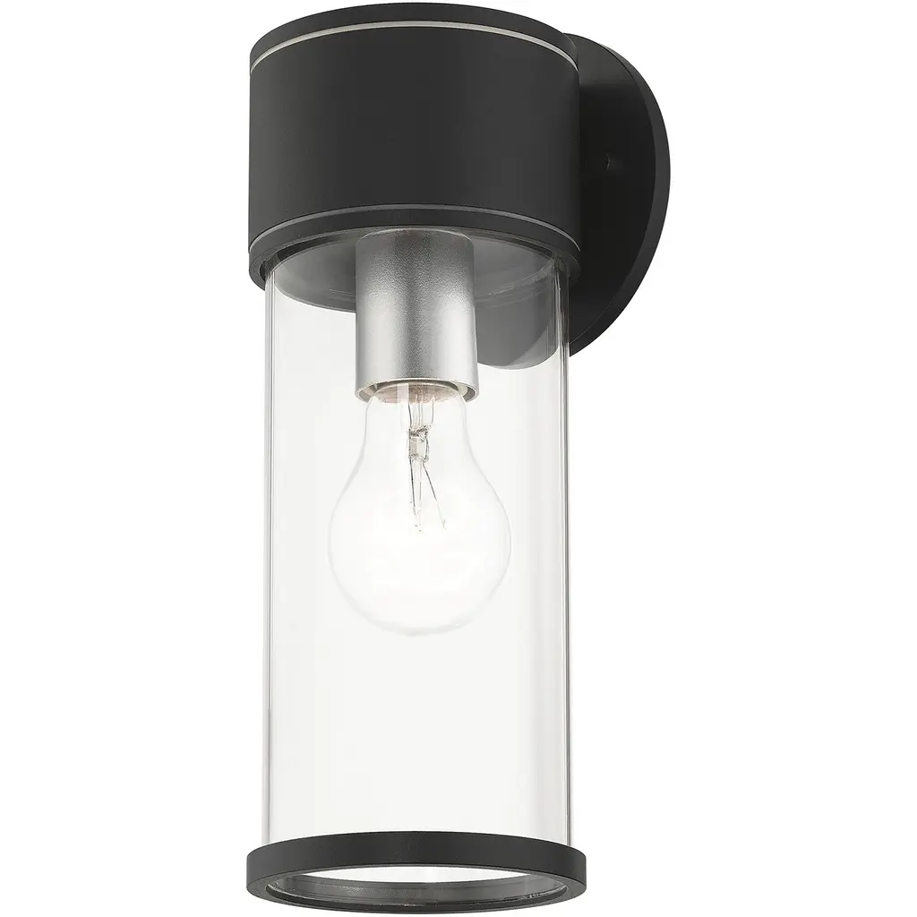1 Light Textured Black Outdoor Medium Wall Lantern with Antique Silver Finish Accents