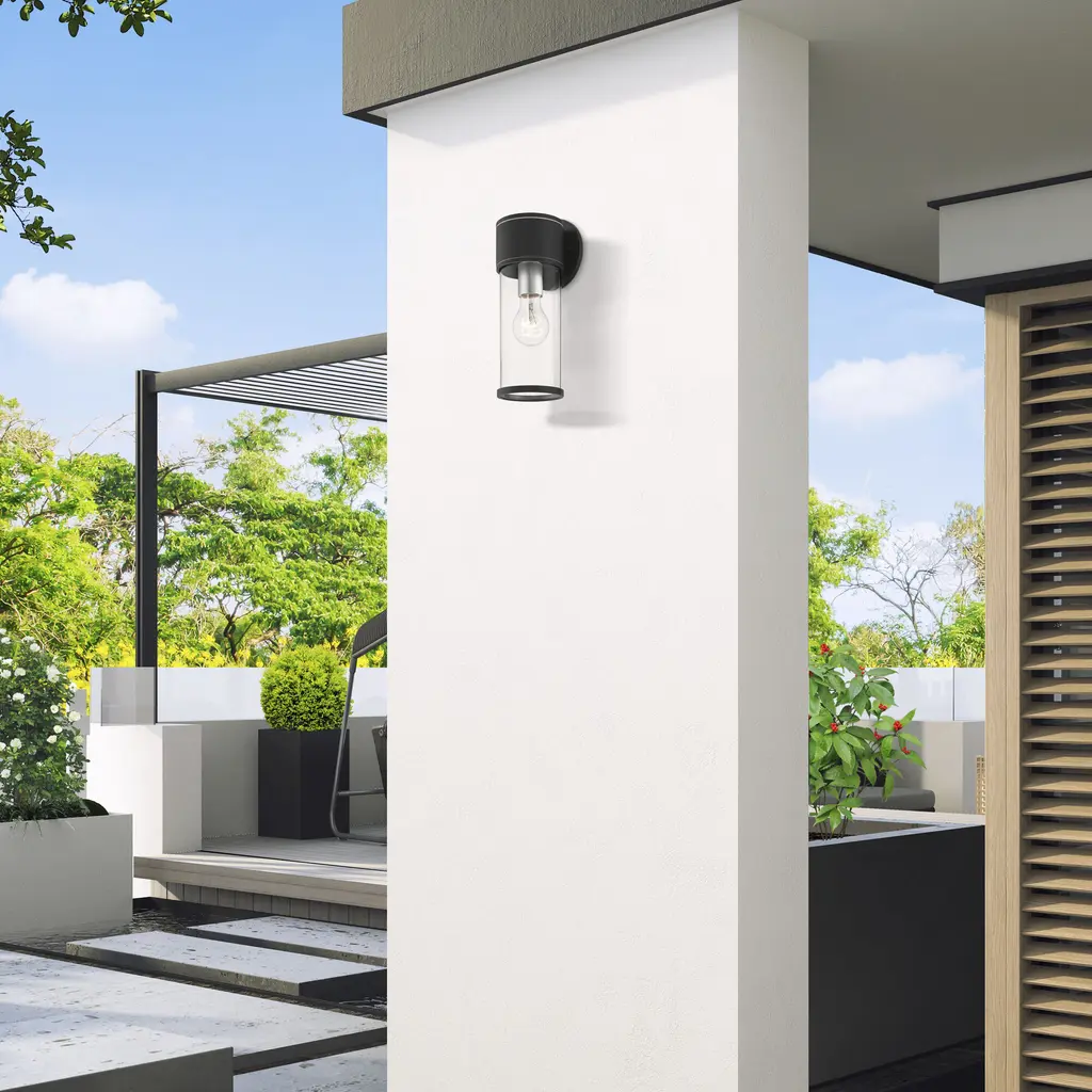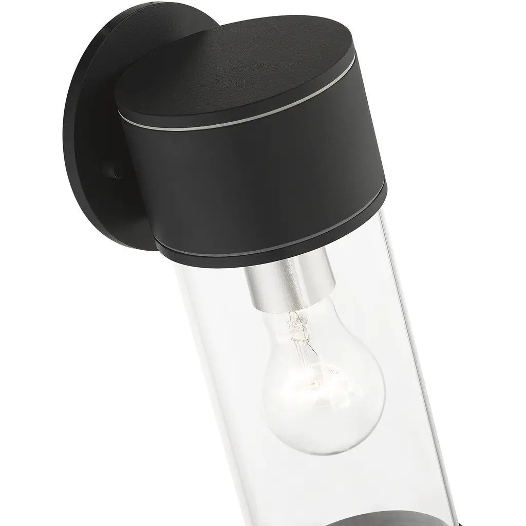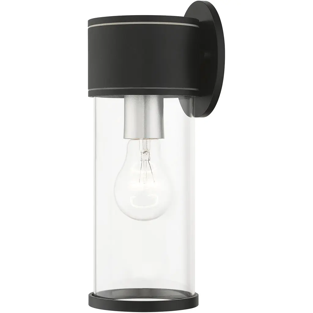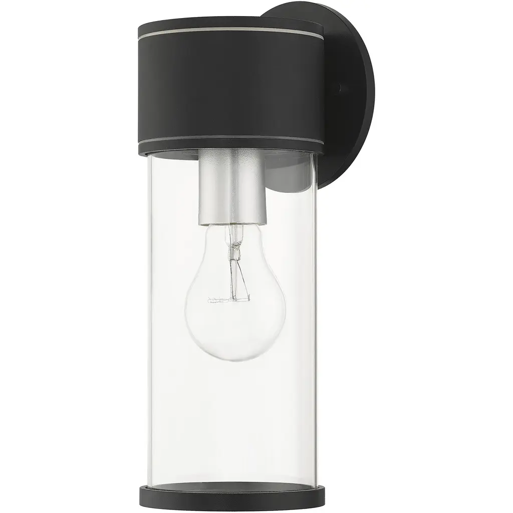 1 Light Textured Black Outdoor Medium Wall Lantern with Antique Silver Finish Accents