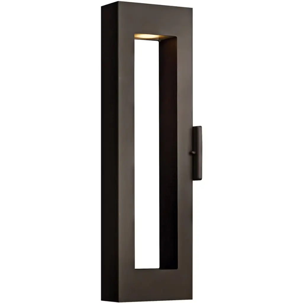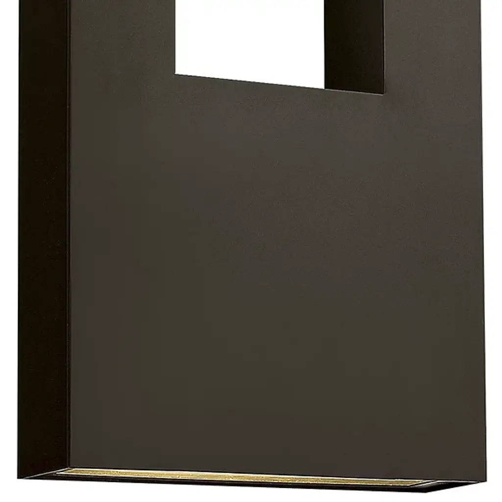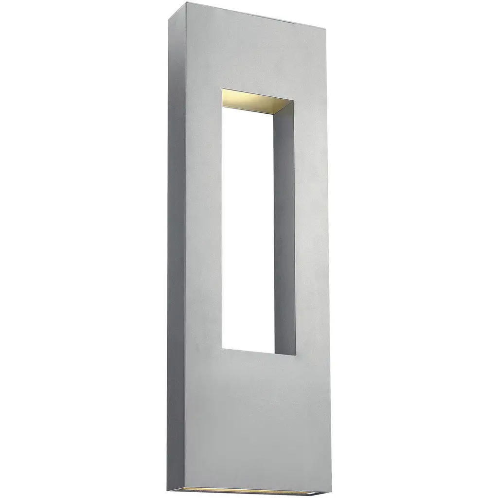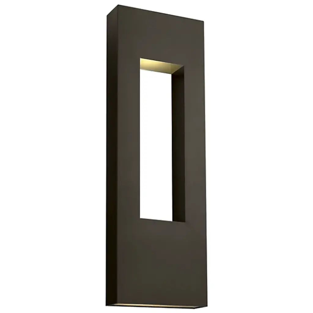 The massive size of the Atlantis Outdoor Extra Large Wall Sconce by Hinkley Lighting gives a strong contemporary impression. Its empty section not only showcases an artistic use of negative space, but also houses 1 of 3 light sources that shine directly down through an etched glass lens. The remaining 2 light sources are located at the base, behind another etched glass lens, and generate a similar downward spill.