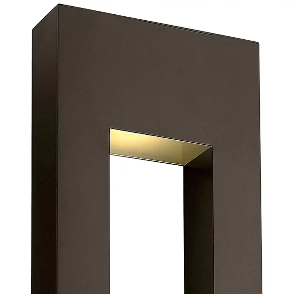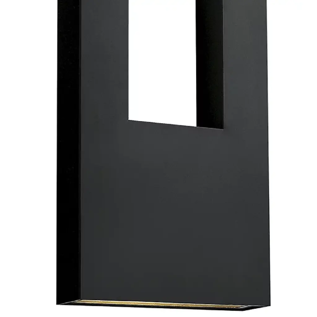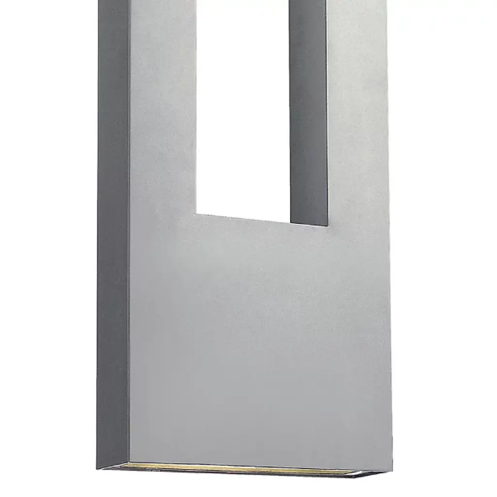The massive size of the Atlantis Outdoor Extra Large Wall Sconce by Hinkley Lighting gives a strong contemporary impression. Its empty section not only showcases an artistic use of negative space, but also houses 1 of 3 light sources that shine directly down through an etched glass lens. The remaining 2 light sources are located at the base, behind another etched glass lens, and generate a similar downward spill.