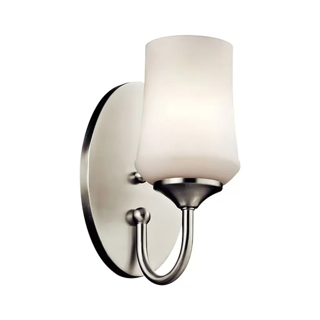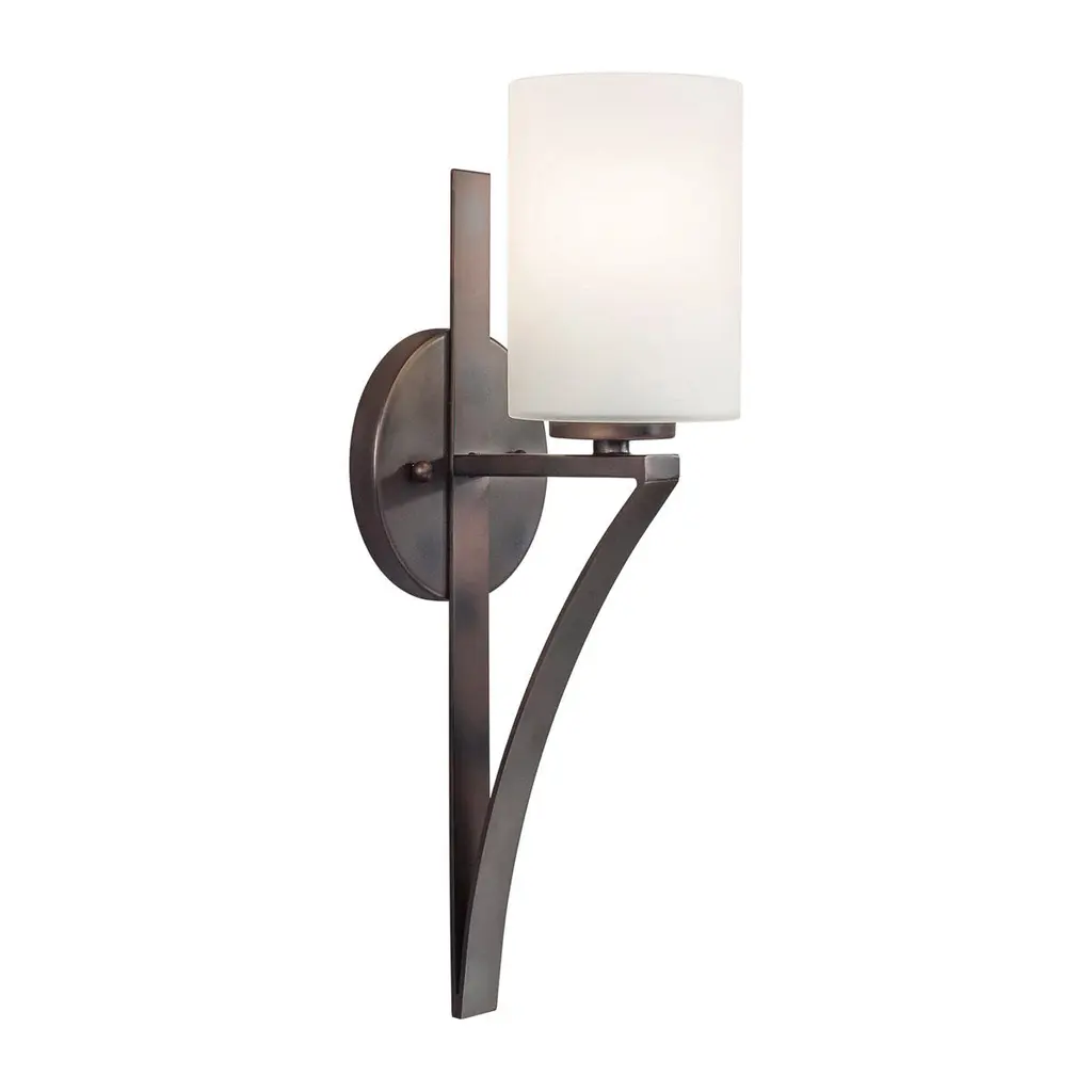 Clean, elegant and simple the Aubrey Wall Sconce by Kichler is a wall light that will heighten the design appeal of your room. Offered with a Chrome, Polished Nickel or Olde Bronze finish and a Satin Etched Cased Opal glass shade. This wall fixture is made with LED lighting technology and will have a life expectancy astronomically longer than your average bulb. This fixture has an oval-shaped wall plate with a slim Steel arm that protrudes in a u-shape to hold the glass shade in place.