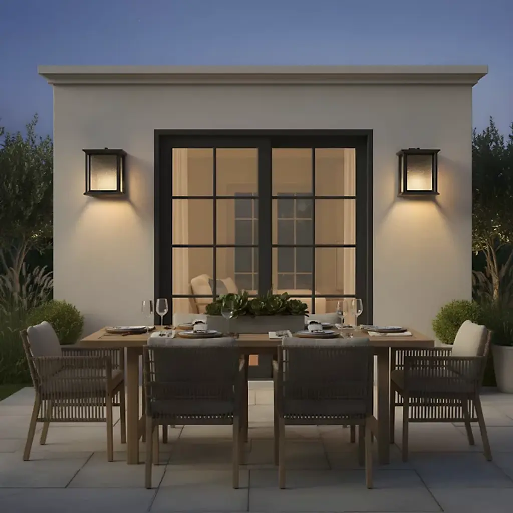 The Audley Outdoor Wall Sconce from Generation Lighting frames glass panels within a rectangular metal framework that creates visual interest. The crisp aluminum construction maintains geometric precision while the glass softly diffuses light for comfortable exterior illumination. This weather-rated fixture balances structured lines with organic glass. The sconce provides dimmable control for variable brightness and includes Dark Sky-friendly design options to reduce glare and minimize light pollution for environmentally conscious outdoor lighting applications.