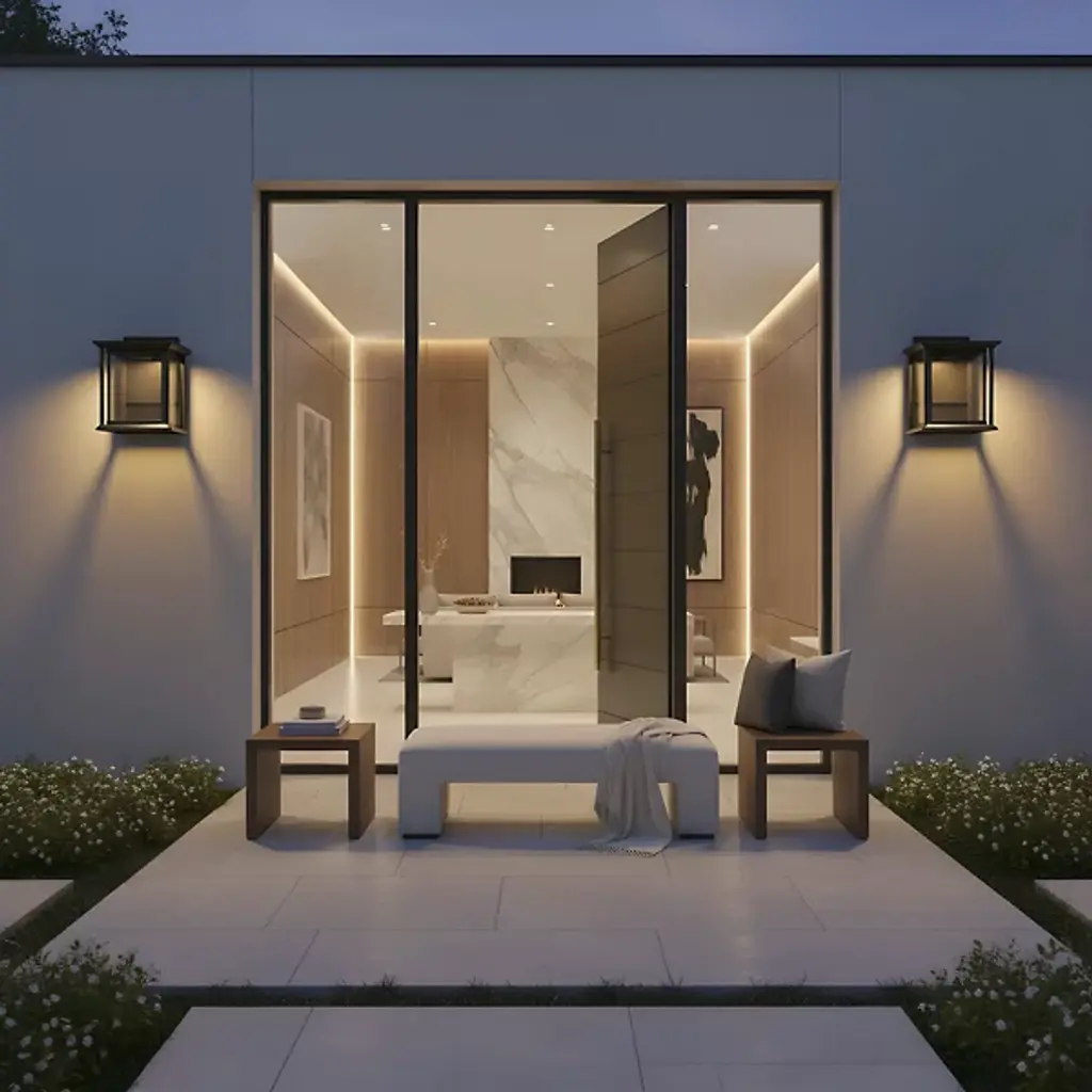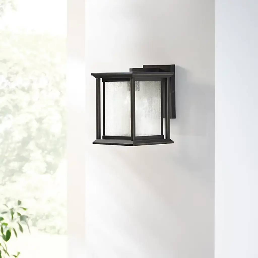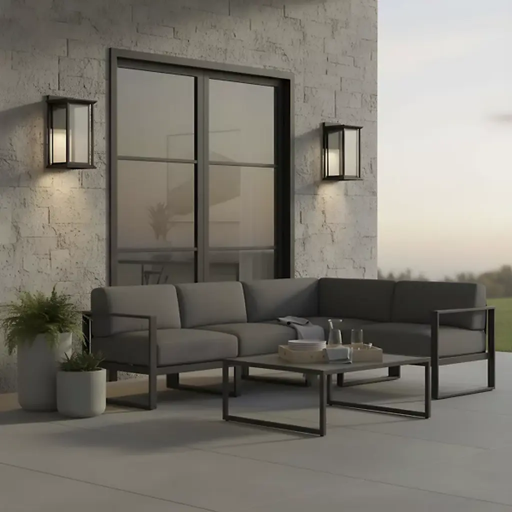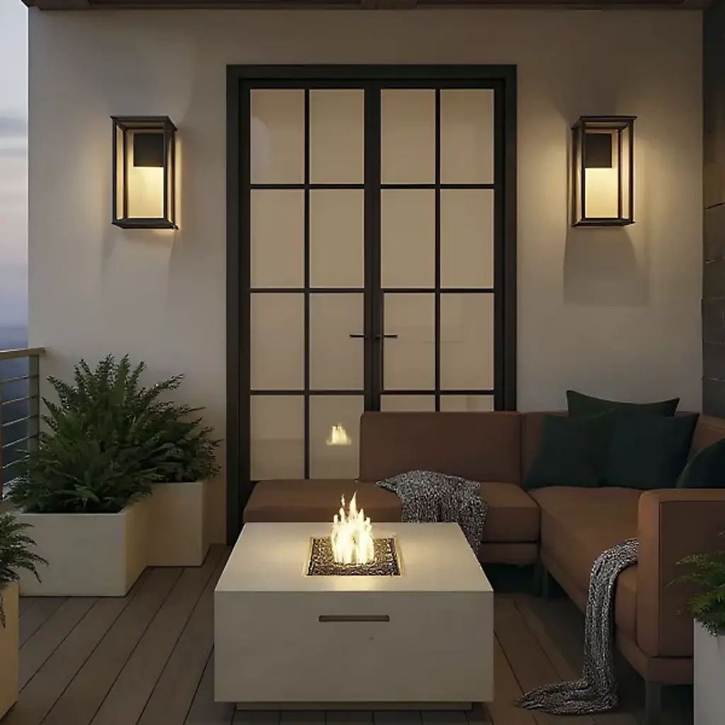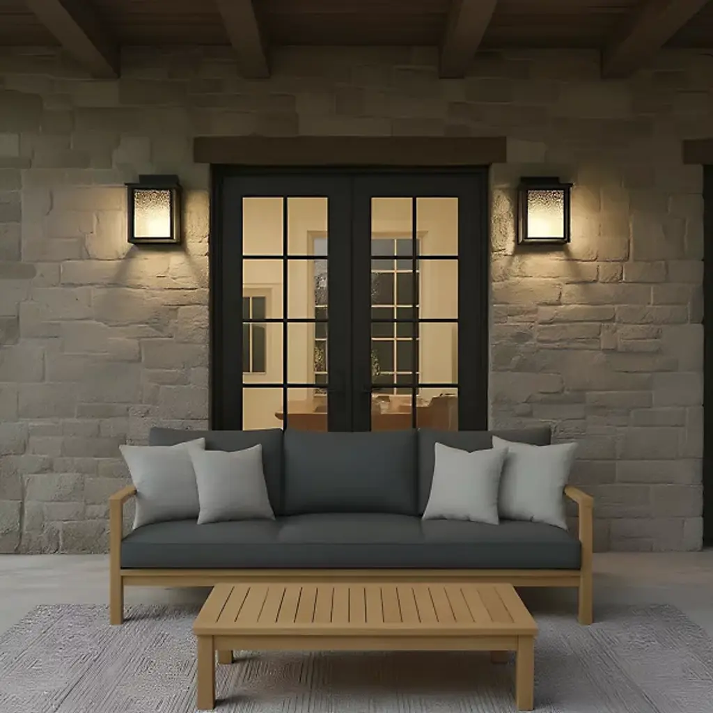 The Audley Outdoor Wall Sconce from Generation Lighting frames glass panels within a rectangular metal framework that creates visual interest. The crisp aluminum construction maintains geometric precision while the glass softly diffuses light for comfortable exterior illumination. This weather-rated fixture balances structured lines with organic glass. The sconce provides dimmable control for variable brightness and includes Dark Sky-friendly design options to reduce glare and minimize light pollution for environmentally conscious outdoor lighting applications.
