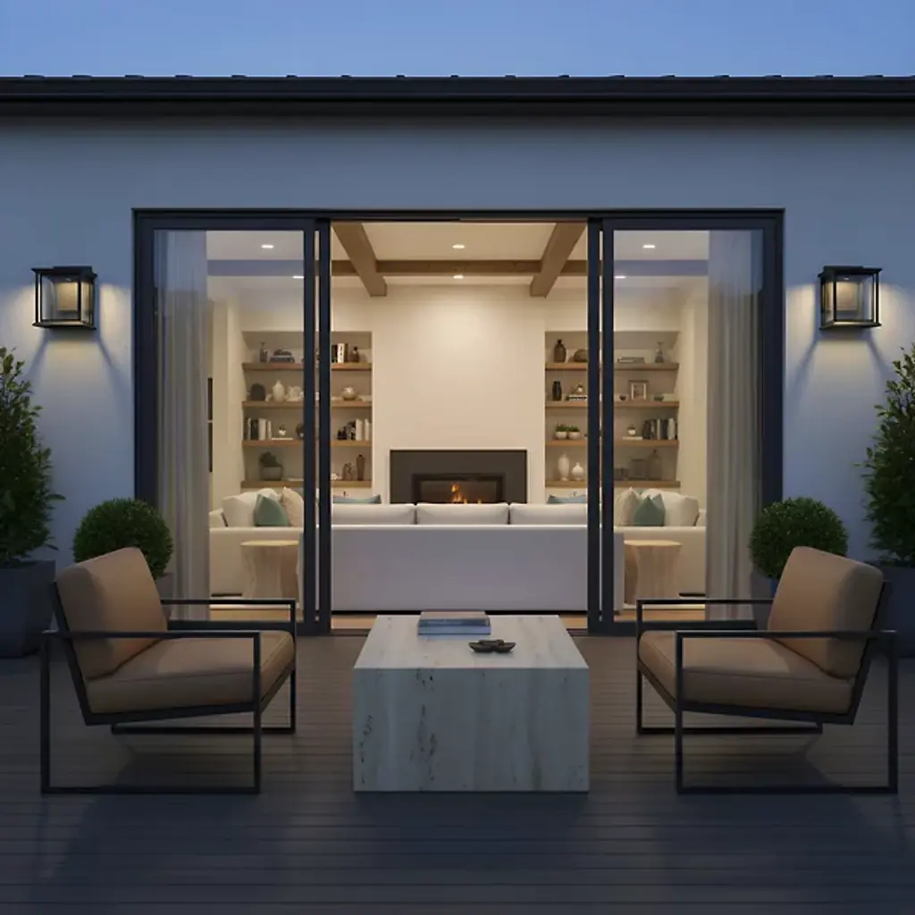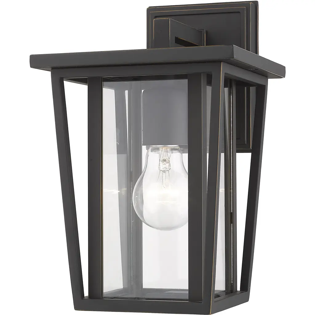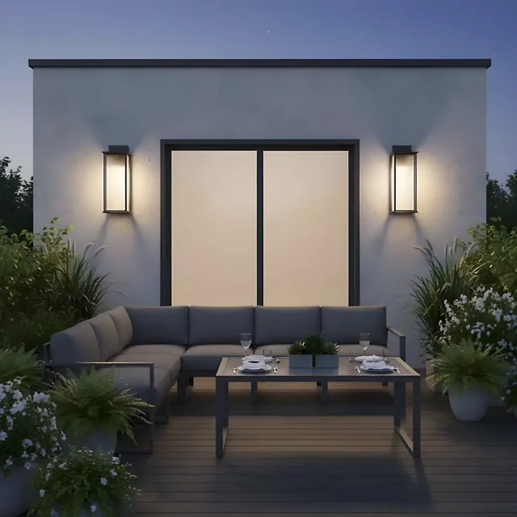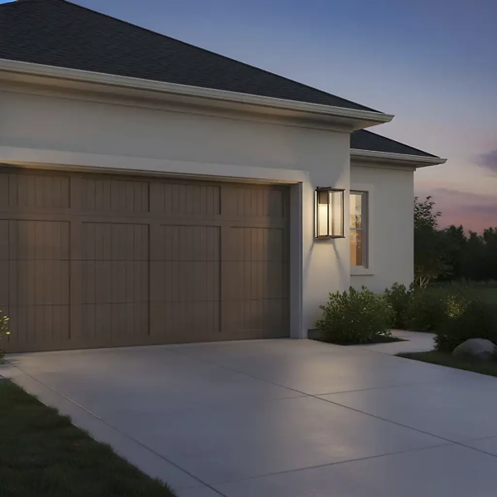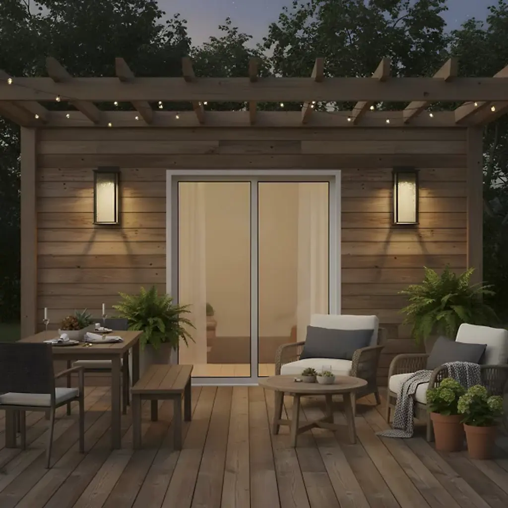 The Audley Outdoor Wall Sconce from Generation Lighting frames glass panels within a rectangular metal framework that creates visual interest. The crisp aluminum construction maintains geometric precision while the glass softly diffuses light for comfortable exterior illumination. This weather-rated fixture balances structured lines with organic glass. The sconce provides dimmable control for variable brightness and includes Dark Sky-friendly design options to reduce glare and minimize light pollution for environmentally conscious outdoor lighting applications.