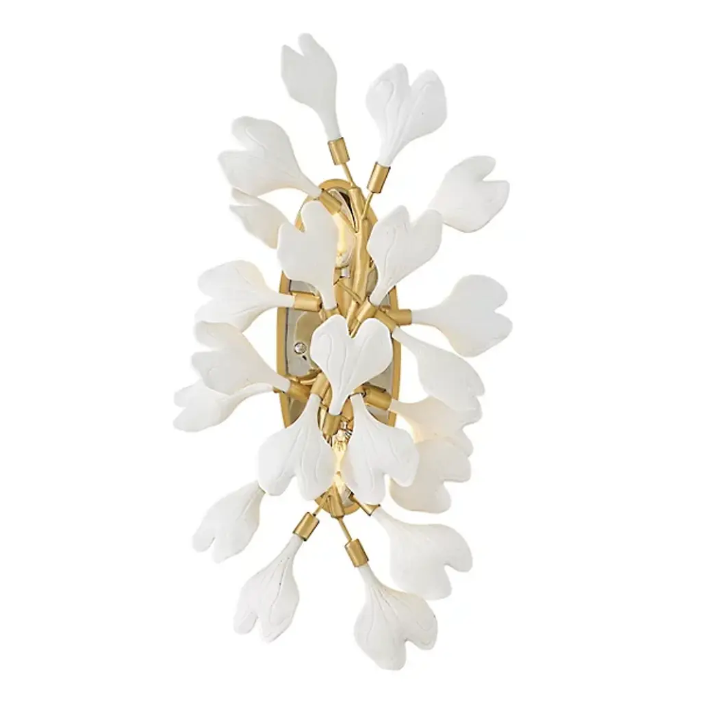 The Audra Wall Sconce from Currey & Company showcases delicate ceramic ginkgo leaves adorning hand-forged branches, creating an intricate, nature-inspired design. Its elegant frame features a hammered texture finished in Deluxe Gold, adding depth and sophistication. Exposed LED candelabra lamps provide warm, inviting illumination. Designed for versatility, the fixture can be mounted vertically or horizontally to suit various spaces. It blends traditional craftsmanship with modern aesthetics and offers a refined yet streamlined look.