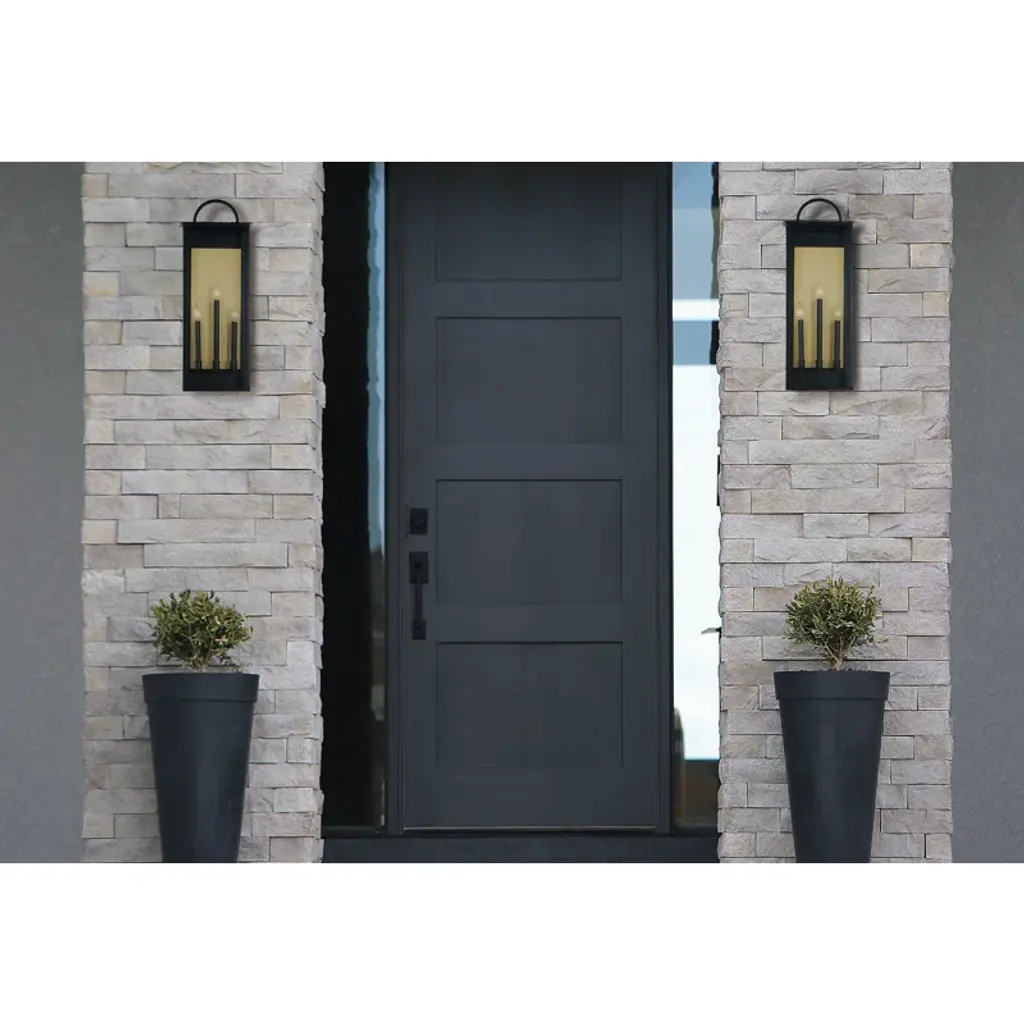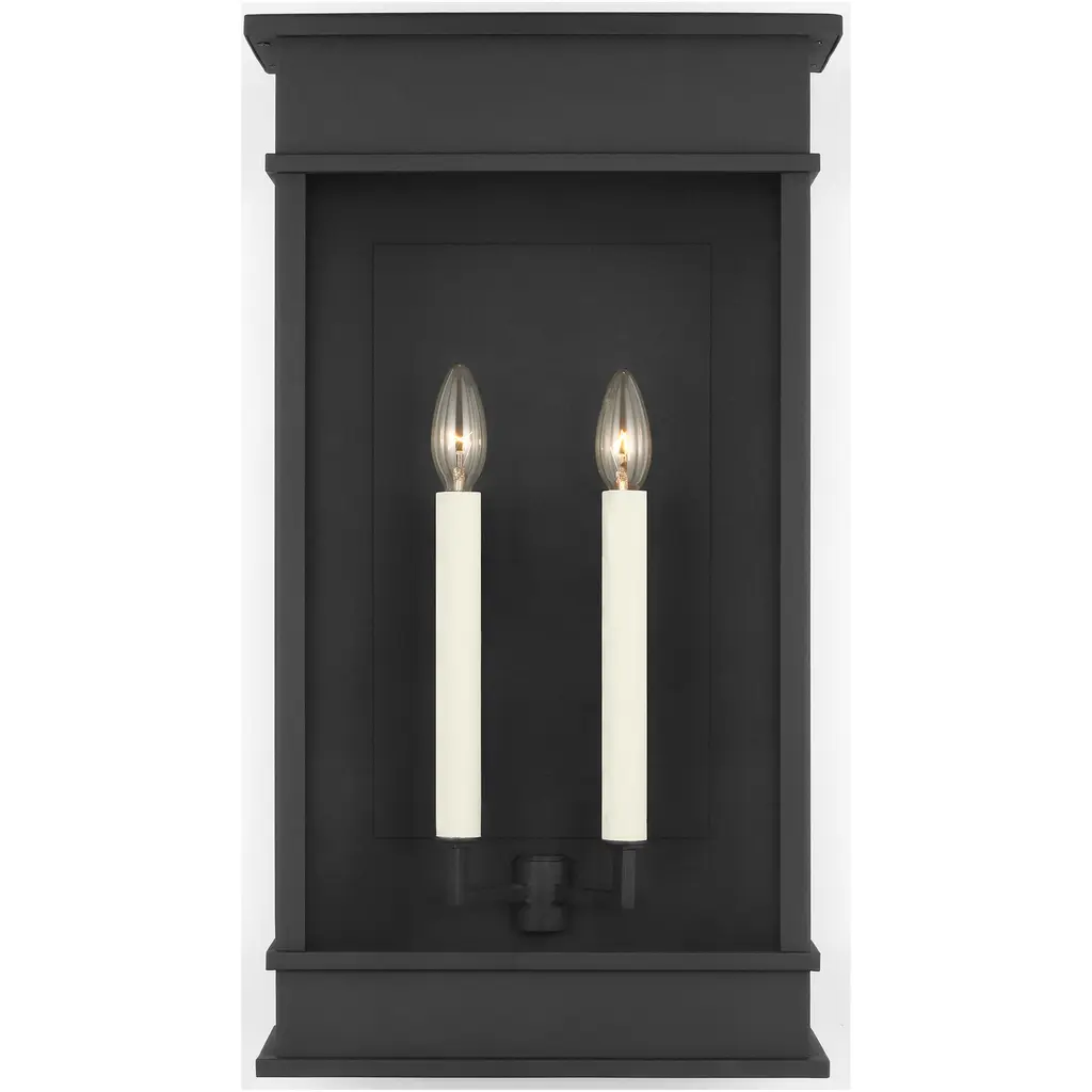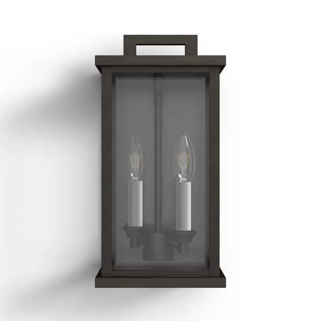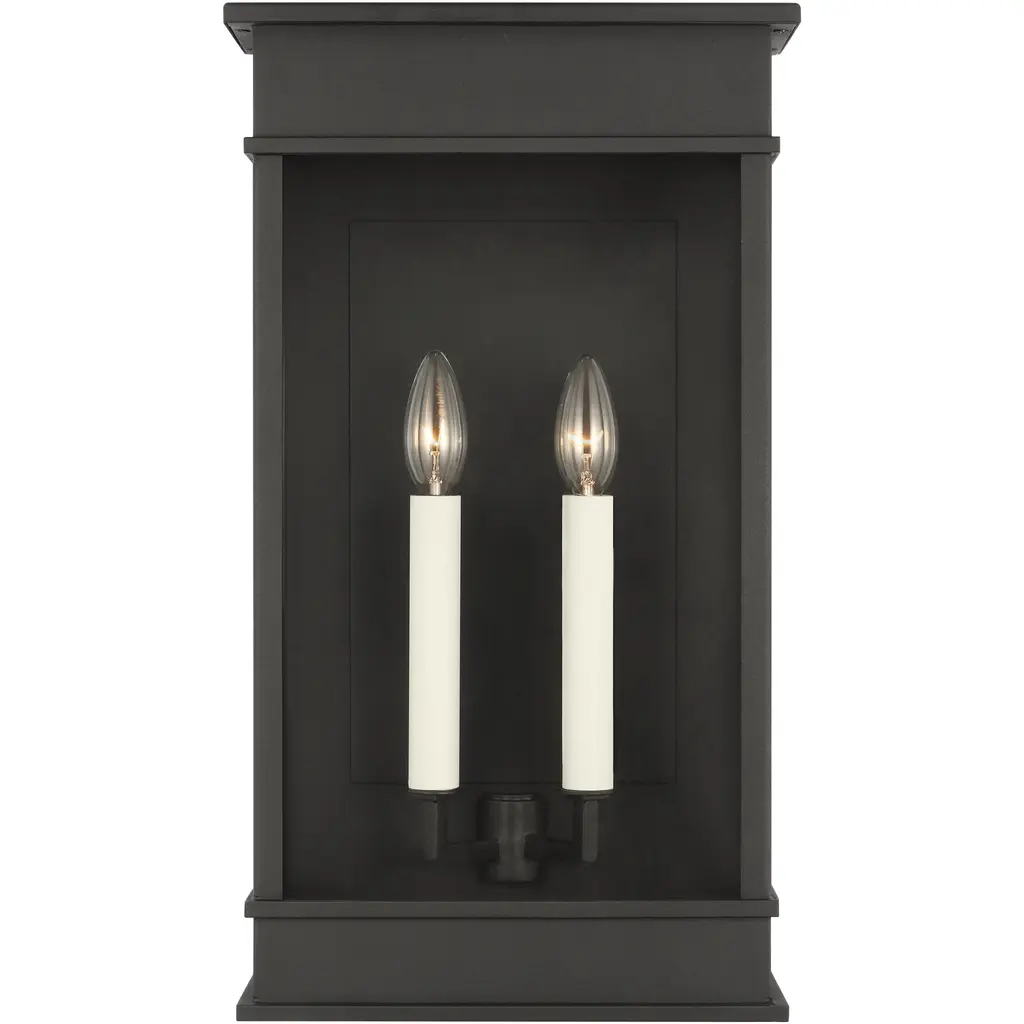 The series is inspired by classic coach lanterns and consists of minimally extended sconces in a variety of sizes that have been modified with simplified embellishments. The black frames have been modified with a squared arc handle and a contrasting burnished gold plate that reflects clusters of candlelights surrounded by clear glass panels. This collection references historic exterior sconces while modernizing their appearance. Complement the design with tubular lamps to accentuate the verticality of the frames.