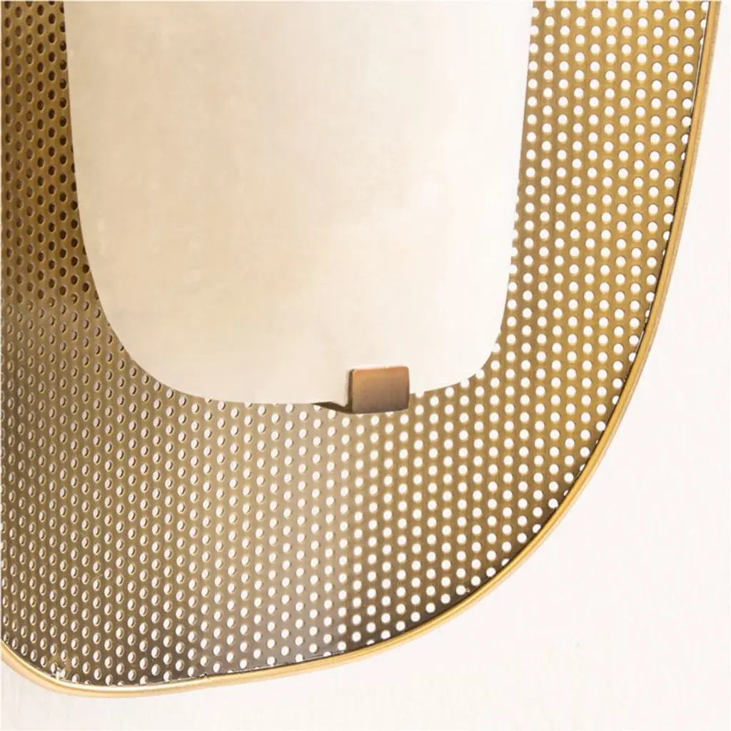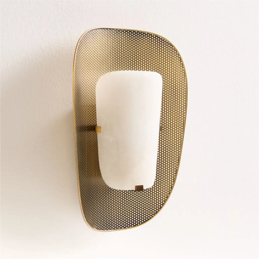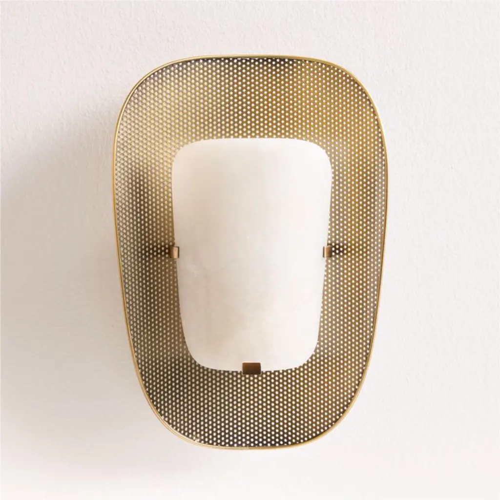 Our Aura sconce balances organic beauty and sleek, modern style. Elegant and elevated, a dreamy curve of honed alabaster casts a soft glow. The light reflects off the burnished brass-finished backing that curves around the perforated shade. We love the combinations of natural and industrial, smooth and intricate. A piece of jewelry for your wall, the Aura sconce shines on a stairway landing, flanking a buffet or lining a hallway.