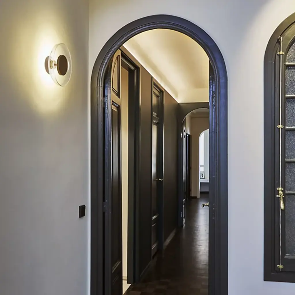 An eclipse of luminous proportions. Designed by Joan Gaspar for Marset, the Aura Plus LED Wall Sconce brings a sculptural element to your contemporary spaces. Inspired by the clarity and beauty of the traditional glass carafe, the wall light design showcases a beautiful round hand blown Glass shade wrapped around a lacquered Aluminum disc. An integrated LED light hidden behind the disc creates a radiant halo while the shade sends a subtle wash of light on the wall. As a solitary luminaire, the sconce lends a warm glow to foyer walls and makes a distinctive sculptural statement as grouping in a sitting room, bedroom, dining room or hallway.