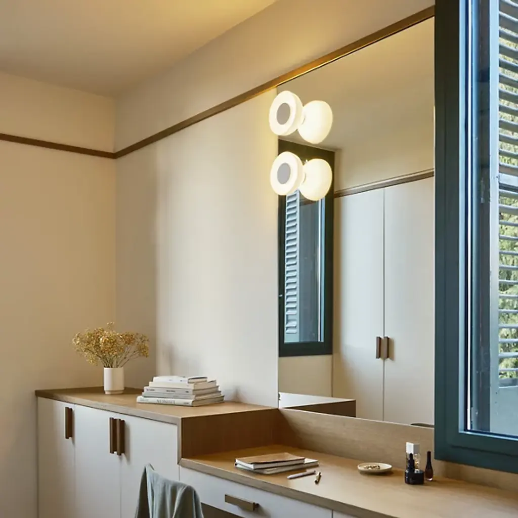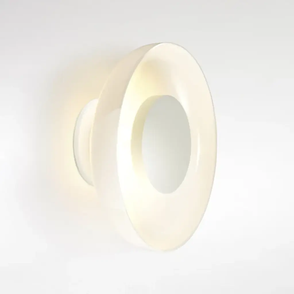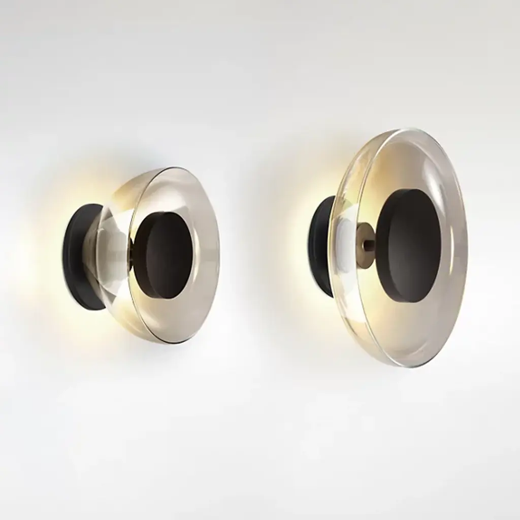 An eclipse of luminous proportions. Designed by Joan Gaspar for Marset, the Aura Plus LED Wall Sconce brings a sculptural element to your contemporary spaces. Inspired by the clarity and beauty of the traditional glass carafe, the wall light design showcases a beautiful round hand blown Glass shade wrapped around a lacquered Aluminum disc. An integrated LED light hidden behind the disc creates a radiant halo while the shade sends a subtle wash of light on the wall. As a solitary luminaire, the sconce lends a warm glow to foyer walls and makes a distinctive sculptural statement as grouping in a sitting room, bedroom, dining room or hallway.