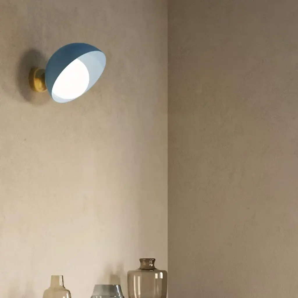 The Aurora Wall Sconce from Italamp channels retro style through a dynamic form and angular arrangement of rounded shapes. Designed by Virginia Cei, the fixture pairs a rounded wall mount with an angled dome shade that partially embraces a white glass globe diffuser. The composition recalls the soft glow of dawn, with color finishes that echo early Italian design. Light reflects from the dome as it diffuses through the globe, creating a balance of ambient warmth and gentle highlights across the indoor walls.