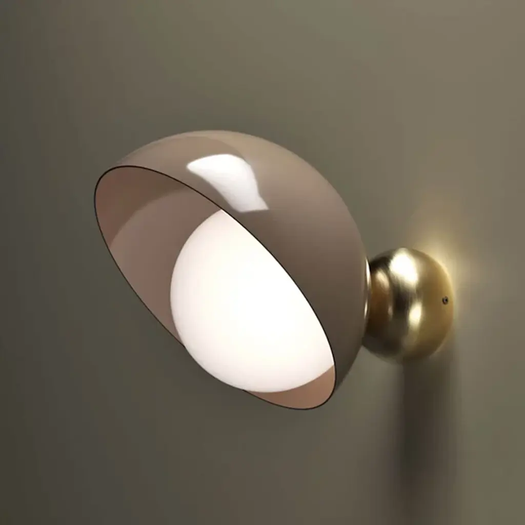 The Aurora Wall Sconce from Italamp channels retro style through a dynamic form and angular arrangement of rounded shapes. Designed by Virginia Cei, the fixture pairs a rounded wall mount with an angled dome shade that partially embraces a white glass globe diffuser. The composition recalls the soft glow of dawn, with color finishes that echo early Italian design. Light reflects from the dome as it diffuses through the globe, creating a balance of ambient warmth and gentle highlights across the indoor walls.