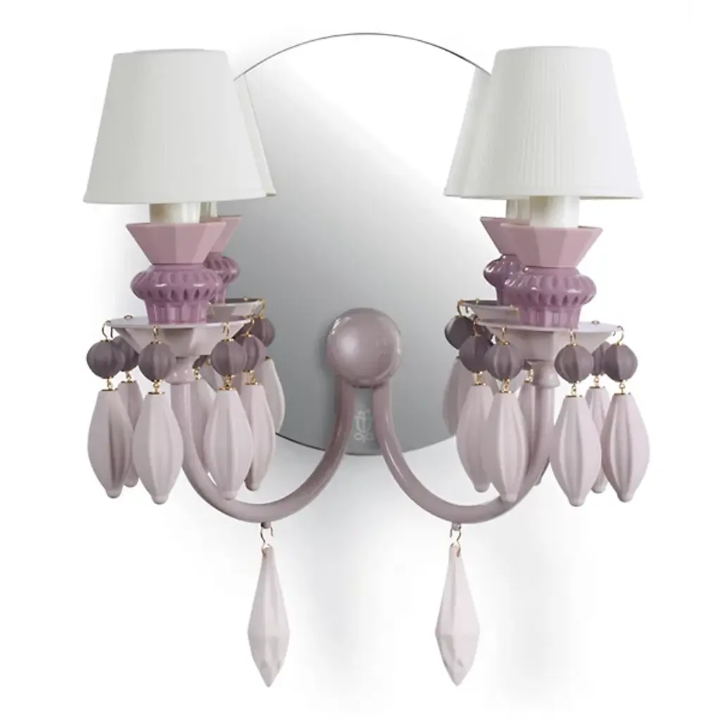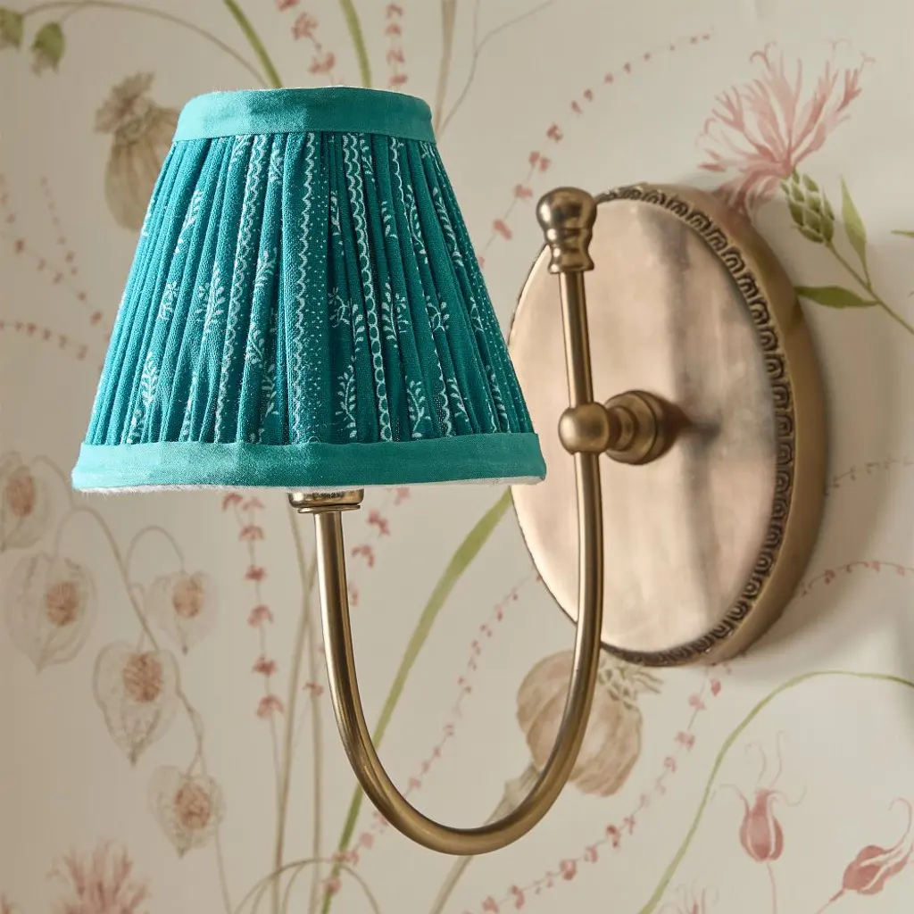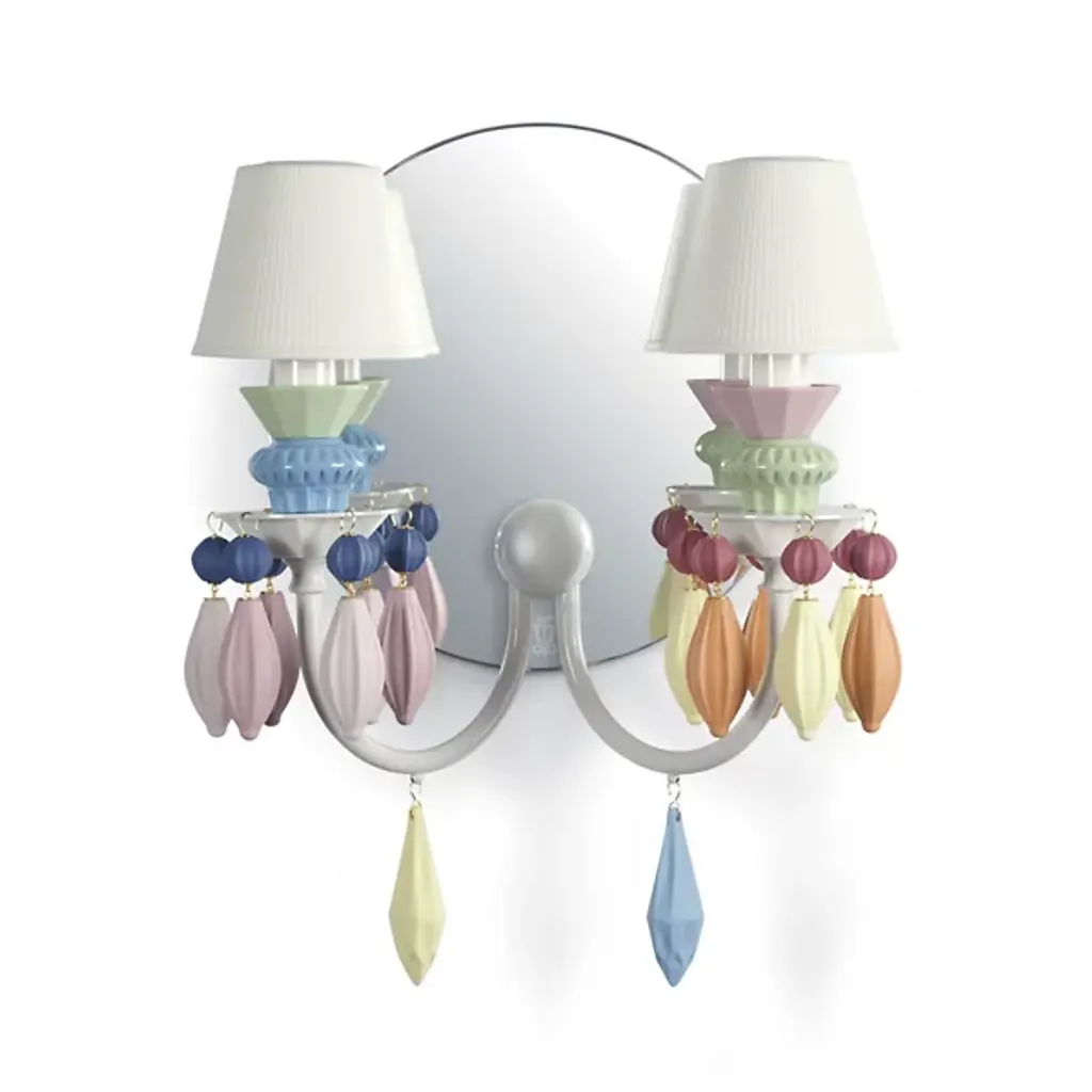 Extraordinarily elegant in its clean, symmetrical design, this gorgeous sconce will imbue a modern interior with distinctive charm and sophistication. Defined by precious elements in white porcelain decorated with East Asian-inspired floral patterns, it features a brushed and glossy gold-finished metal structure composed of two deeply curved arms supporting two pleated blue fabric shades, each housing an E14 max 60W light bulb.