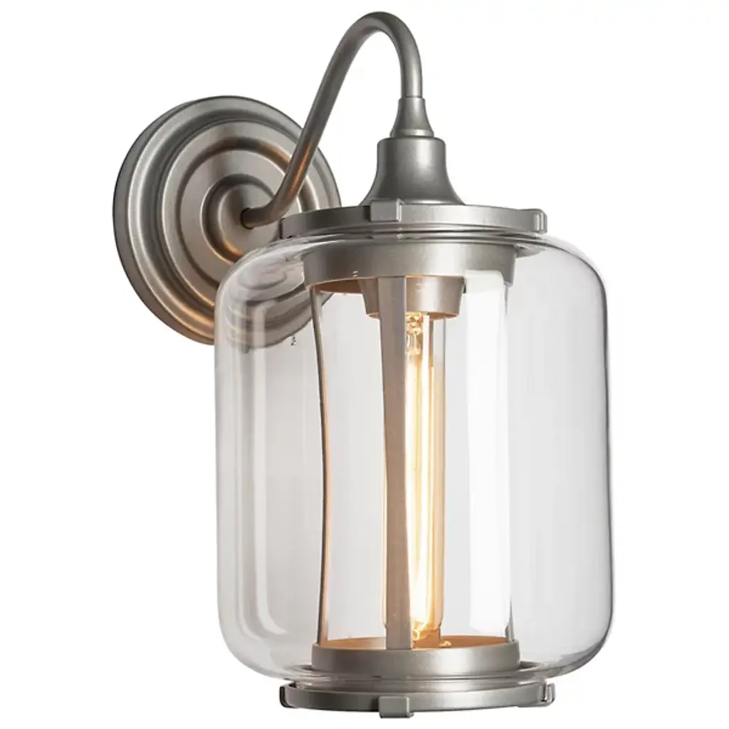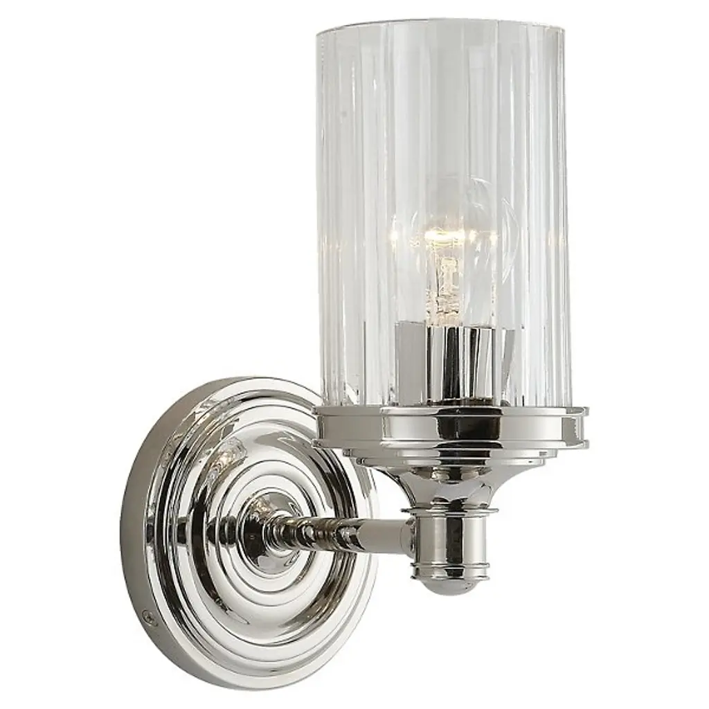 The Ava Wall Sconce by Visual Comfort Signature, formerly known as Visual Comfort, brings a sophisticated charm to your living space with its artisan-crafted design and warm ambient lighting. Intricately detailed metalwork with alluring circular patterns contrasts with a vertically faceted Clear Glass shade, adding character and depth to the radiance of a single tungsten Edison bulb. A handsome addition to living rooms, dining rooms, and entryways.