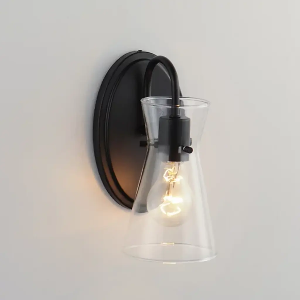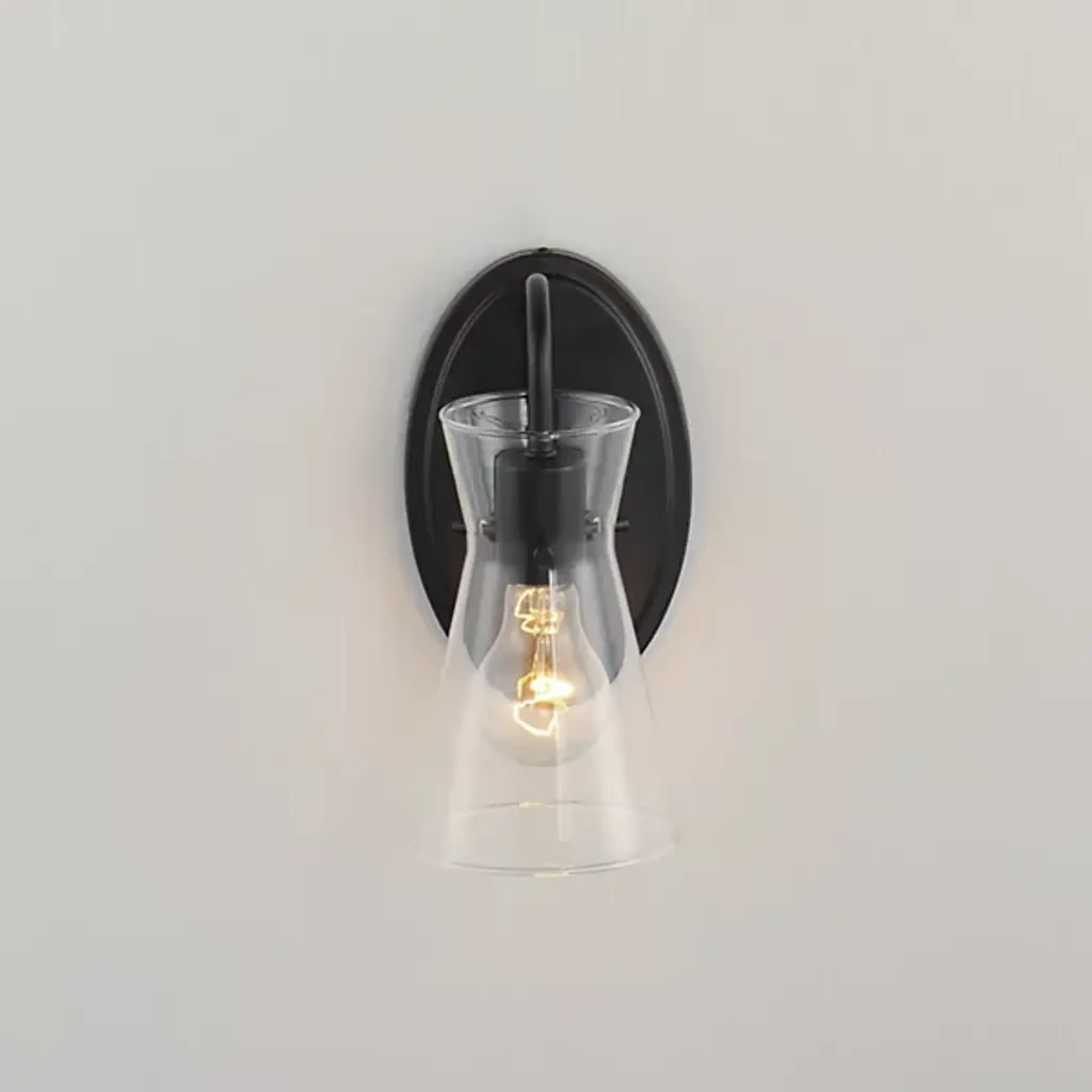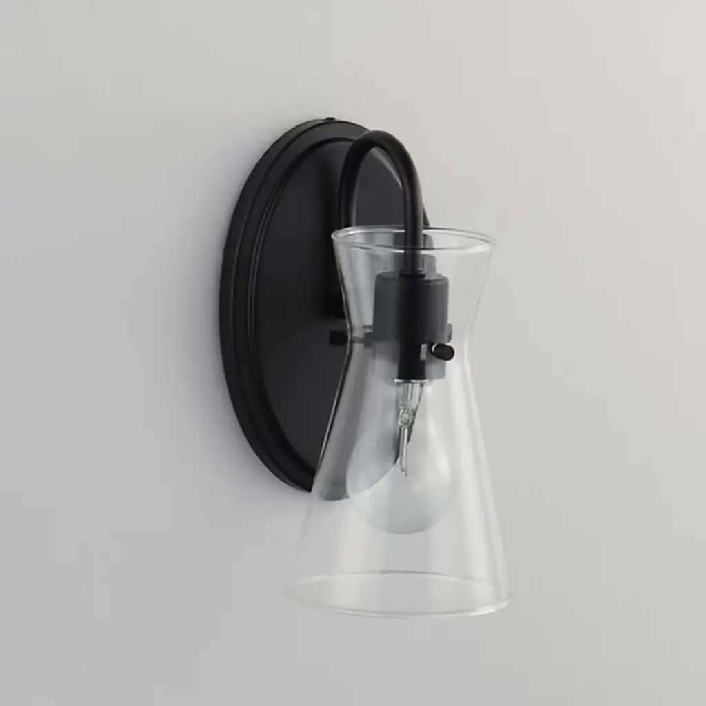 The Ava Wall Sconce from Maxim Lighting is a fusion of transitional elegance and functional brilliance that elevates your living space. Ava boasts a sharp silhouette featuring angular glass suspended by pin connections. The use of glass and a metal framework enhances the sconce's farmhouse aesthetic. A contoured arm stems from a sturdy backplate, keeping this lighting solution in place. It's Illuminated by an LED that is dimmable with a separately sold ELV dimmer.