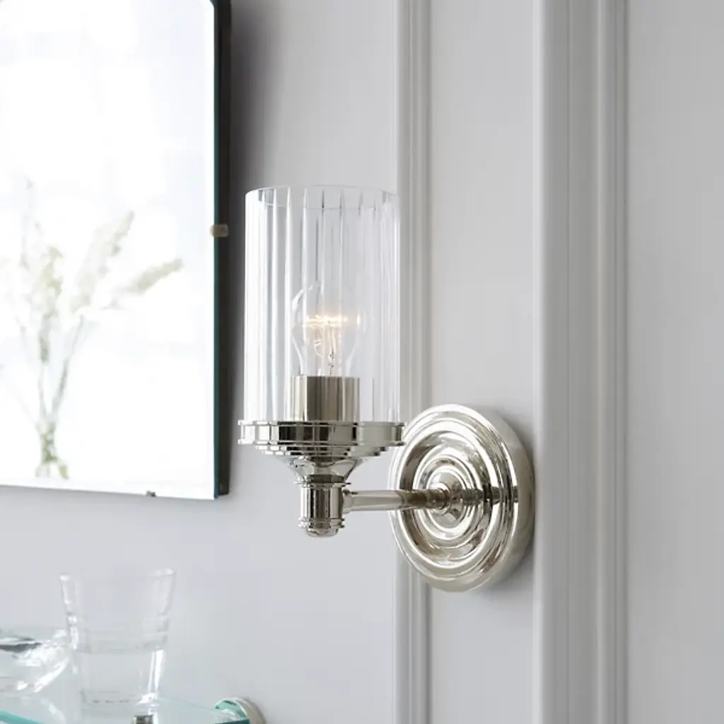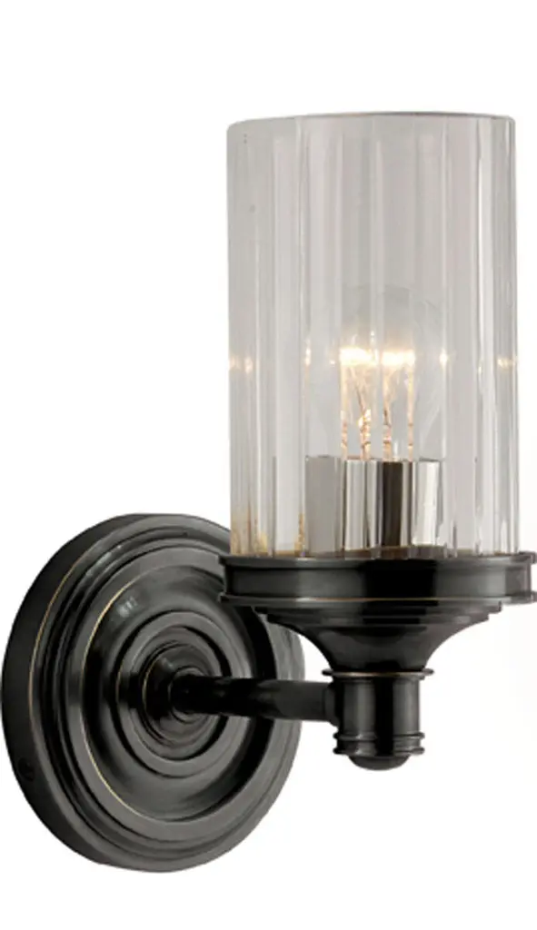 The Ava Wall Sconce by Visual Comfort Signature, formerly known as Visual Comfort, brings a sophisticated charm to your living space with its artisan-crafted design and warm ambient lighting. Intricately detailed metalwork with alluring circular patterns contrasts with a vertically faceted Clear Glass shade, adding character and depth to the radiance of a single tungsten Edison bulb. A handsome addition to living rooms, dining rooms, and entryways.
