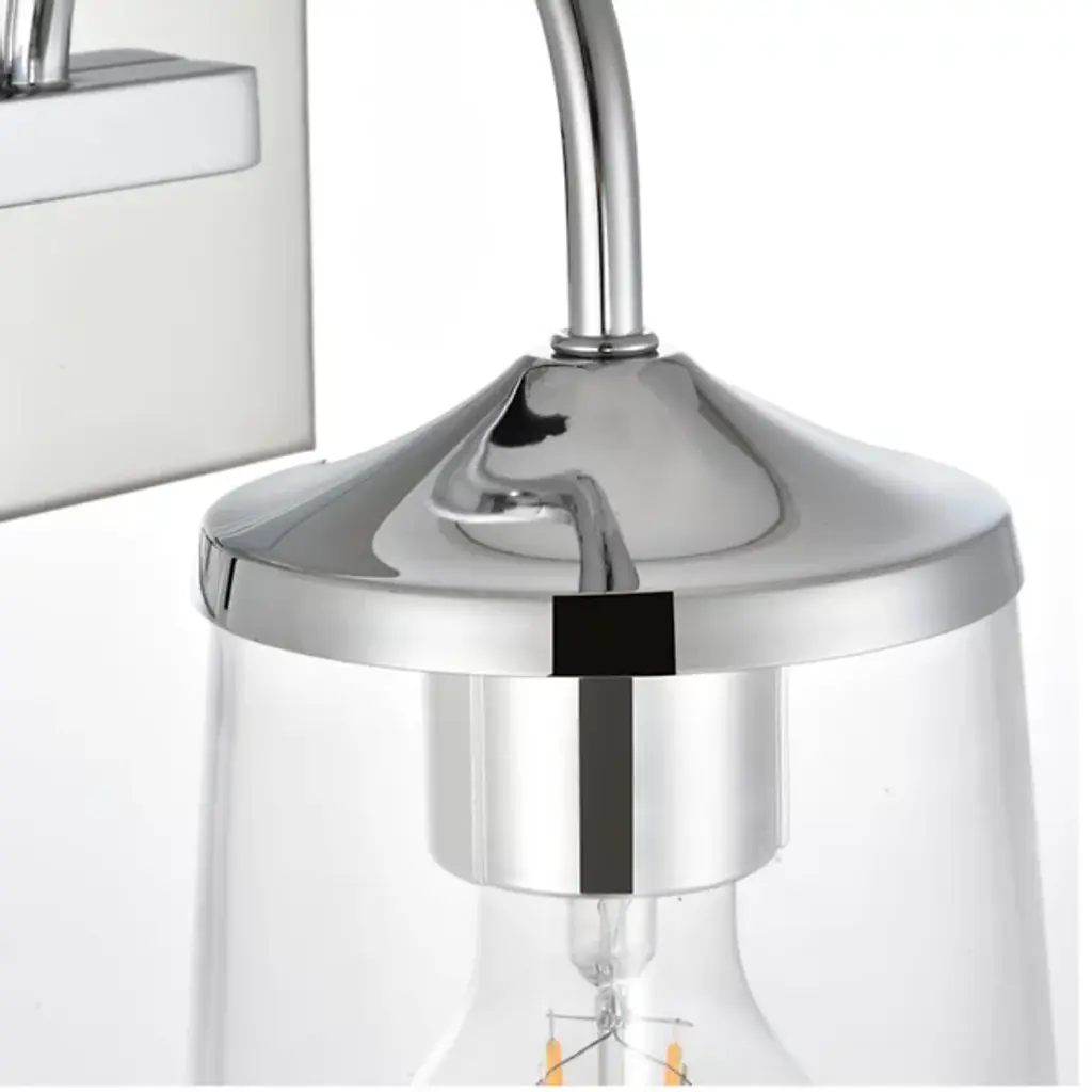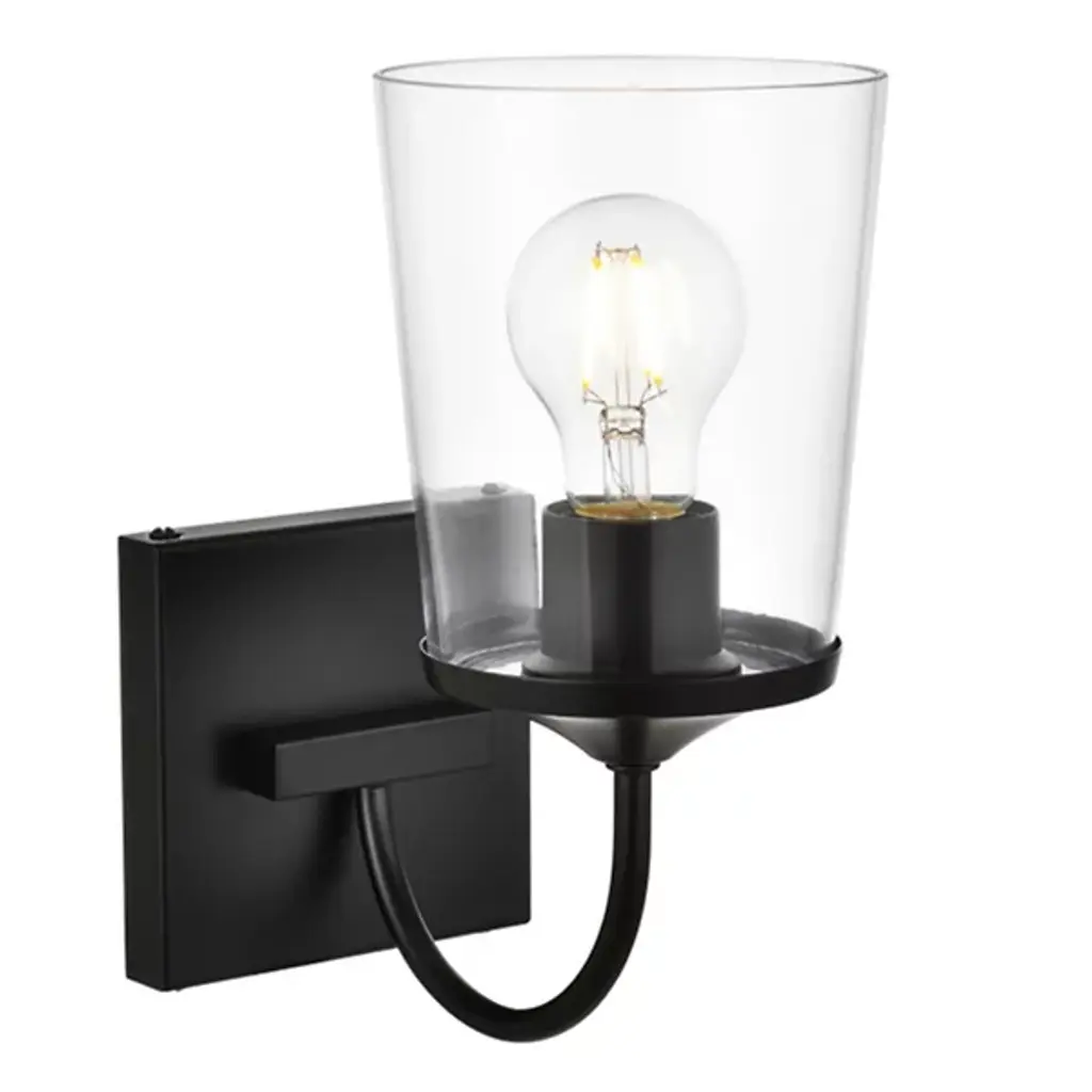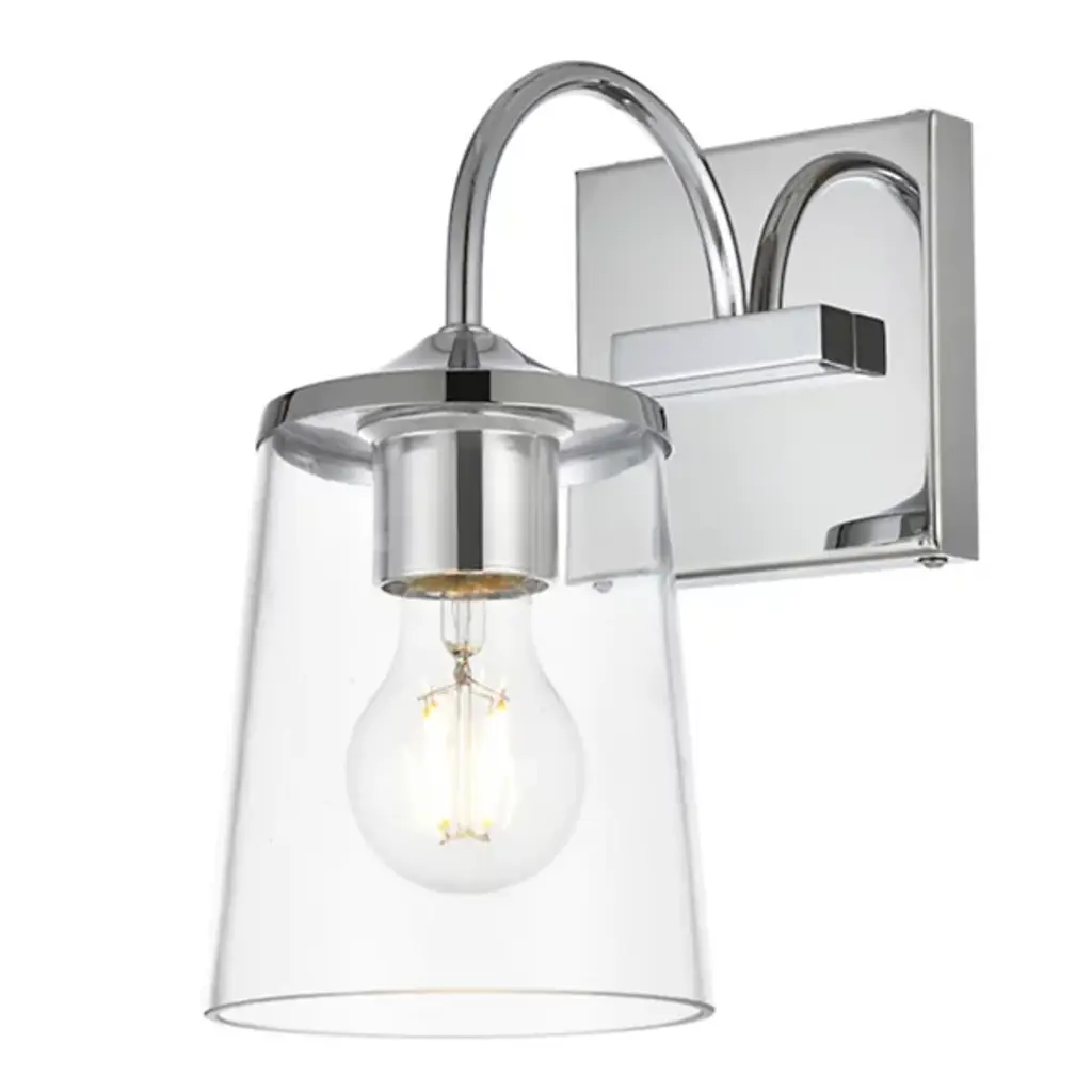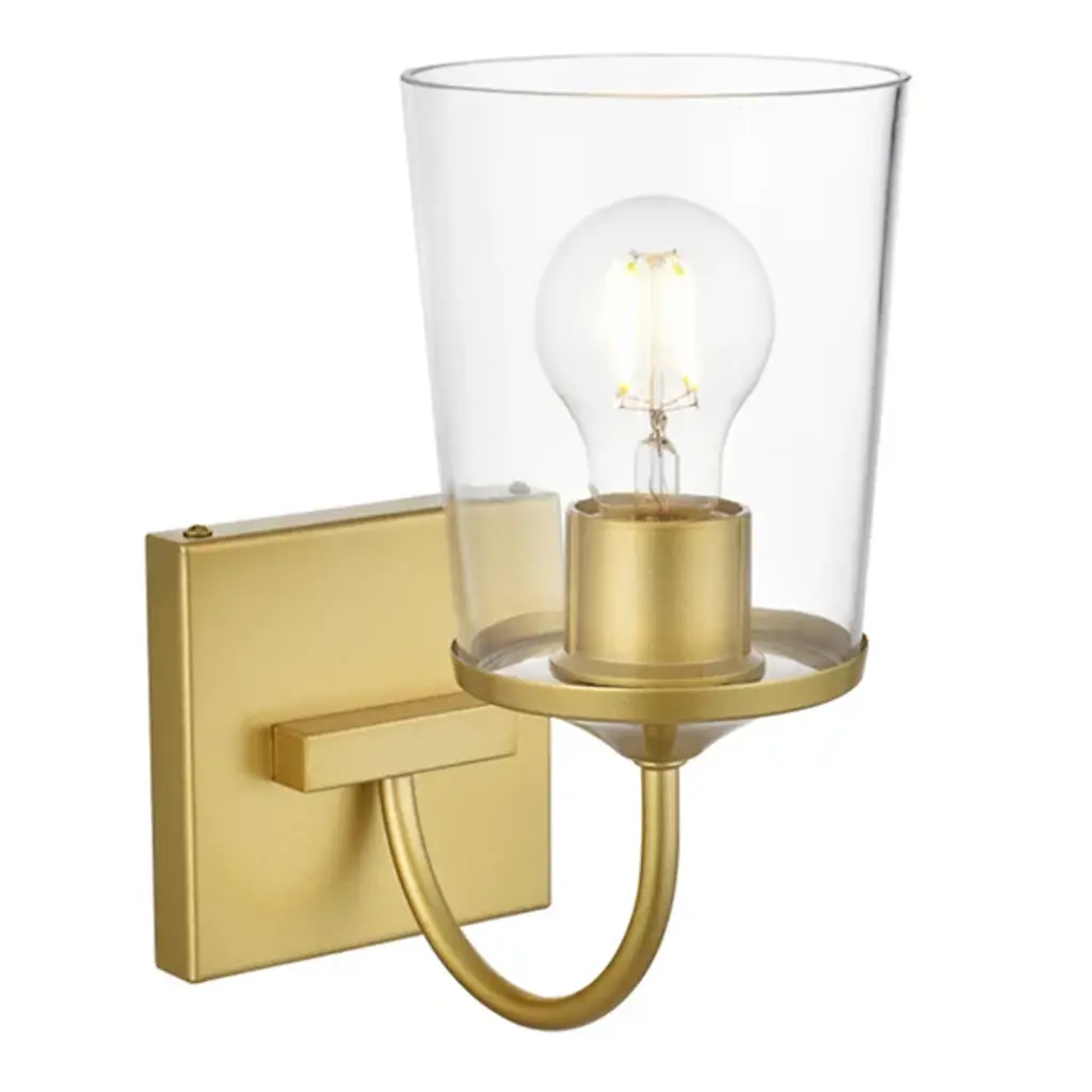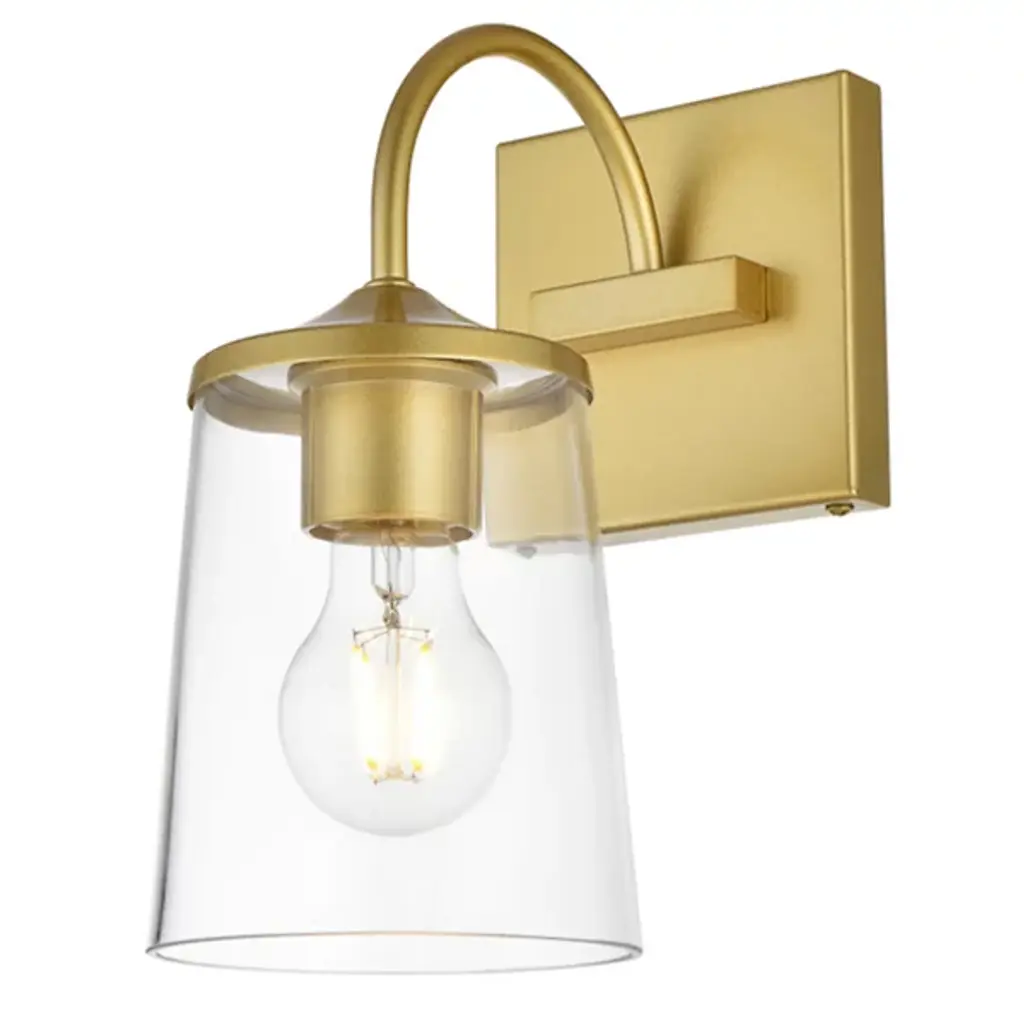 Highlighted by a curved metal arm, the Avanie Bath Sconce from Huxe elegantly suspends a clear bell glass shade, creating a contemporary statement. Its sleek design showcases straight-line details from the backplate to the streamlined metal arm. Compatible with dimmers, it offers customizable lighting for any time of day. Versatile placement options allow you to use it as an uplight or downlight, ensuring it suits various spaces and preferences seamlessly.