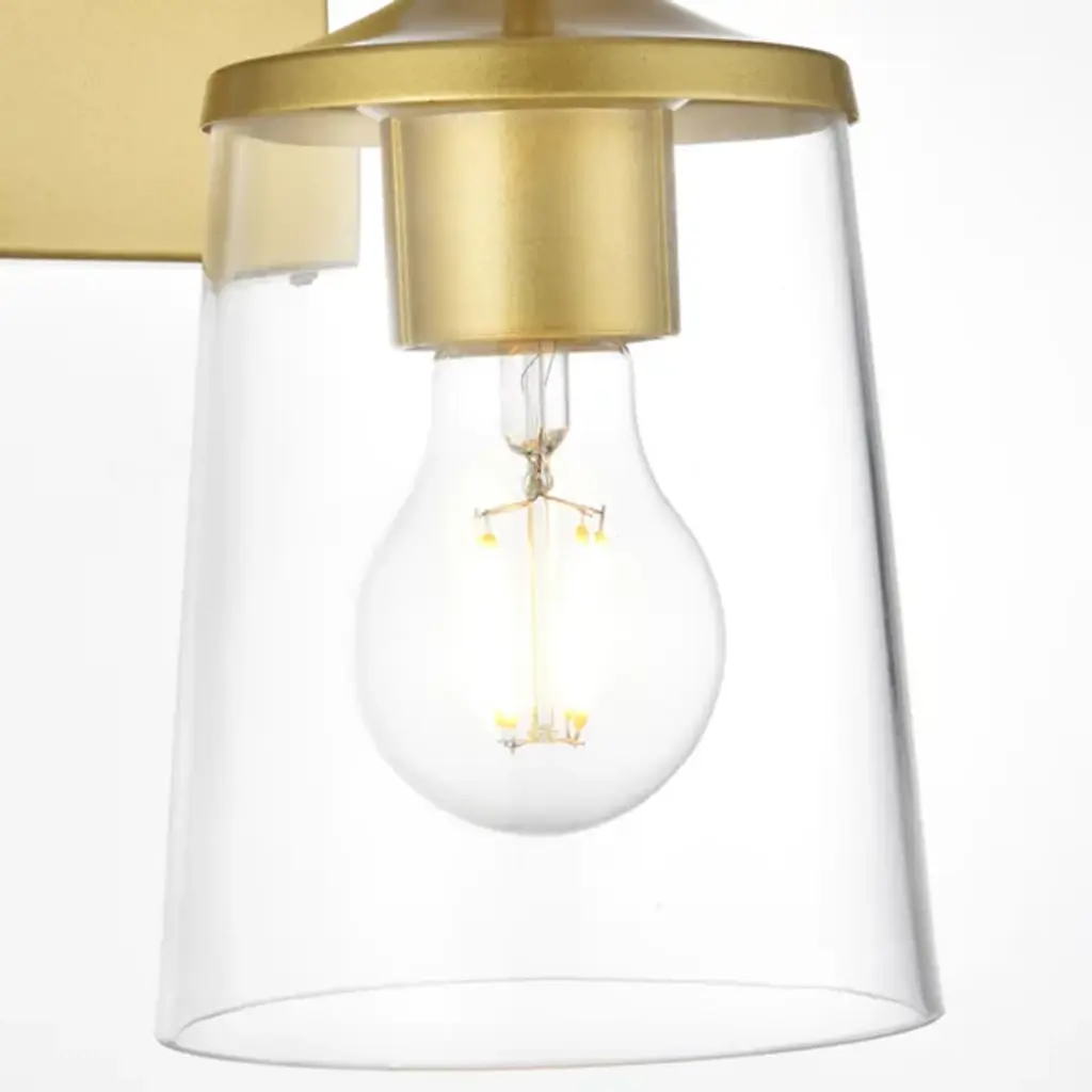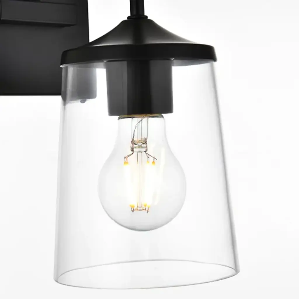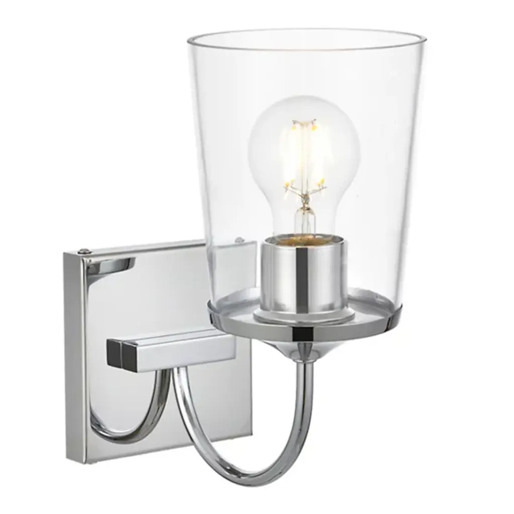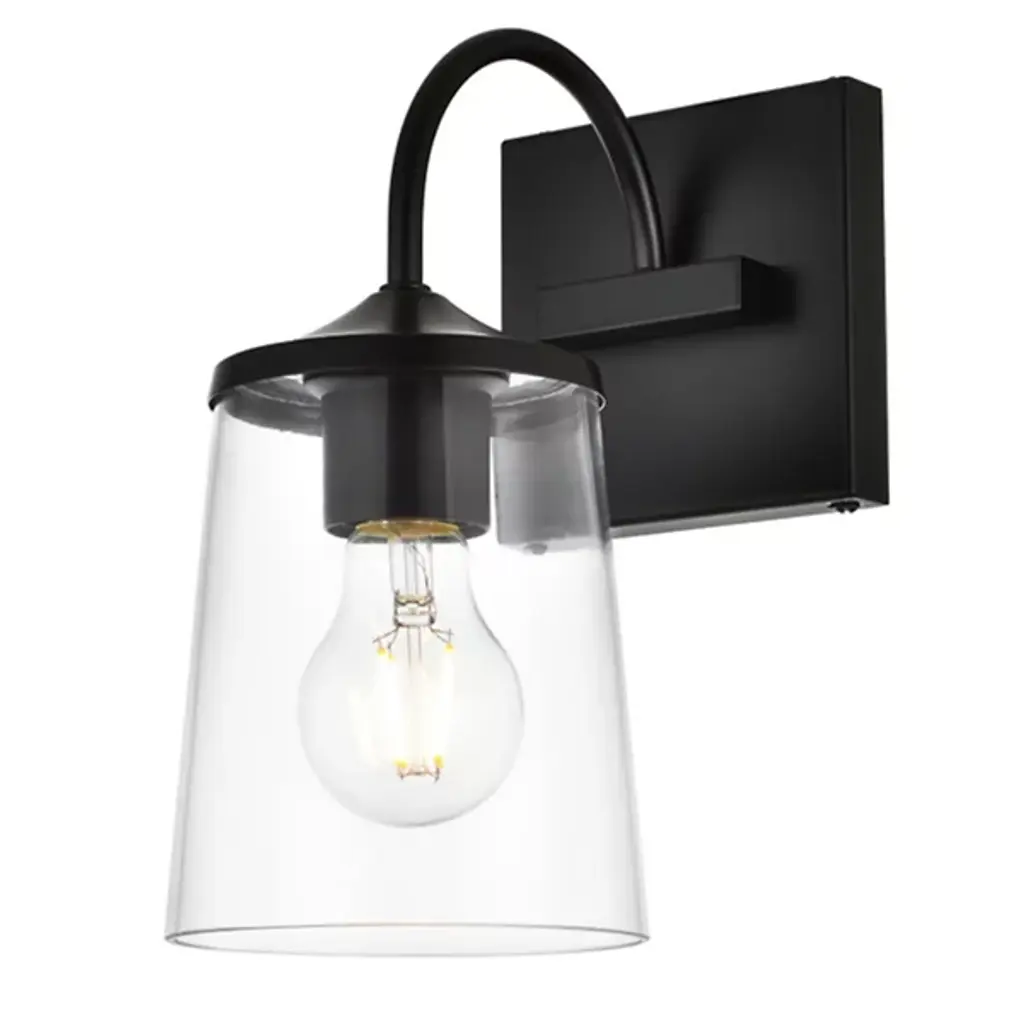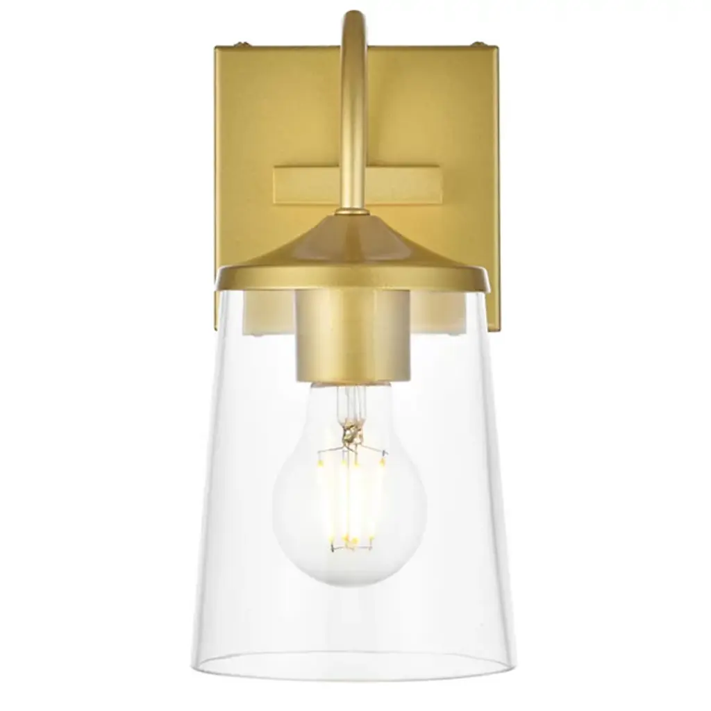 Highlighted by a curved metal arm, the Avanie Bath Sconce from Huxe elegantly suspends a clear bell glass shade, creating a contemporary statement. Its sleek design showcases straight-line details from the backplate to the streamlined metal arm. Compatible with dimmers, it offers customizable lighting for any time of day. Versatile placement options allow you to use it as an uplight or downlight, ensuring it suits various spaces and preferences seamlessly.