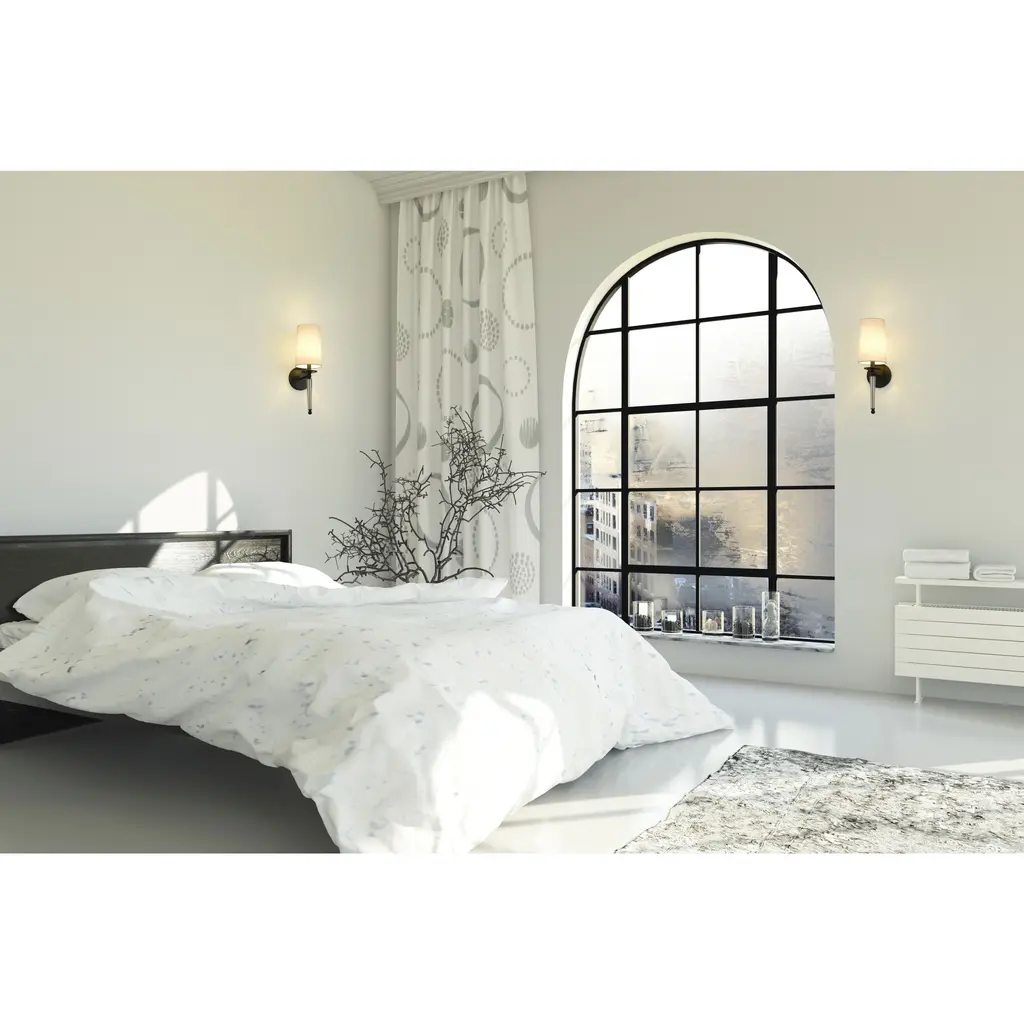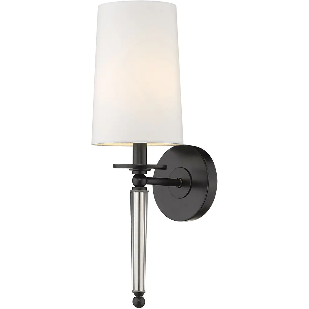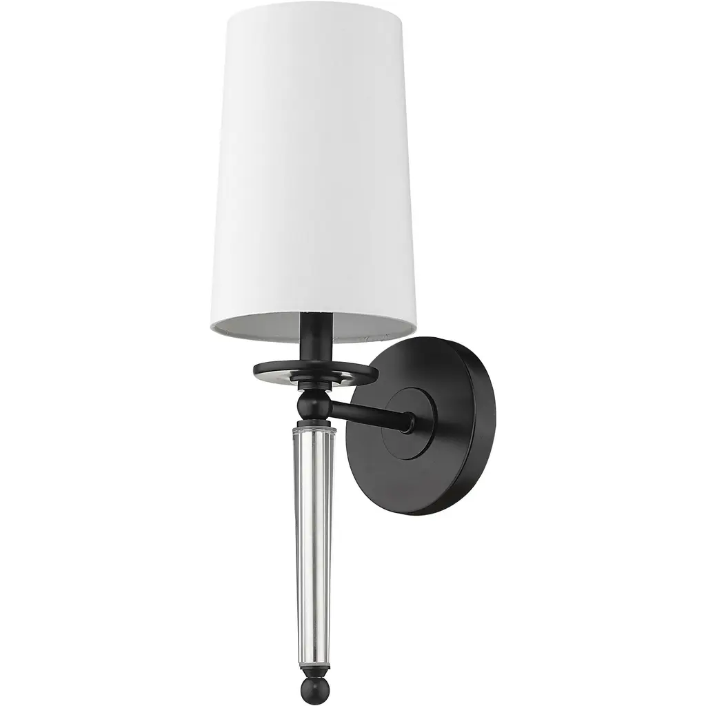 Enchanting, artistic design delivers chic inspiration in this one-light wall sconce, an excellent choice for a bathroom, bedroom, or hallway. A lush blend of matte black finish steel and delicate crystal form a romantic vertical stem mounted to an oval wall piece. Topped with a fresh white shade, this sconce creates the artistic elegance that seals the motif of a classic transitional space.