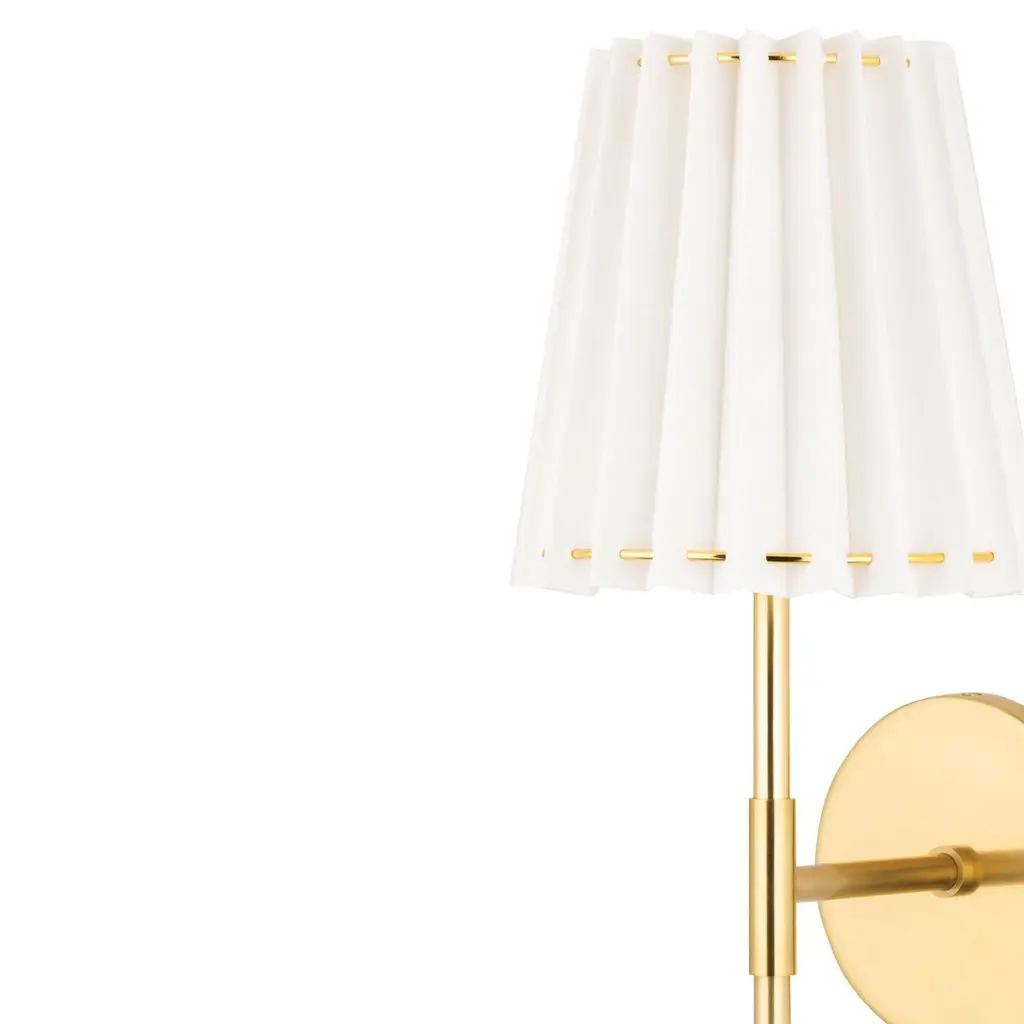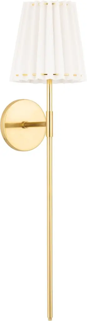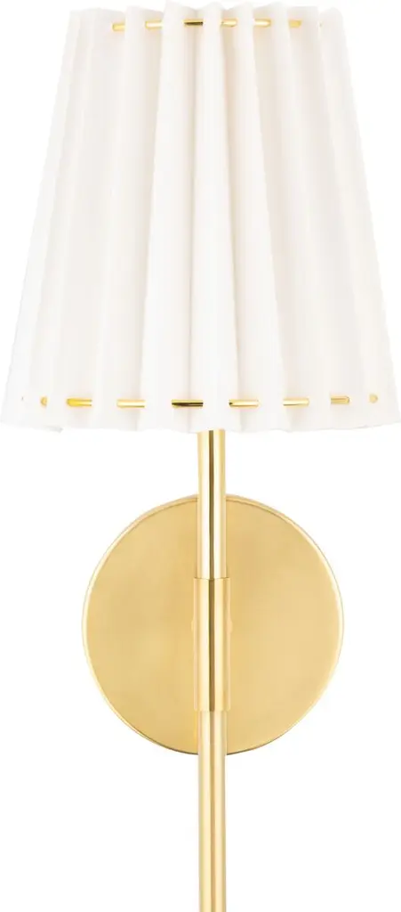 A slender brass ring threaded through the bottom of the Belgian linen shade accentuates this sconce's timeless elegance. Because the sconce is damp rated, you can place it in a bathroom as well as beside a bed, in a hall, or just about anywhere else in your home.