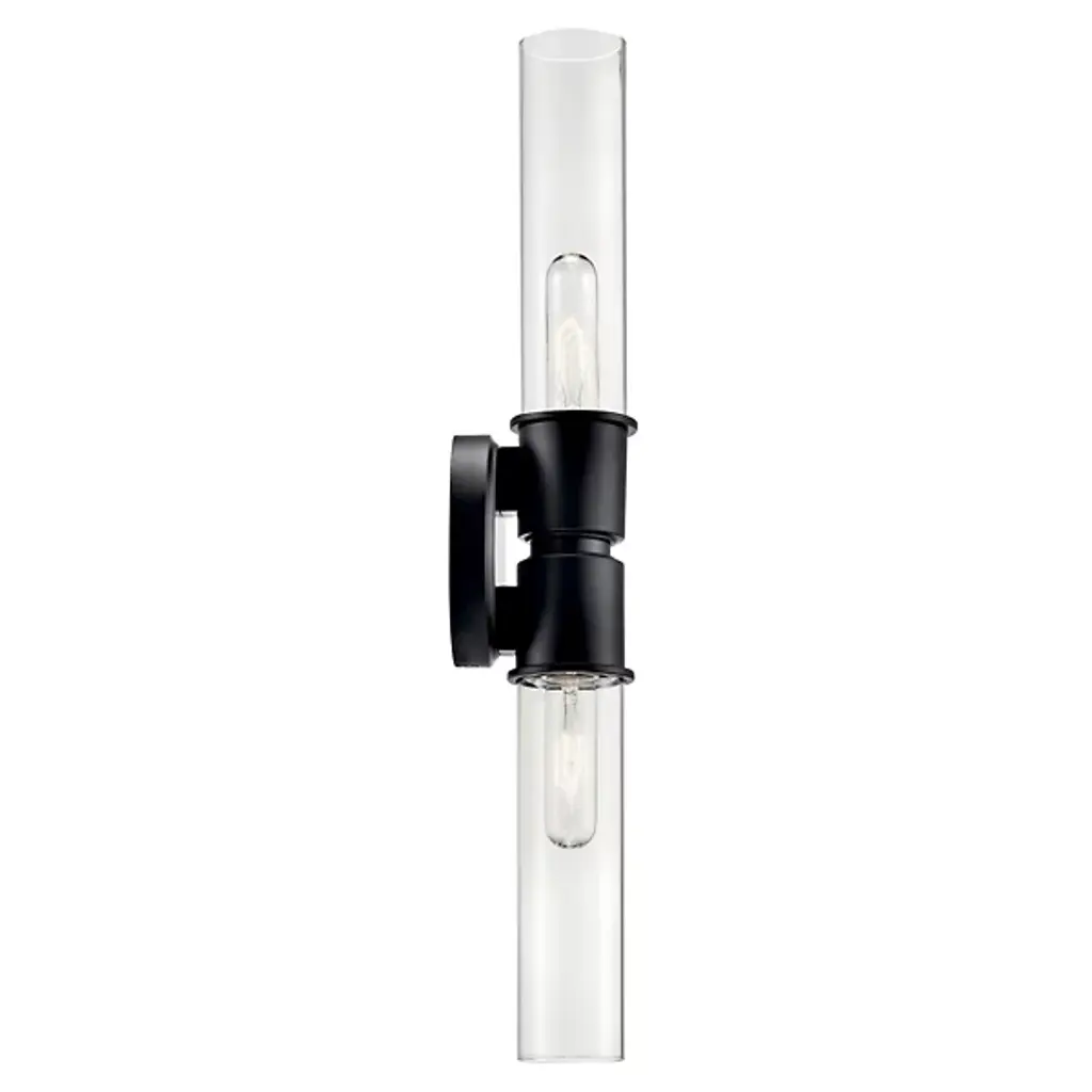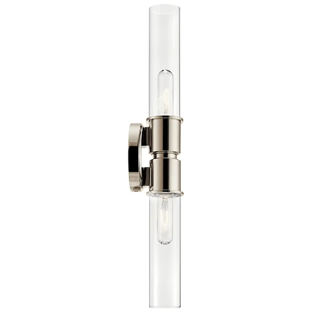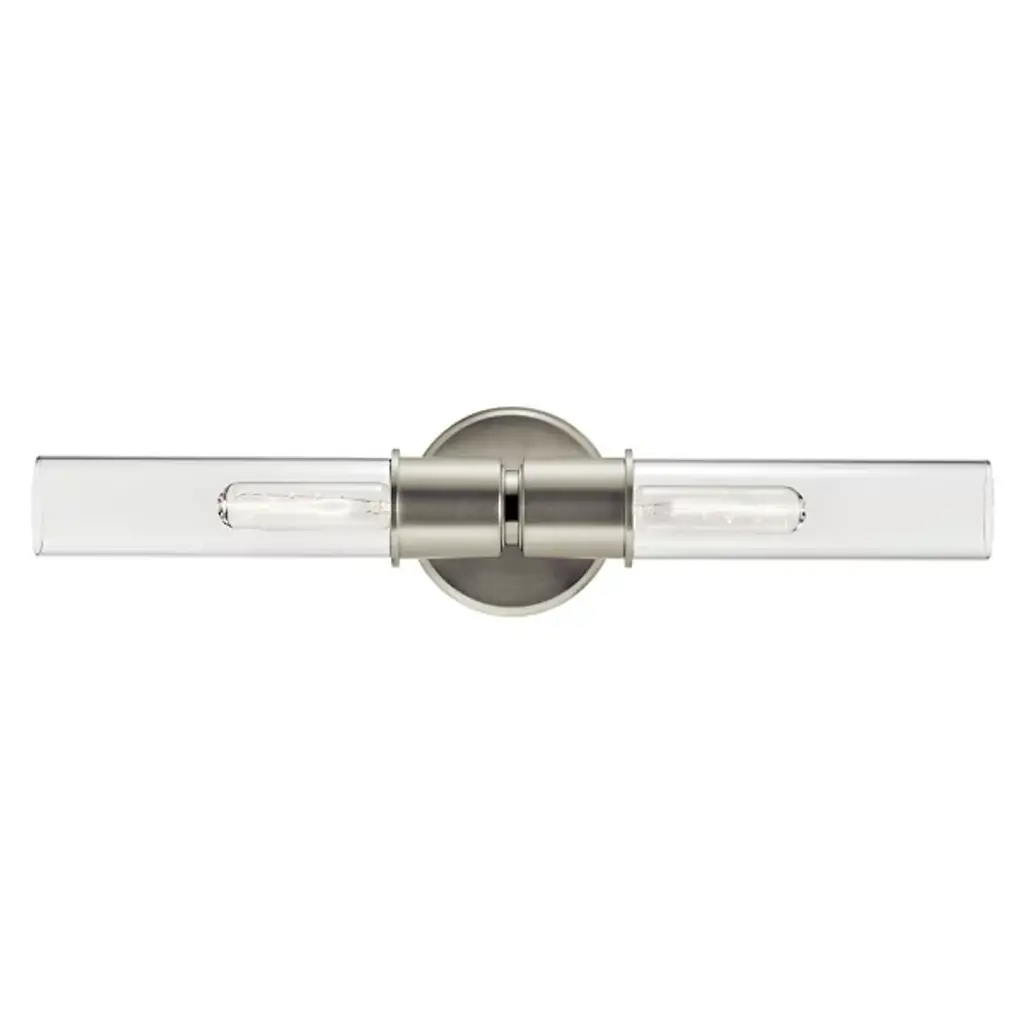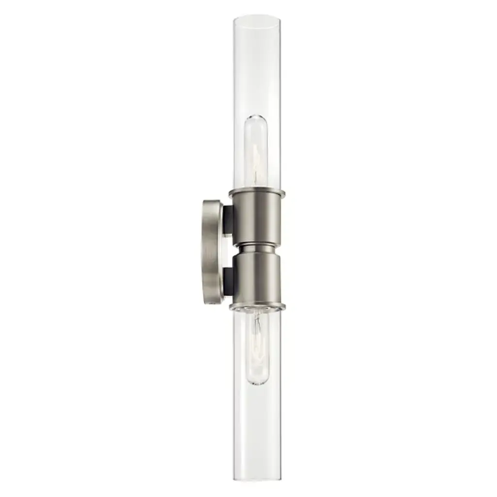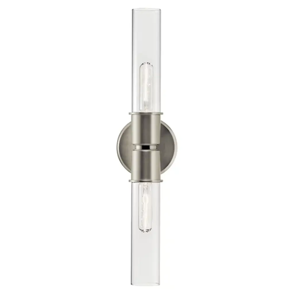 The Aviv 2 Light Wall Sconce from Kichler combines functionality with contemporary design. It is crafted from high-quality steel. Aviv features 2 cylindrically shaped glass shades, oriented to face opposite directions. This distinctive form allows for an intriguing display play of light, creating a captivating ambiance. Your wall sconce can be mounted either vertically or horizontally. Illuminate your surroundings with LEDs housed within each shade and adjust the brightness level using a separately sold ELV dimmer.
