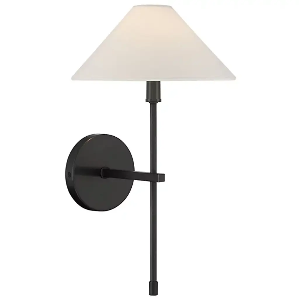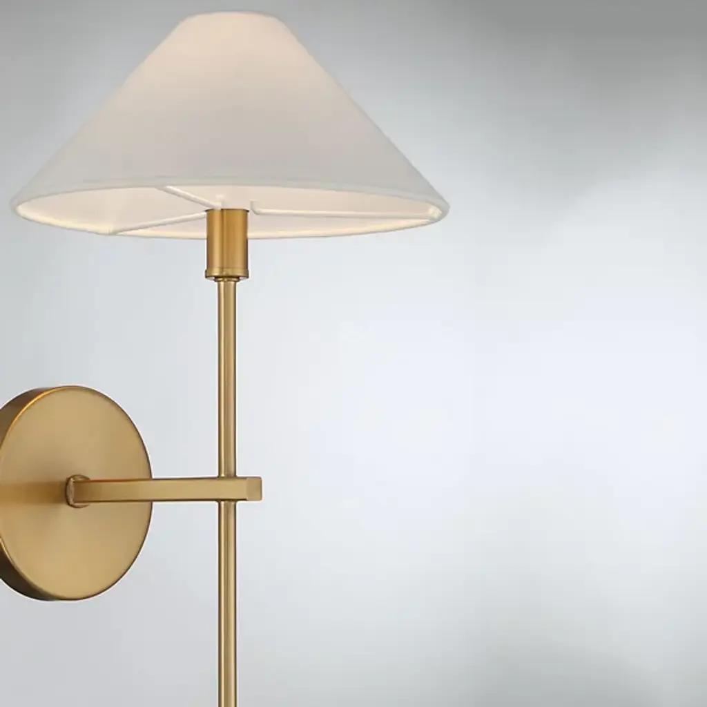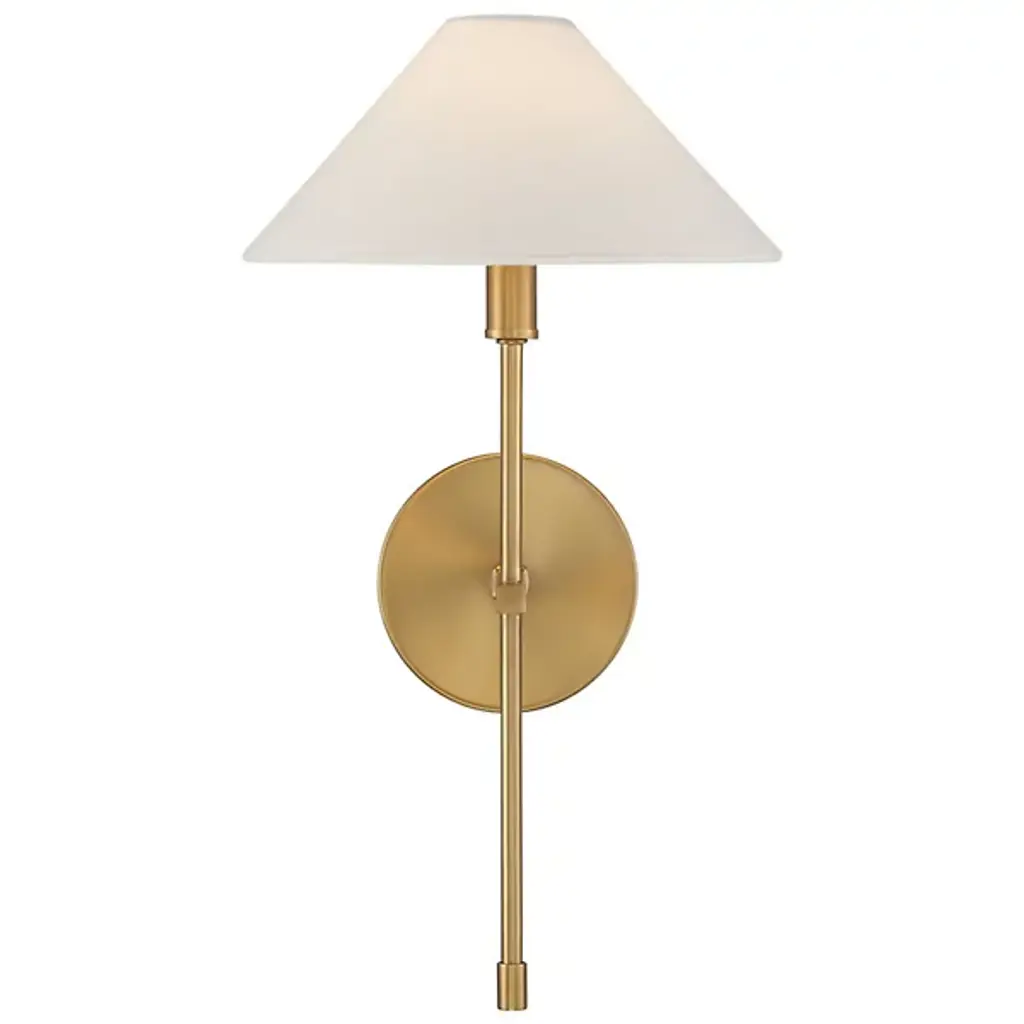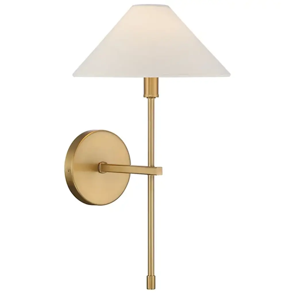 The Avon Wall Sconce from Savoy House showcases transitional style with its elegant and thoughtful design. It features a tapered white linen shade atop a slender structure emerging from a round backplate and finished in warm brass, adding brightness and warmth to any space. Its smooth, damp-rated construction is versatile and durable, making it a refined addition to any interior setting. Crafted from high-quality metal with a linen shade, it matches blends layered traditional design with modern elements simplicity.