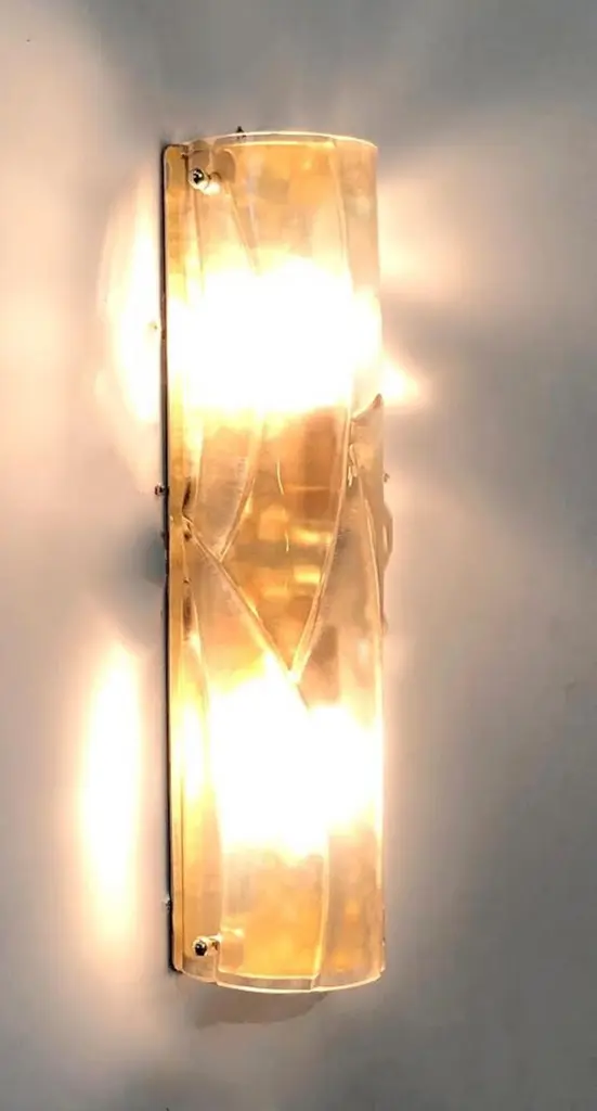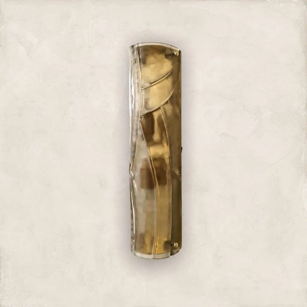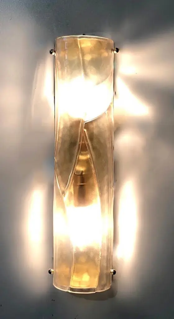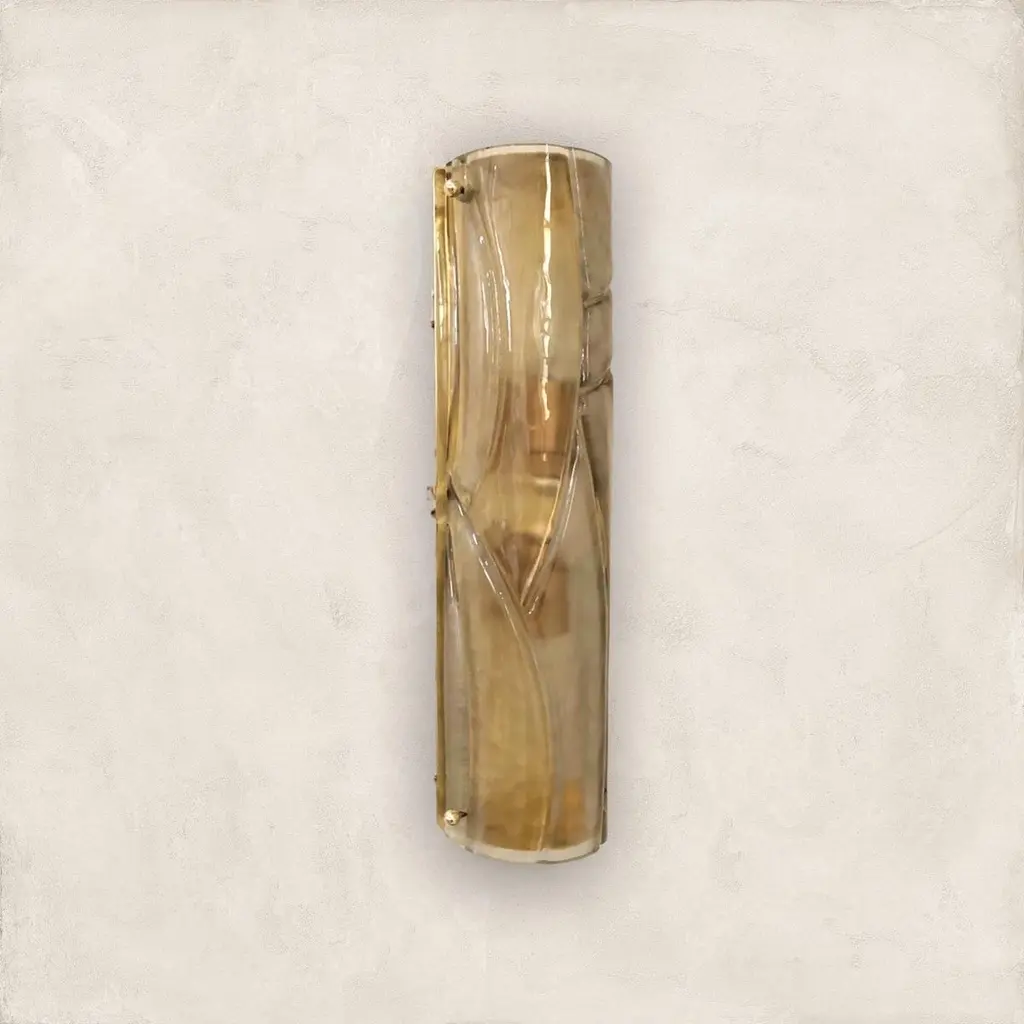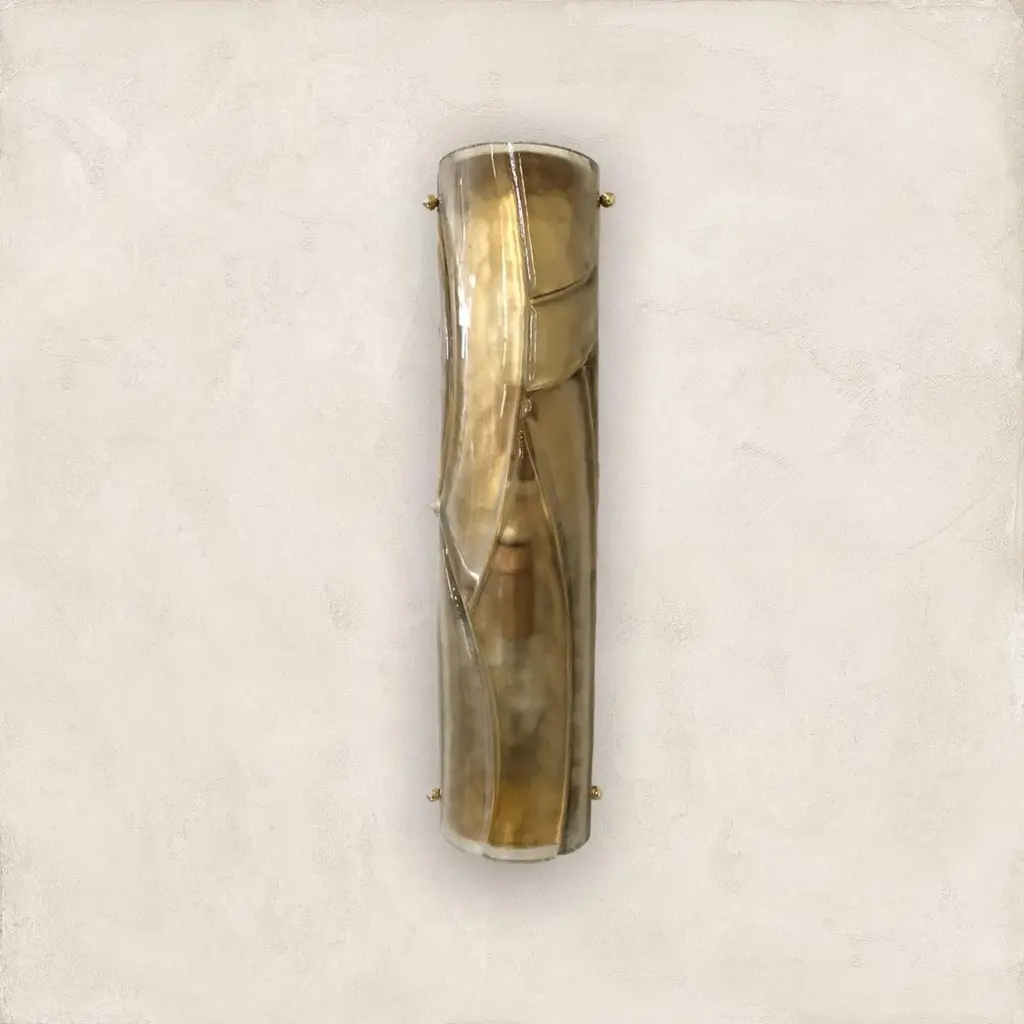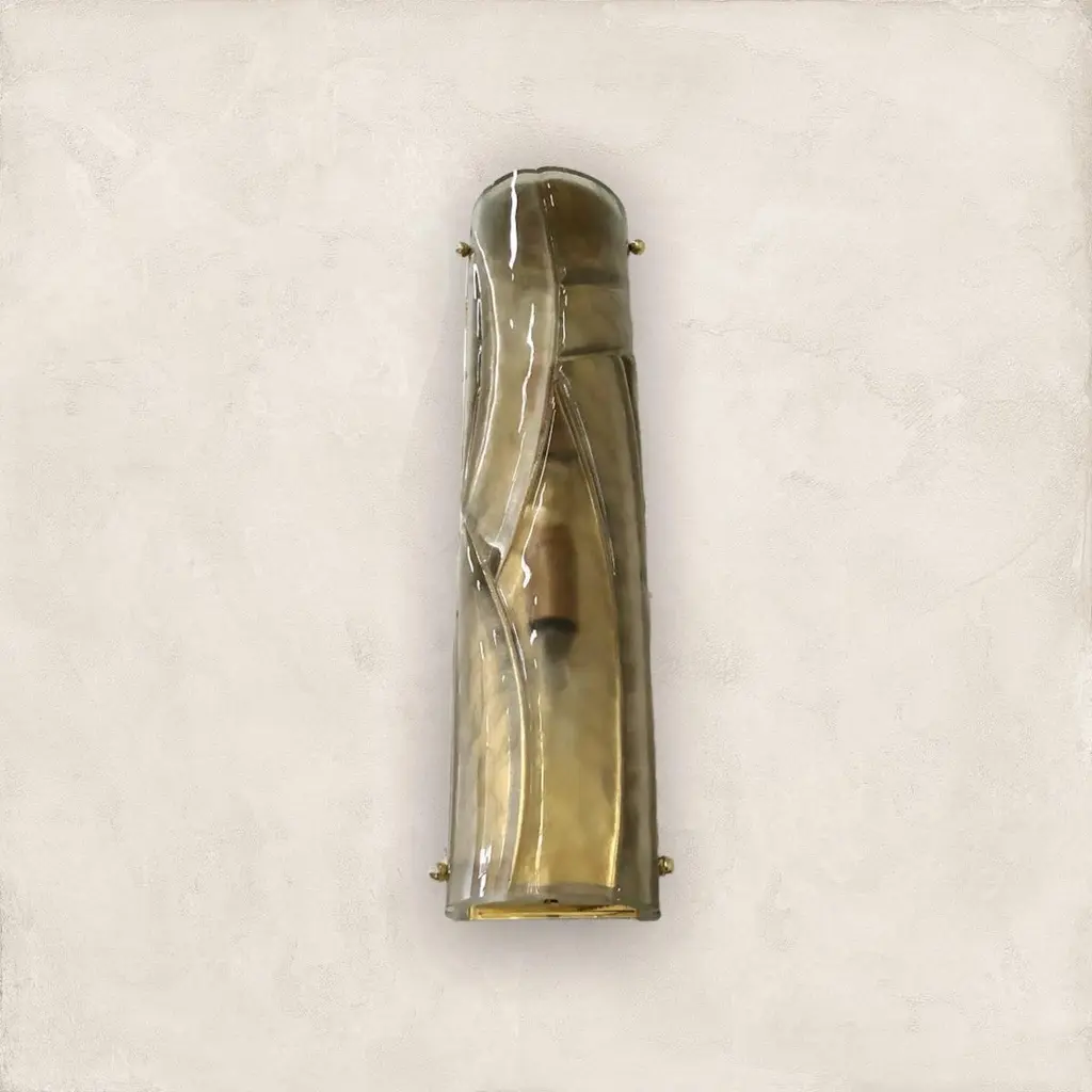 Italian modern wall light or flushmount shown in smoky Murano glass hand blown to create a stylish wrapped or enveloped design pattern, mounted on full brass backplate / Designed by Fabio Bergomi for Fabio Ltd / Made in Italy2 lights / E12 or E14 type / max 40W eachMeasures: height 16 inches / width 4 inches / depth 3 inches Order Only / This item ships from Italy.