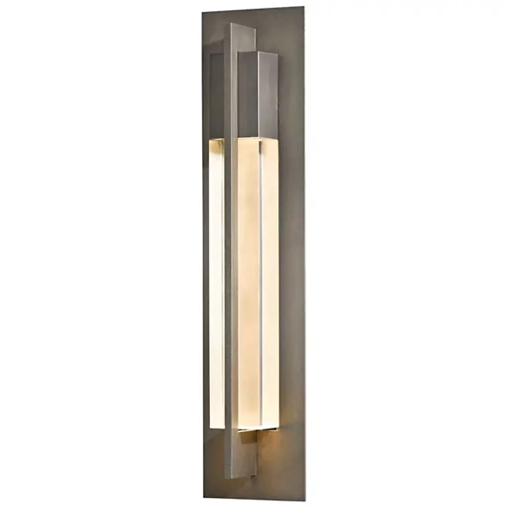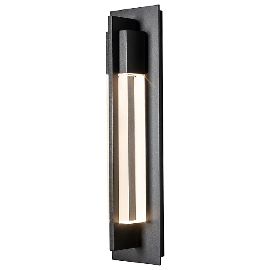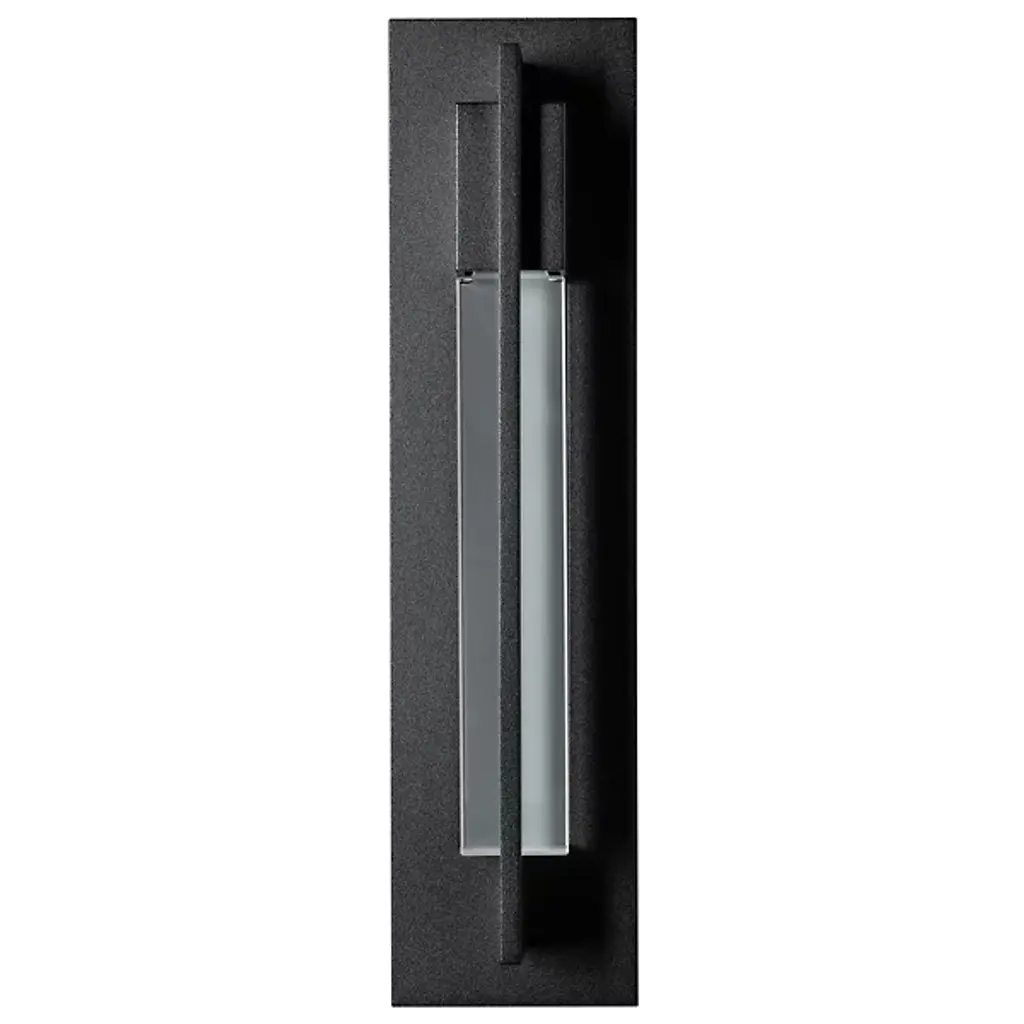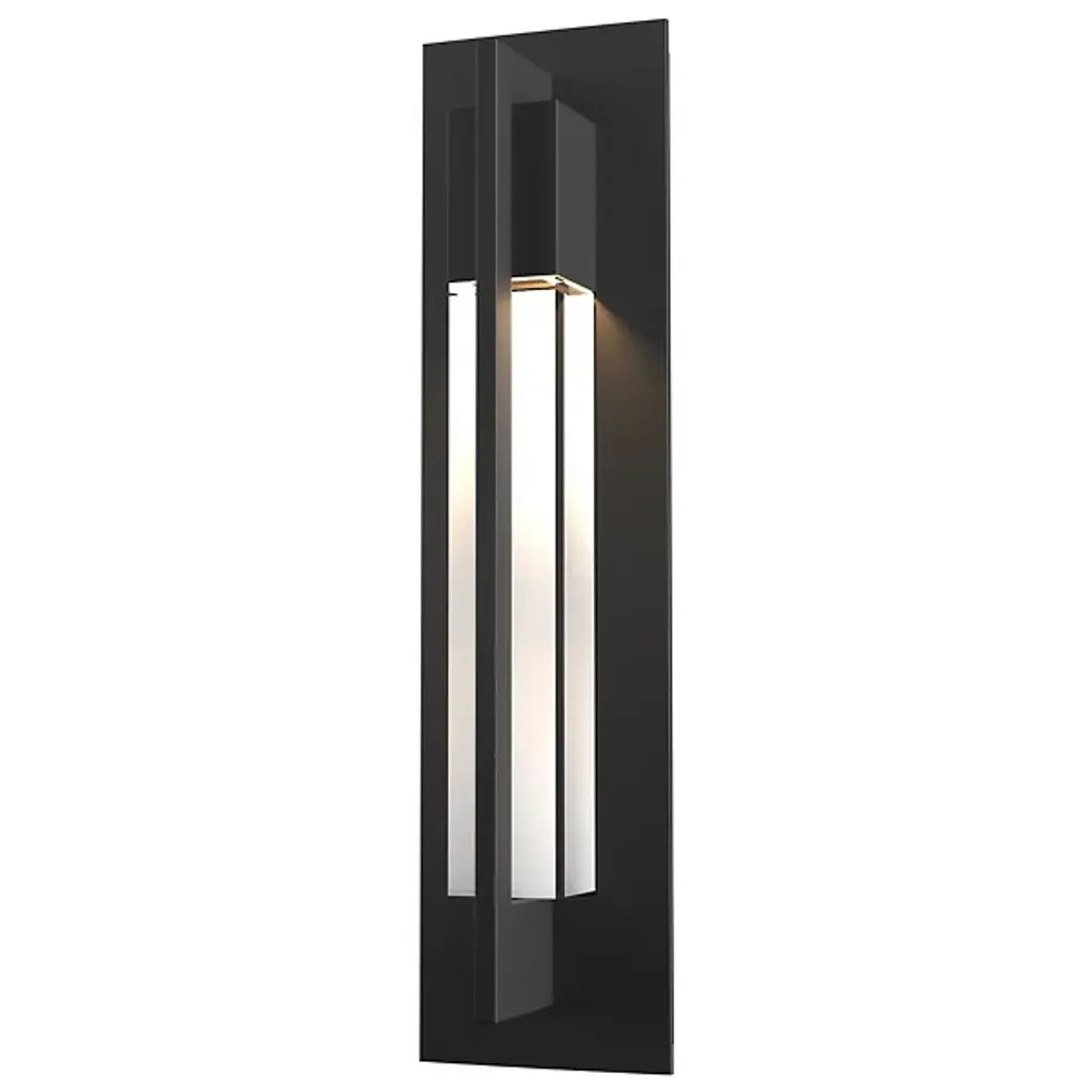 A clean, geometrical design in a contemporary style. The Axis Coastal Outdoor Wall Sconce by Hubbardton Forge features a rectangular structure made of marine-grade aluminum that is both durable and resistant to harsh weather elements. Its rectangular glass shade is nestled within a handcrafted, linearly placed aluminum arm to create a bisected look. Mounted onto the wall with a rectangular backplate, this fixture delivers a warm, welcoming glow to illuminate exterior spaces of your home like doorways, patios, balconies, and porches.