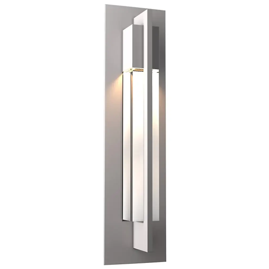 A clean, geometrical design in a contemporary style. The Axis Coastal Outdoor Wall Sconce by Hubbardton Forge features a rectangular structure made of marine-grade aluminum that is both durable and resistant to harsh weather elements. Its rectangular glass shade is nestled within a handcrafted, linearly placed aluminum arm to create a bisected look. Mounted onto the wall with a rectangular backplate, this fixture delivers a warm, welcoming glow to illuminate exterior spaces of your home like doorways, patios, balconies, and porches.