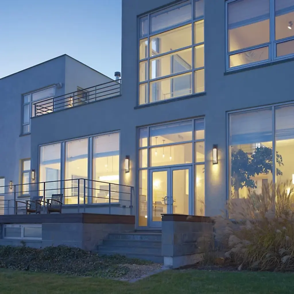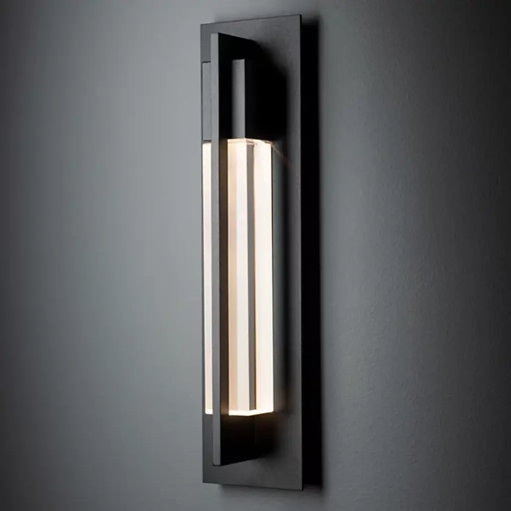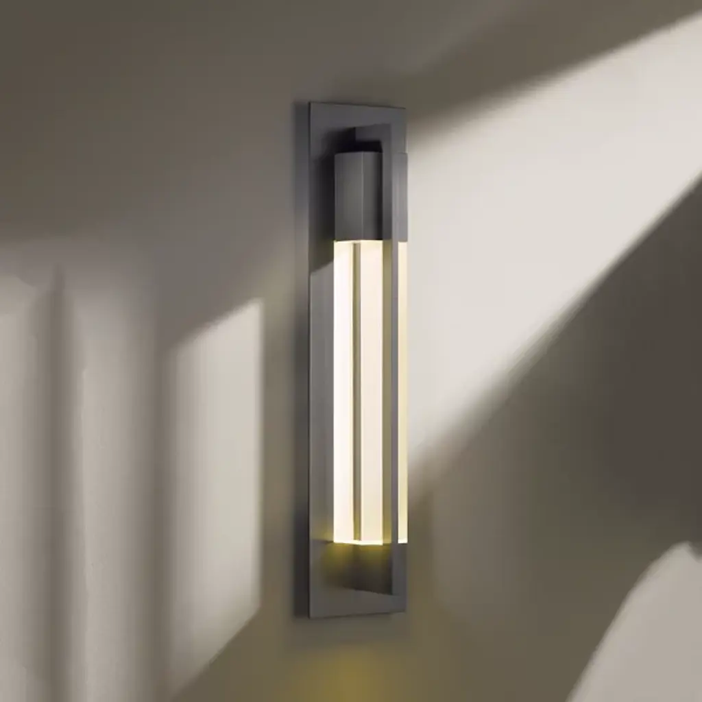 A clean, geometrical design in a contemporary style. The Axis Coastal Outdoor Wall Sconce by Hubbardton Forge features a rectangular structure made of marine-grade aluminum that is both durable and resistant to harsh weather elements. Its rectangular glass shade is nestled within a handcrafted, linearly placed aluminum arm to create a bisected look. Mounted onto the wall with a rectangular backplate, this fixture delivers a warm, welcoming glow to illuminate exterior spaces of your home like doorways, patios, balconies, and porches.