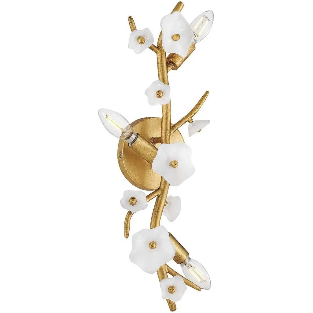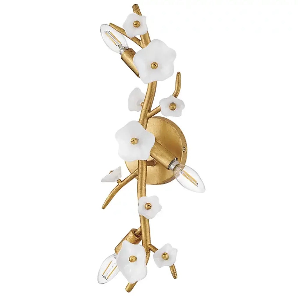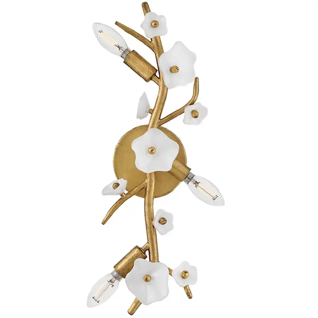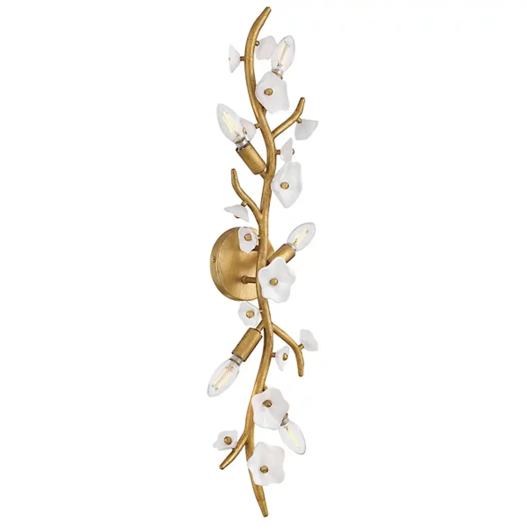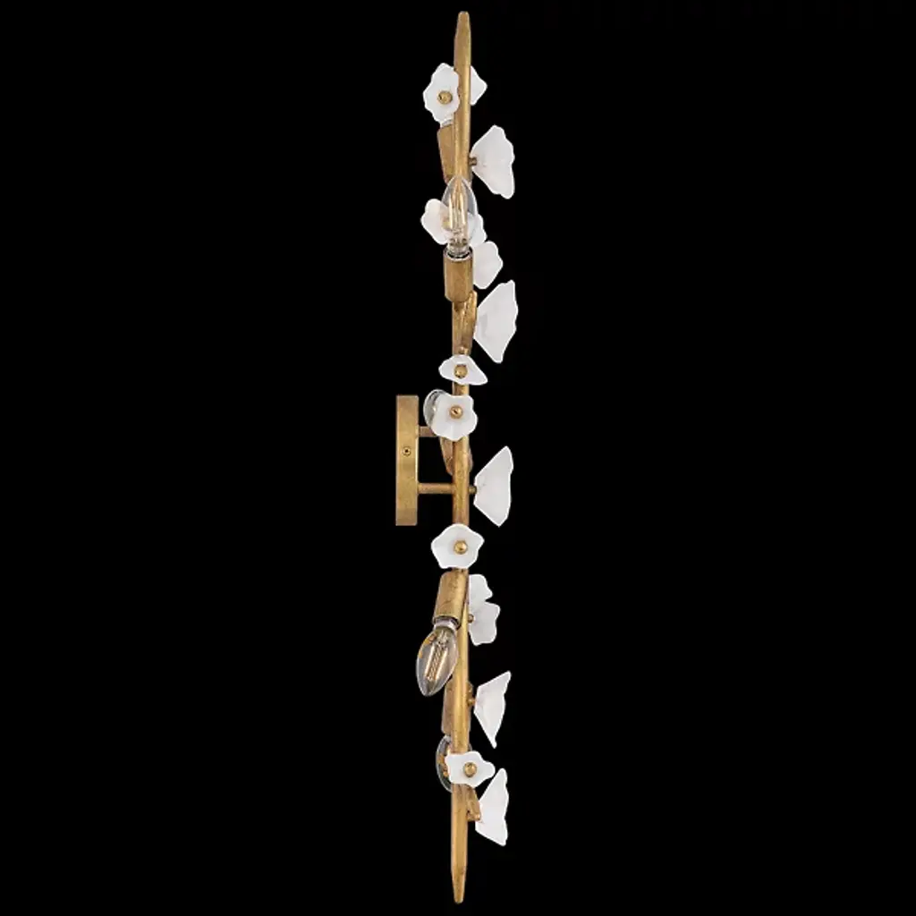 The Azalea Wall Sconce from Fredrick Ramond captures springtime's ephemeral beauty. Double-layered glass flowers bloom along the linear frame, combining clear and painted surfaces for dimensional depth. Each blossom catches and reflects light differently, while dimmable bulbs allow for varied moods. The frame's distressed metal provides an organic foundation for the glass garden. This sconce turns a simple wall into an ever-changing display of light and shadow that shifts throughout the day.