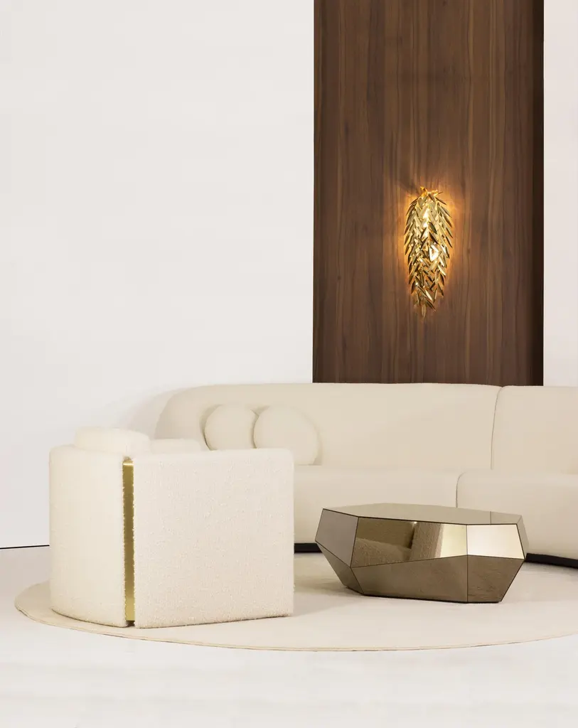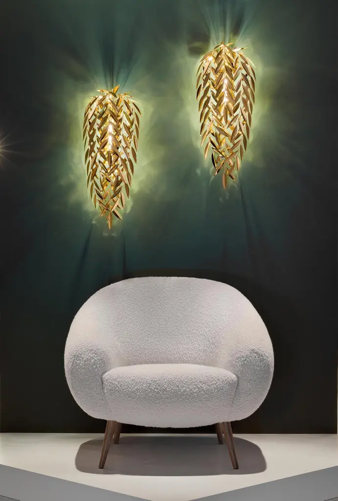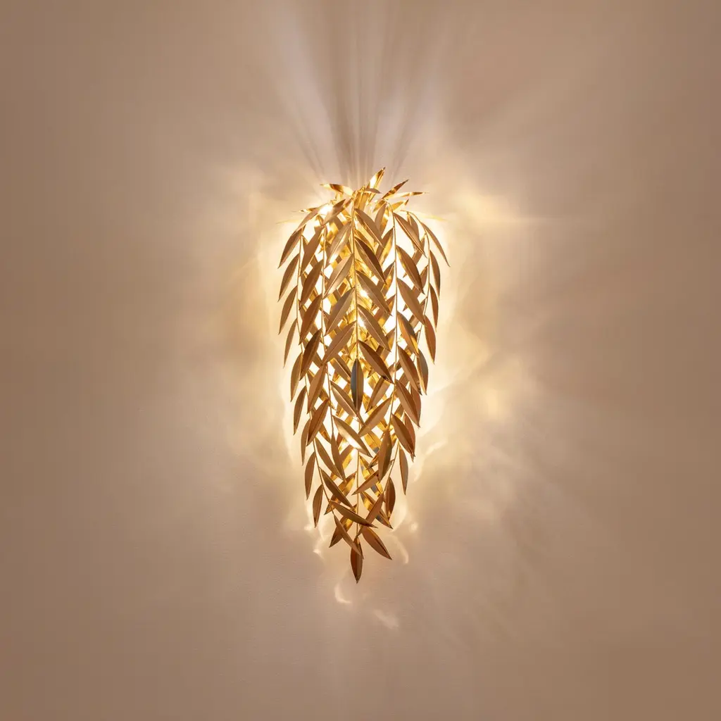 Best Lighting design at the iLuxury Awards 2021Resulting from a trip S. Miguel, the Azores wall lamp recreates a weeping willow found near a lagoon and freezes a moment of contemplation.Born in the middle of the Atlantic Ocean, the archipelago of the Azores was formed by volcanic activity and belongs to the Portuguese territory. S. Miguel, the most exuberant of its islands, is a paradise covered in dense nature with hundreds of plant species that exhibit their different shades of green along the landscapes.The Azores wall lamp is a luxuriant lighting piece made with handcrafted brass leaves that subtly allow the rays of light to pierce them and illuminate the surroundings as a gift of nature.Product detailsHandcrafted in polished brass with gold bath finish.Product optionsPolished nickel finish.Weight2Kg 4.5 lbs Electrical CharacteristicsMains: 3 Wires connection - Live ; Neutral ; EarthFrequency: 50 to 60HzLamp: G4 LED; 3 x 8W max.USAVoltage: 110-130VACEUROPEVoltage: 220-240VACMade to order.Designed by Joana Santos Barbosa for InsidherLand, 2019. Handmade in Portugal.